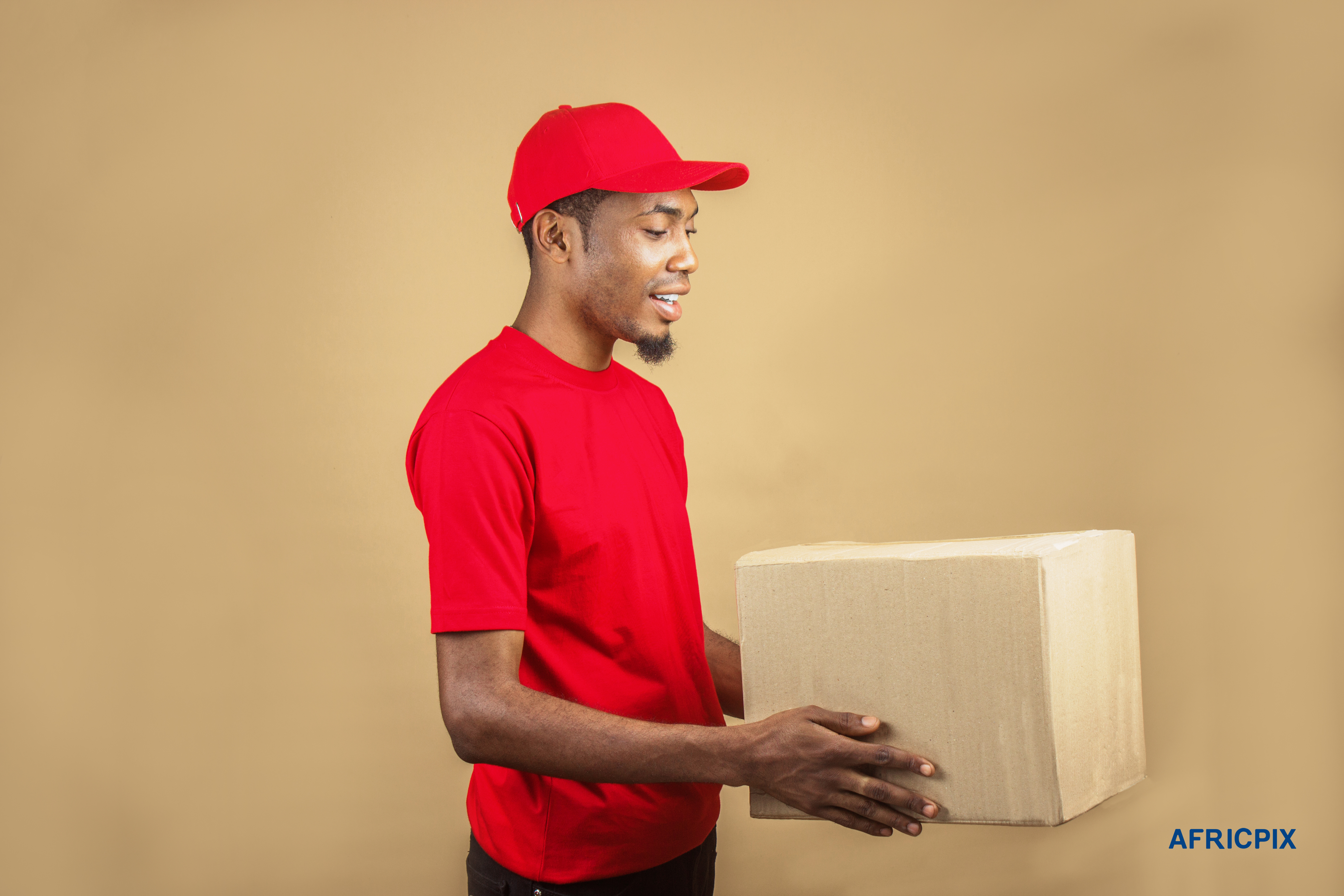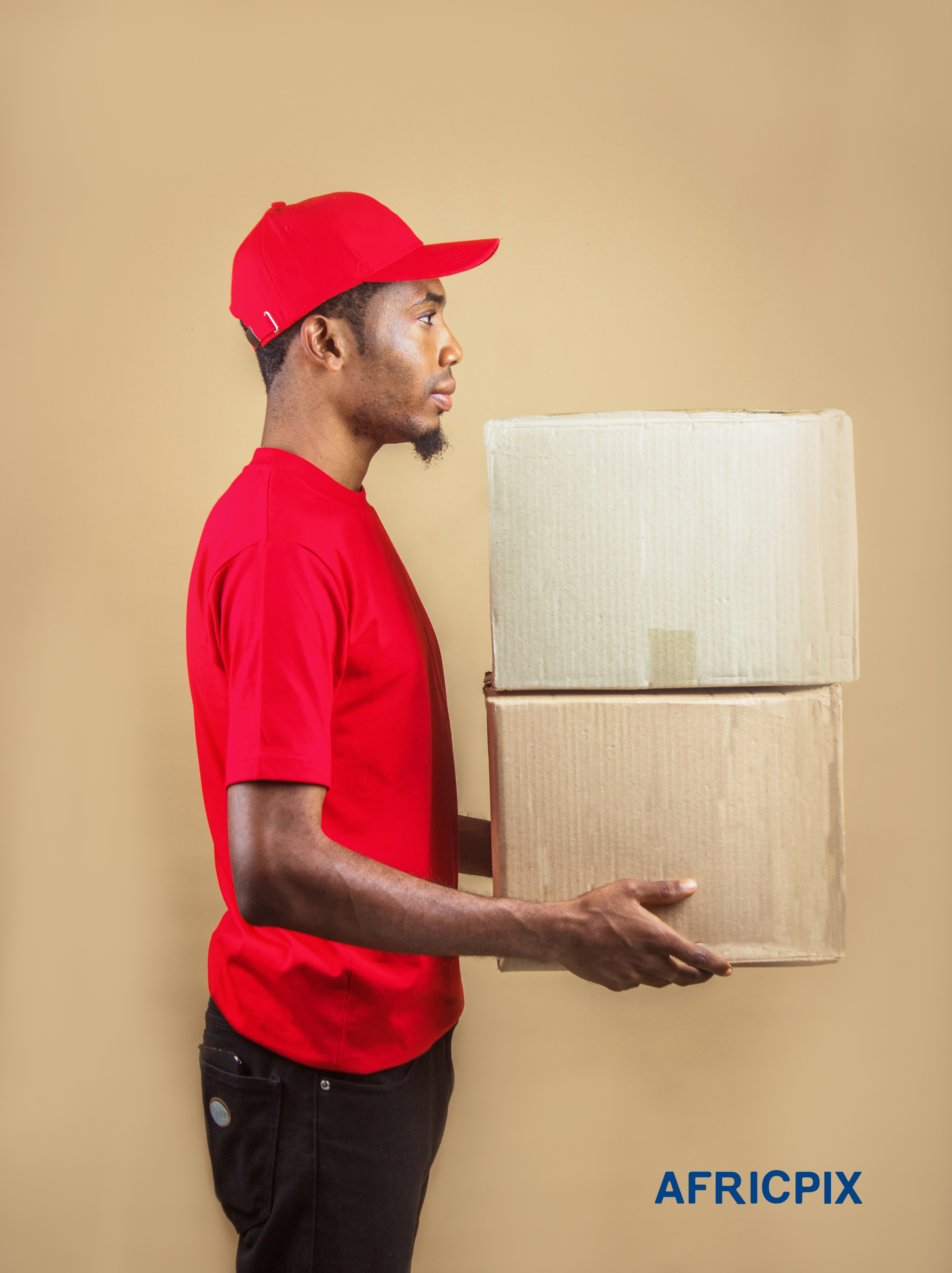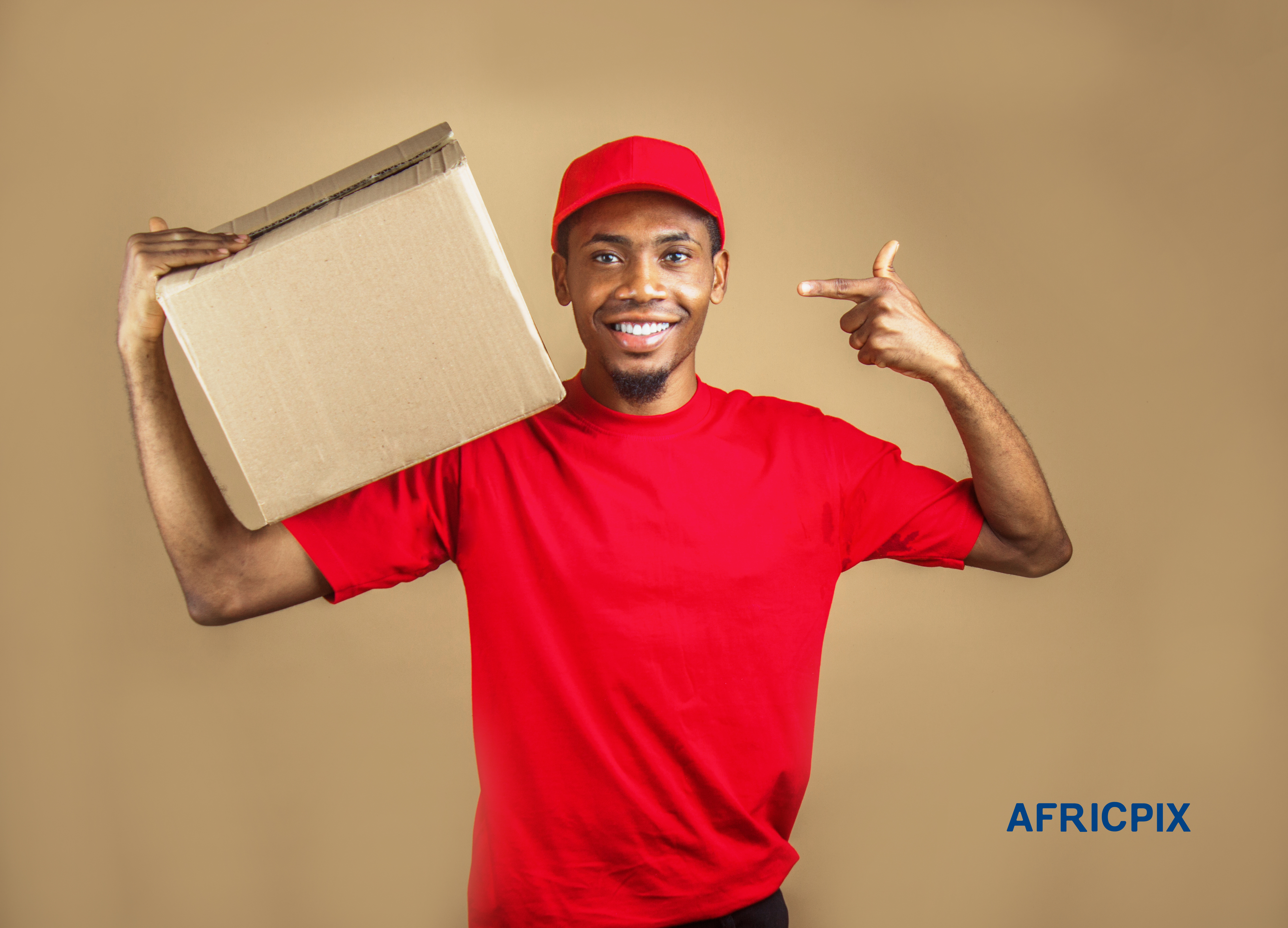 African Delivery Man Holding Package on Shoulder and Pointing at It with Other Hand