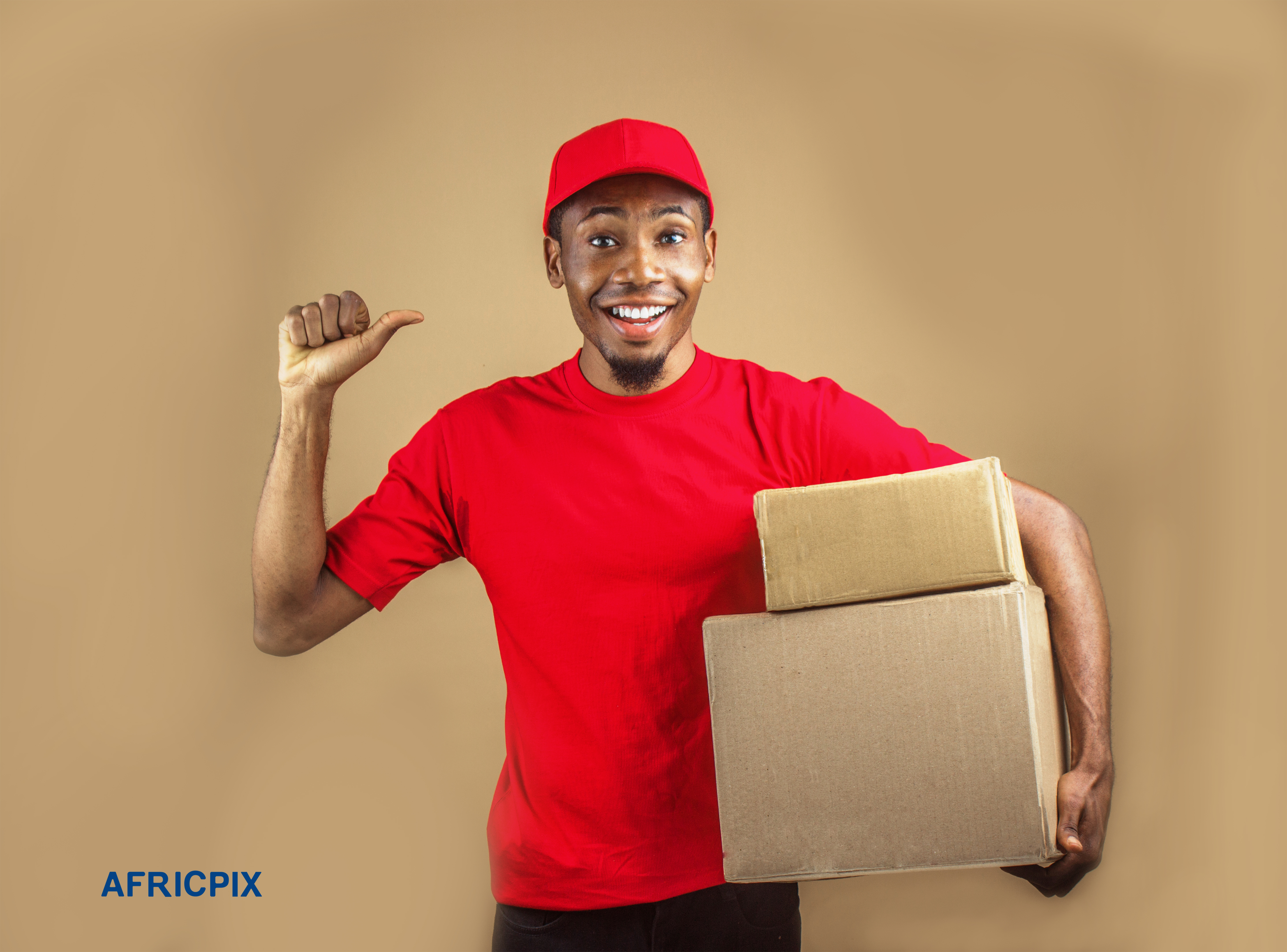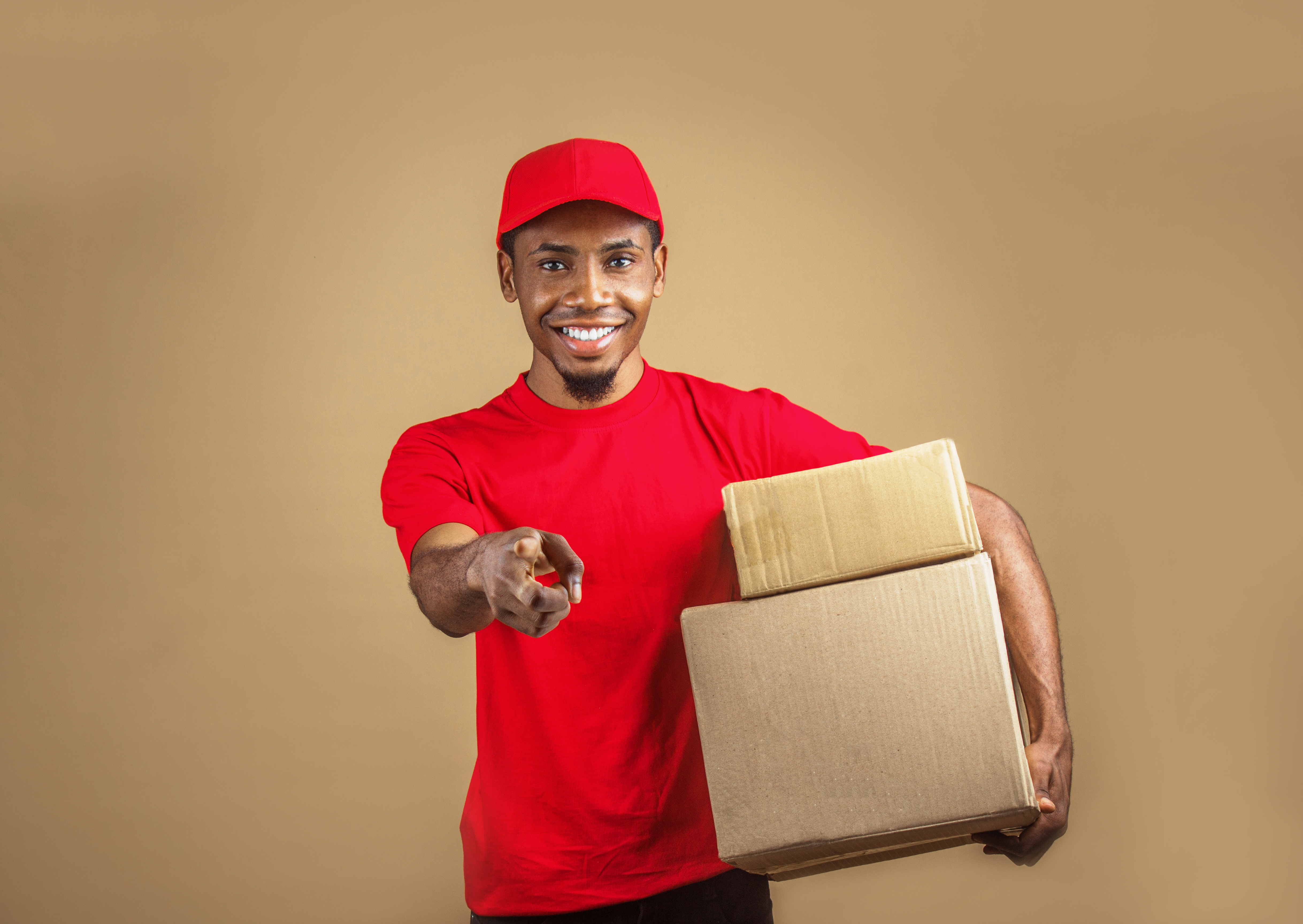 African Delivery Man Holding Two Packages and Pointing Forward.jpg