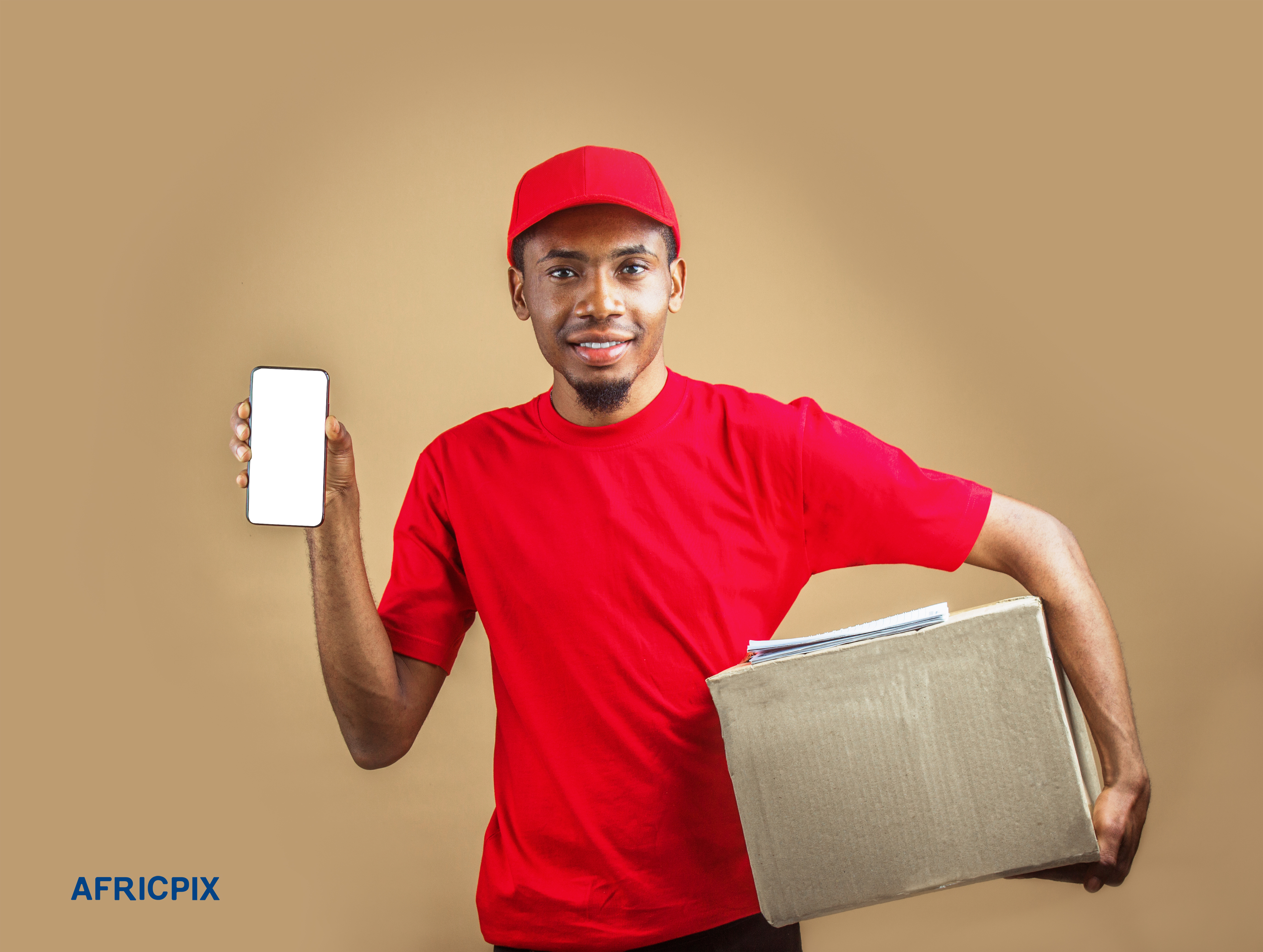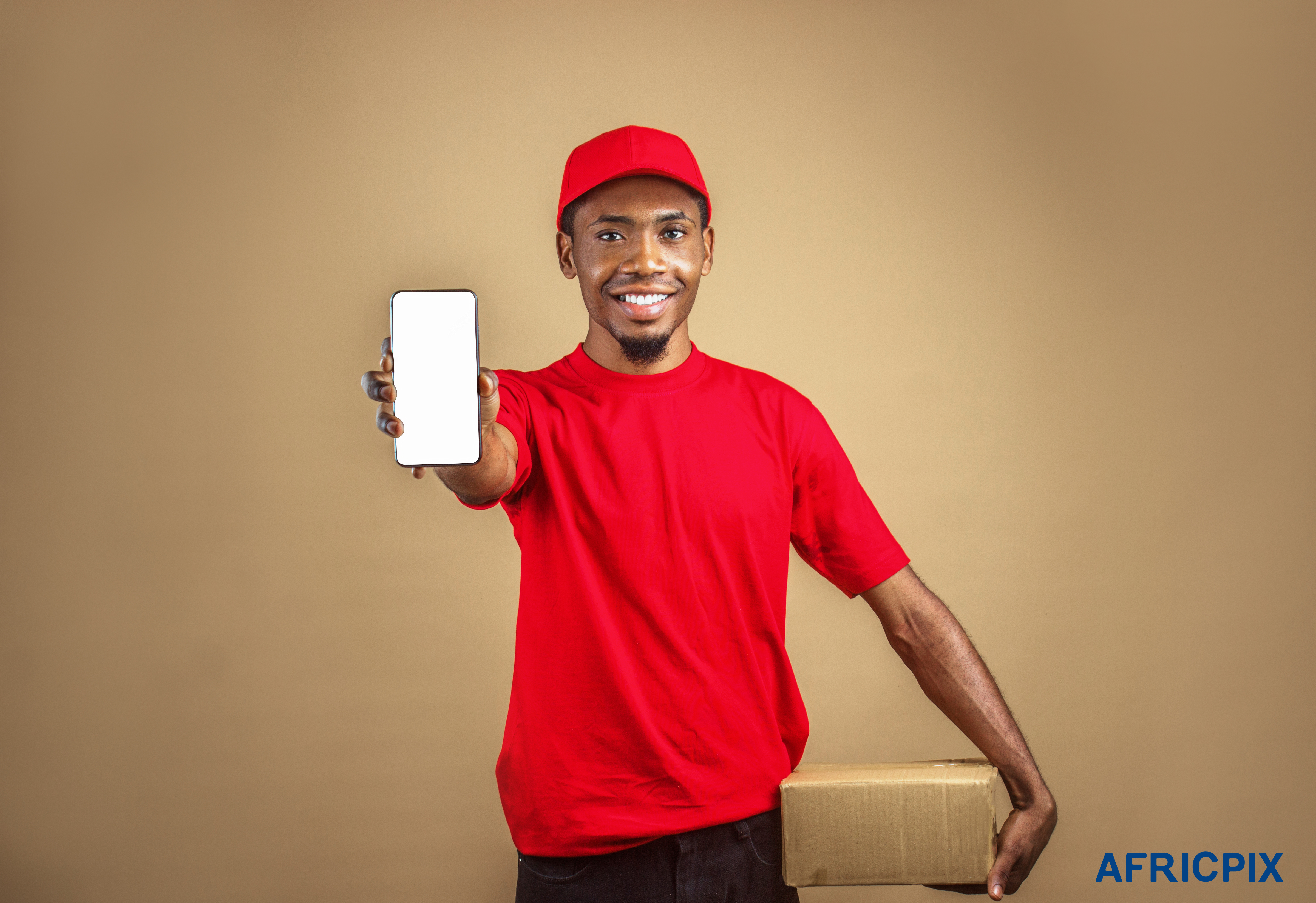 African Delivery Man Holding a Package in One Hand and holding phone forward