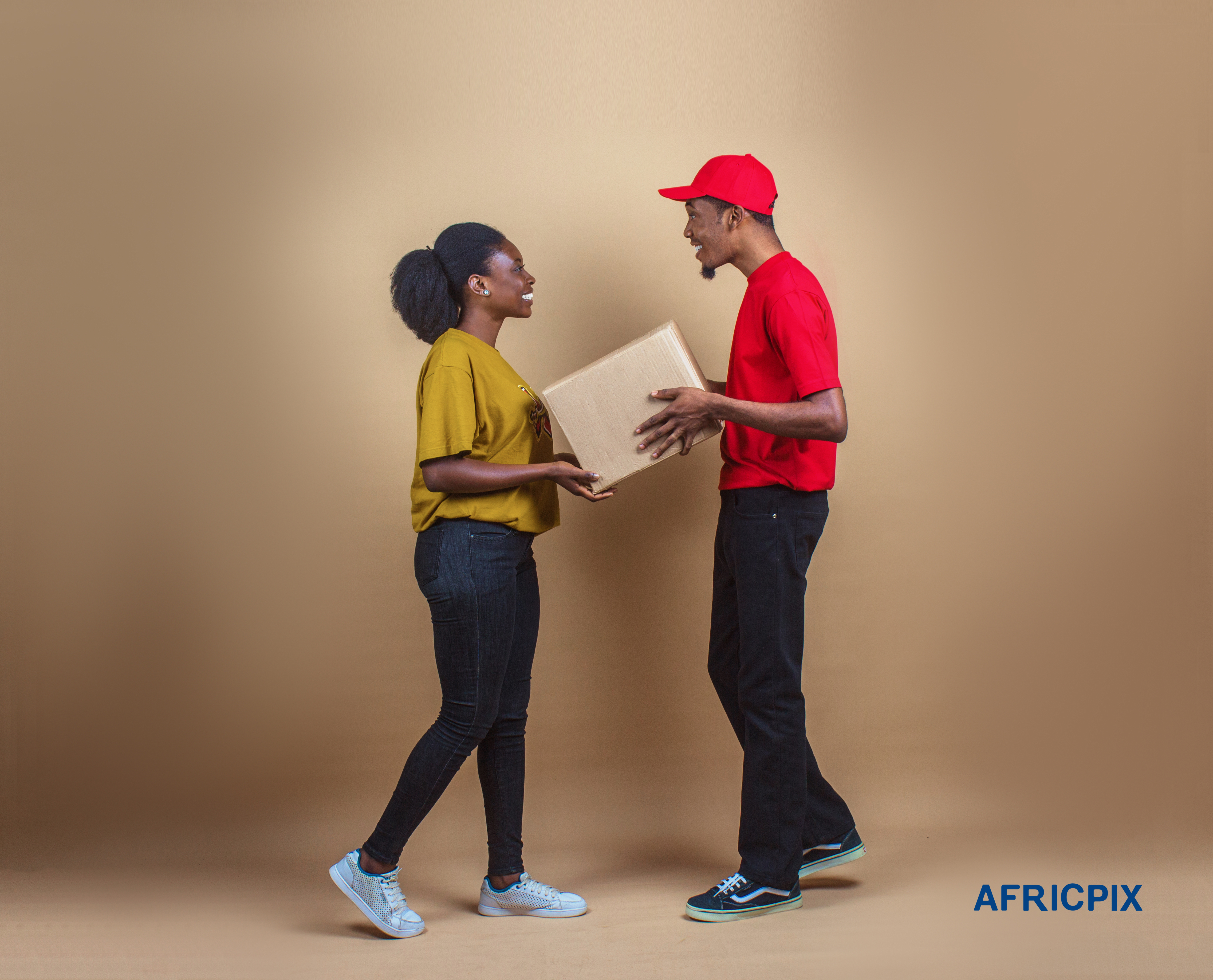 African Man Handing Delivery Package to Smiling Woman.jpg