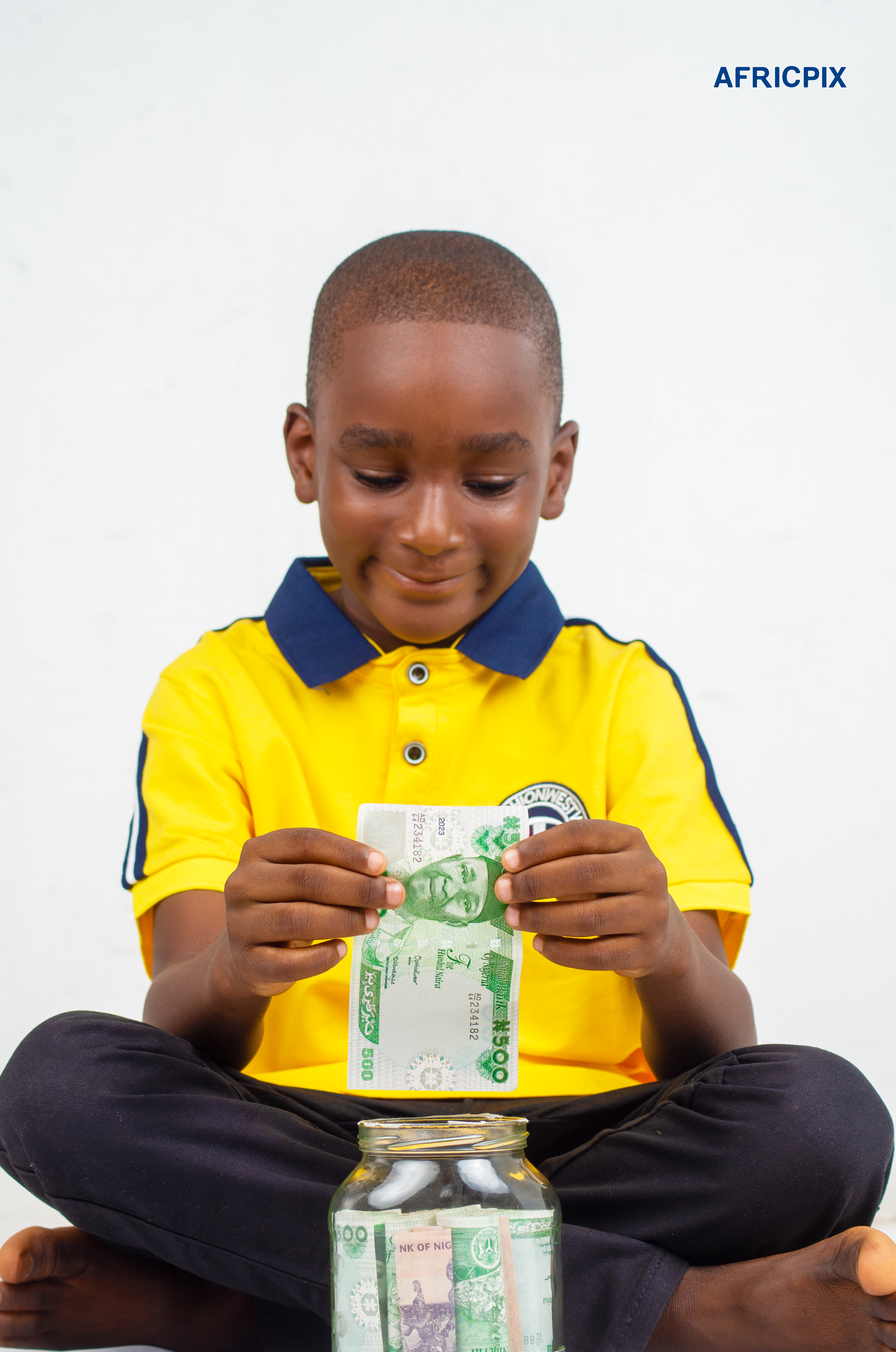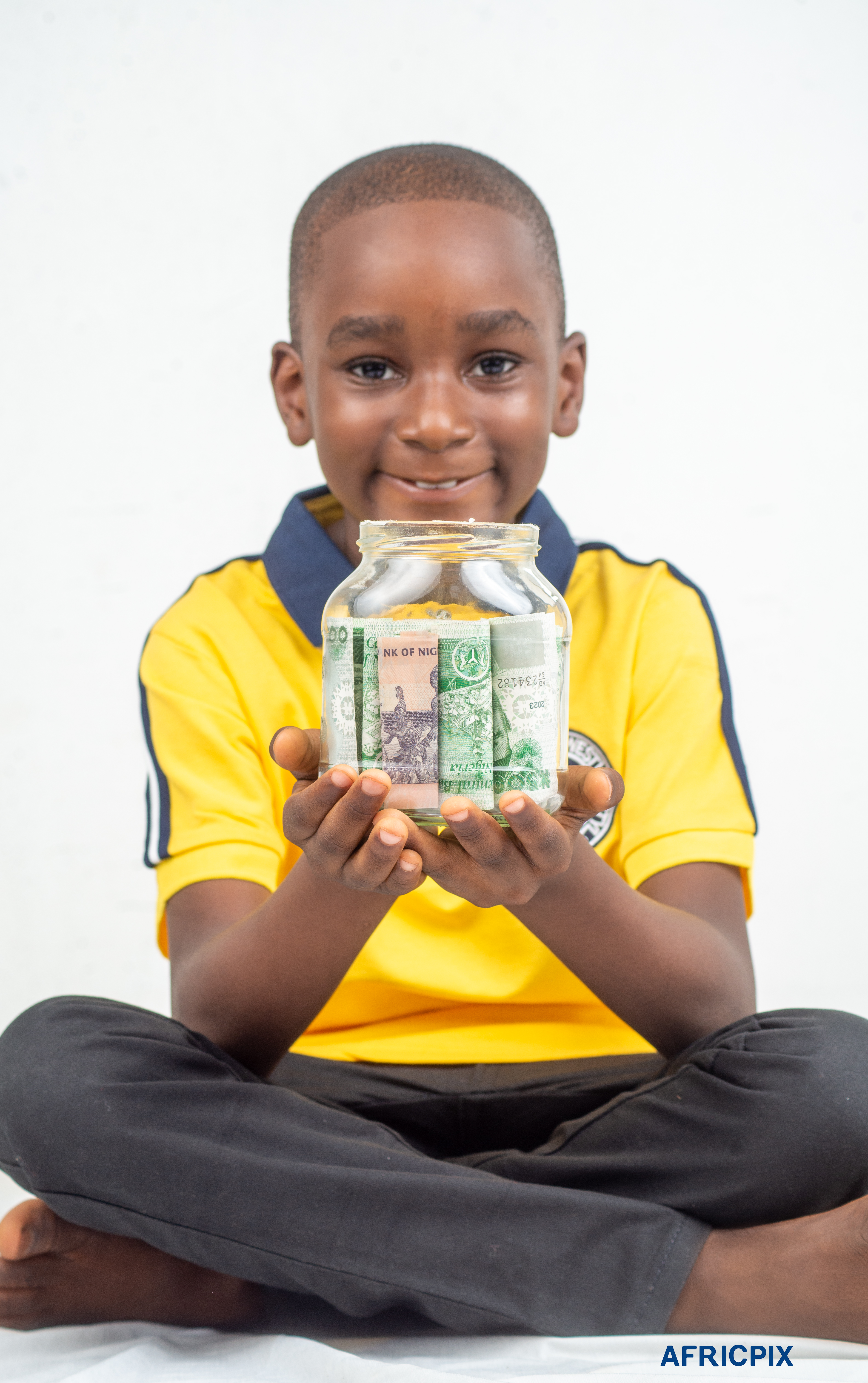 Nigeria Boy Child Sitting Down Holding Naira In Jar