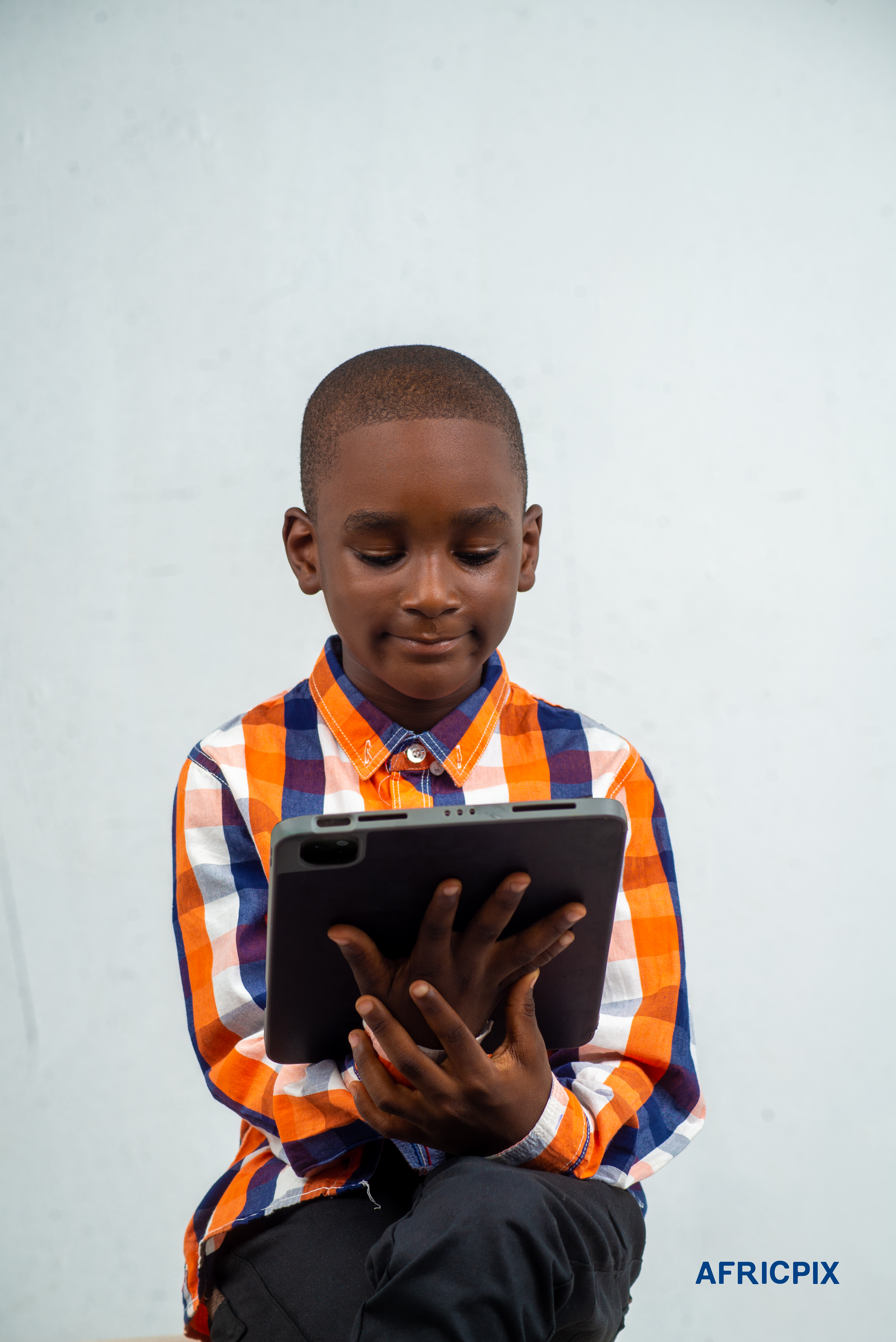 Nigeria Child Boy Sitting Smiling Looking Tablet Ipad