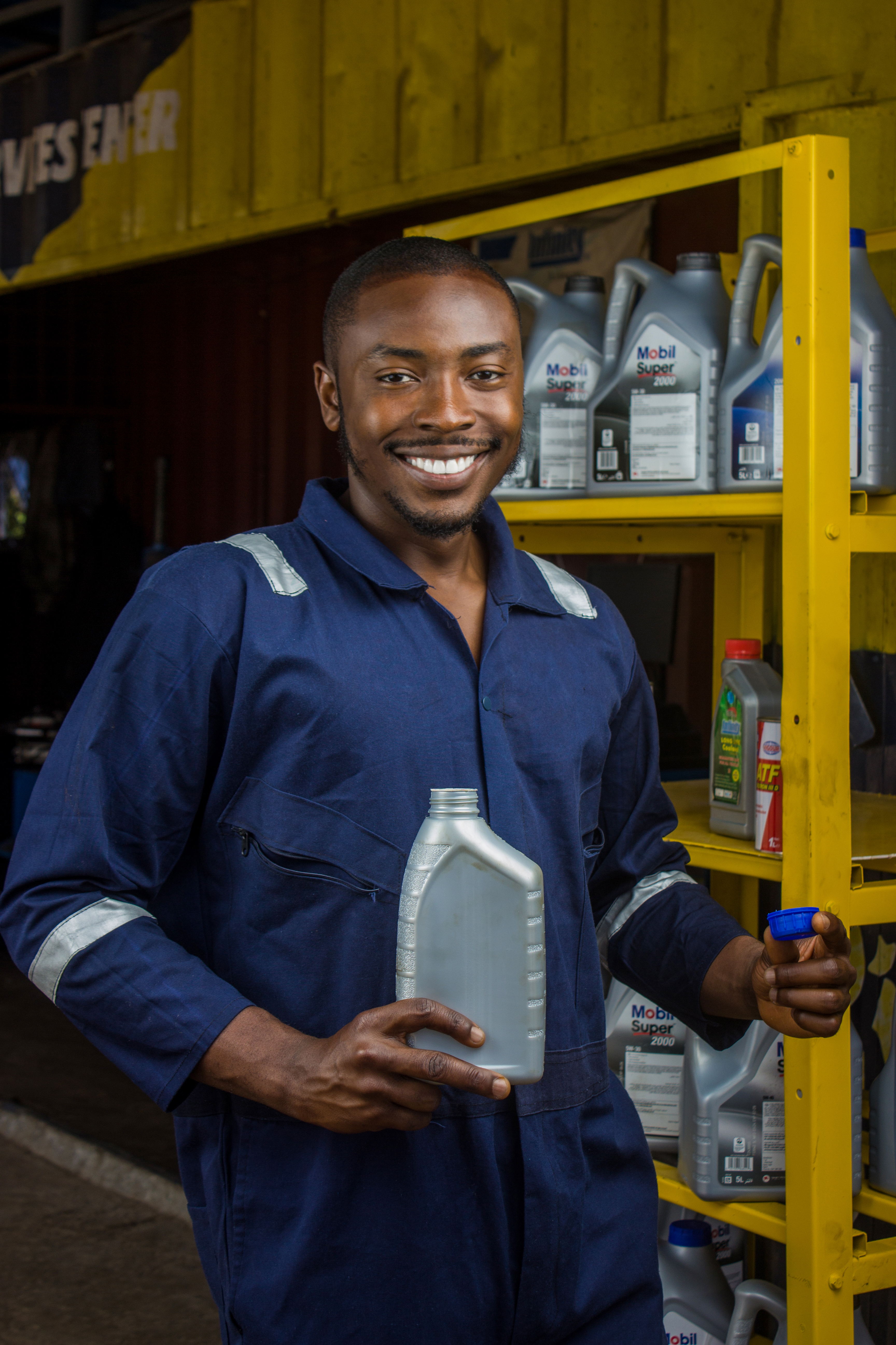 Happy African Mechanic Holding a Container and Its Lid.jpg