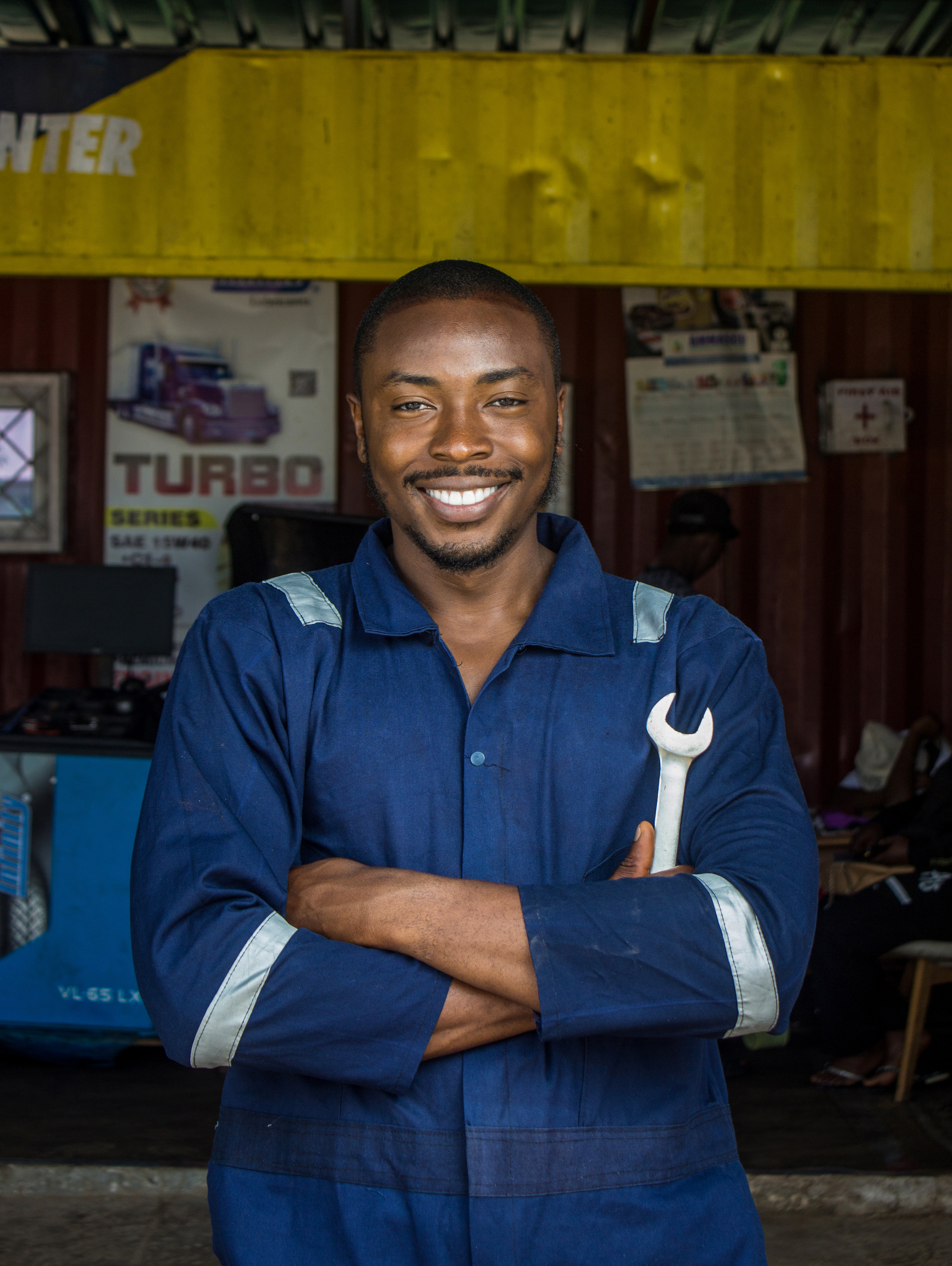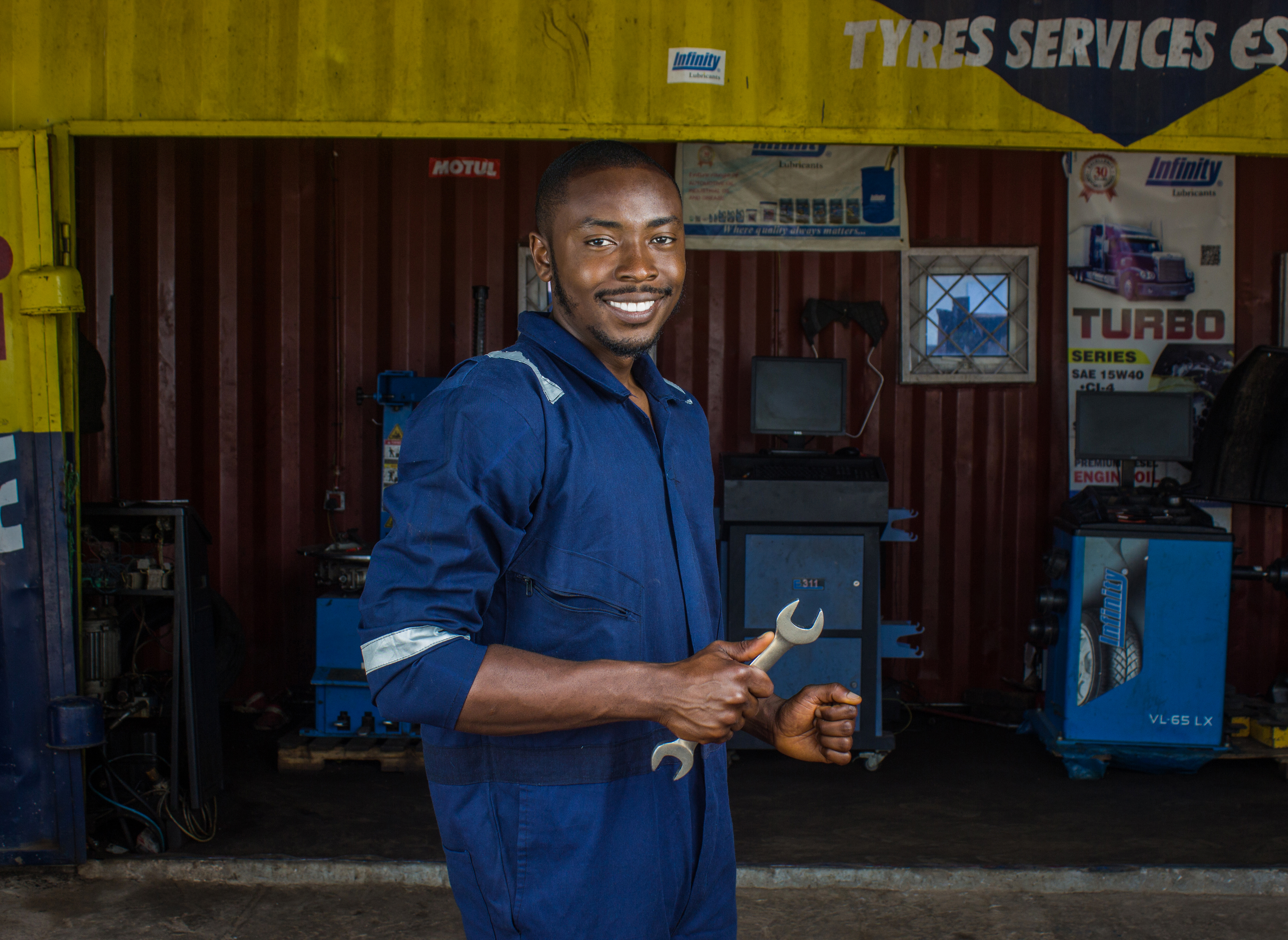 Smiling African Mechanic Holding Spanner in Front of His Shop 2.jpg