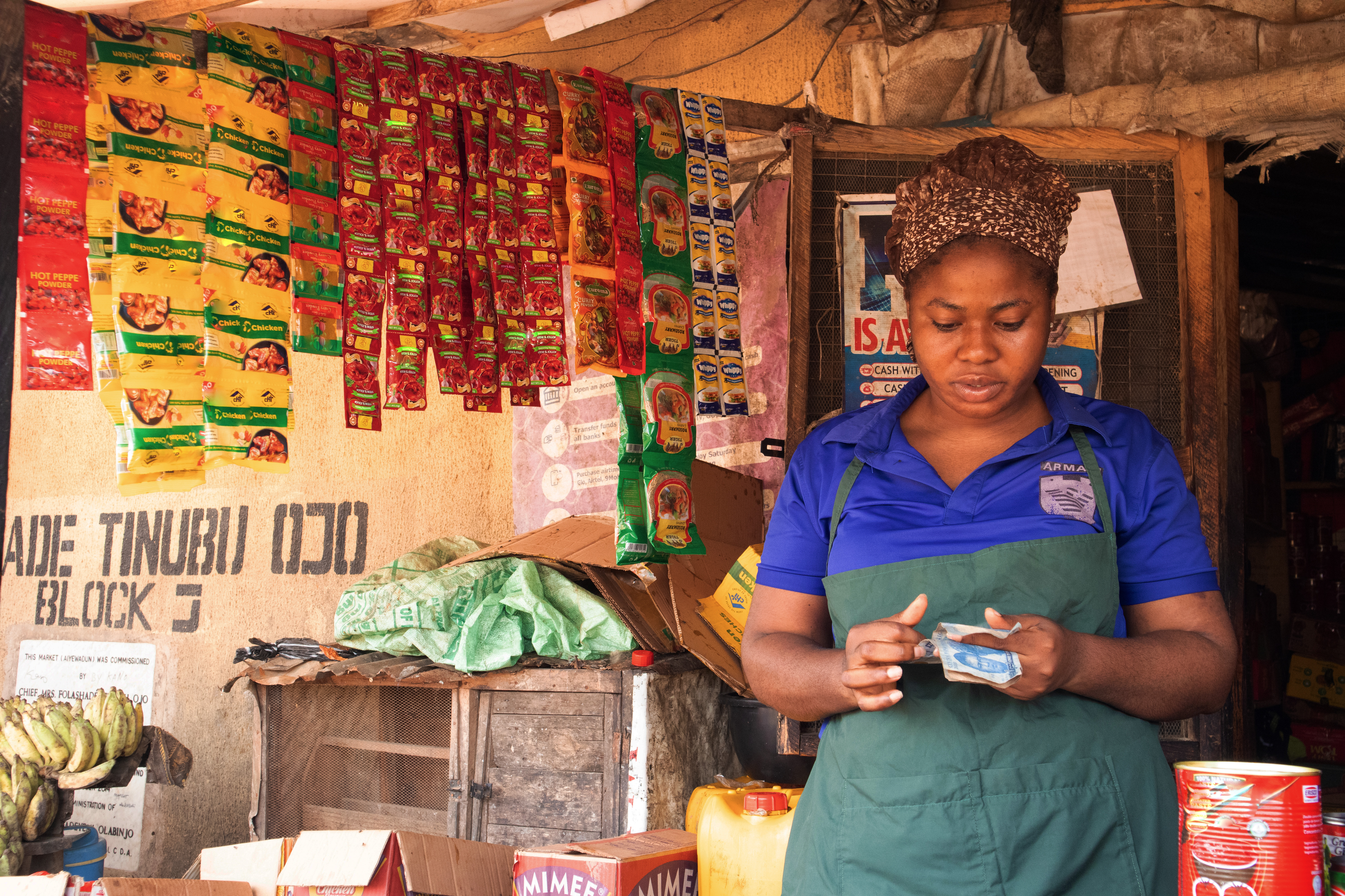 African Market Woman Counting Cash in Front of Her Shop