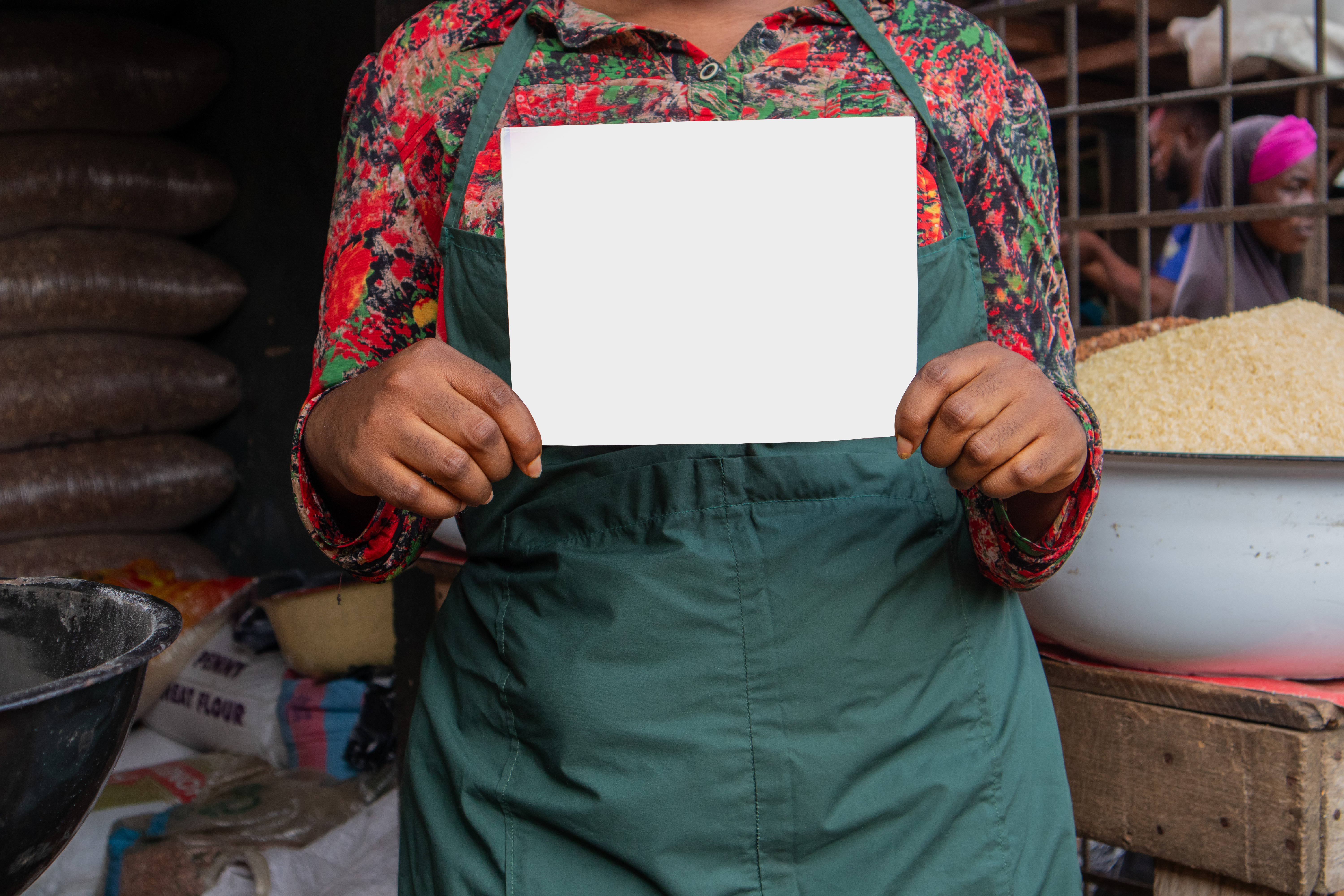 African Market Woman Holding a Placard in a Traditional Marketplace