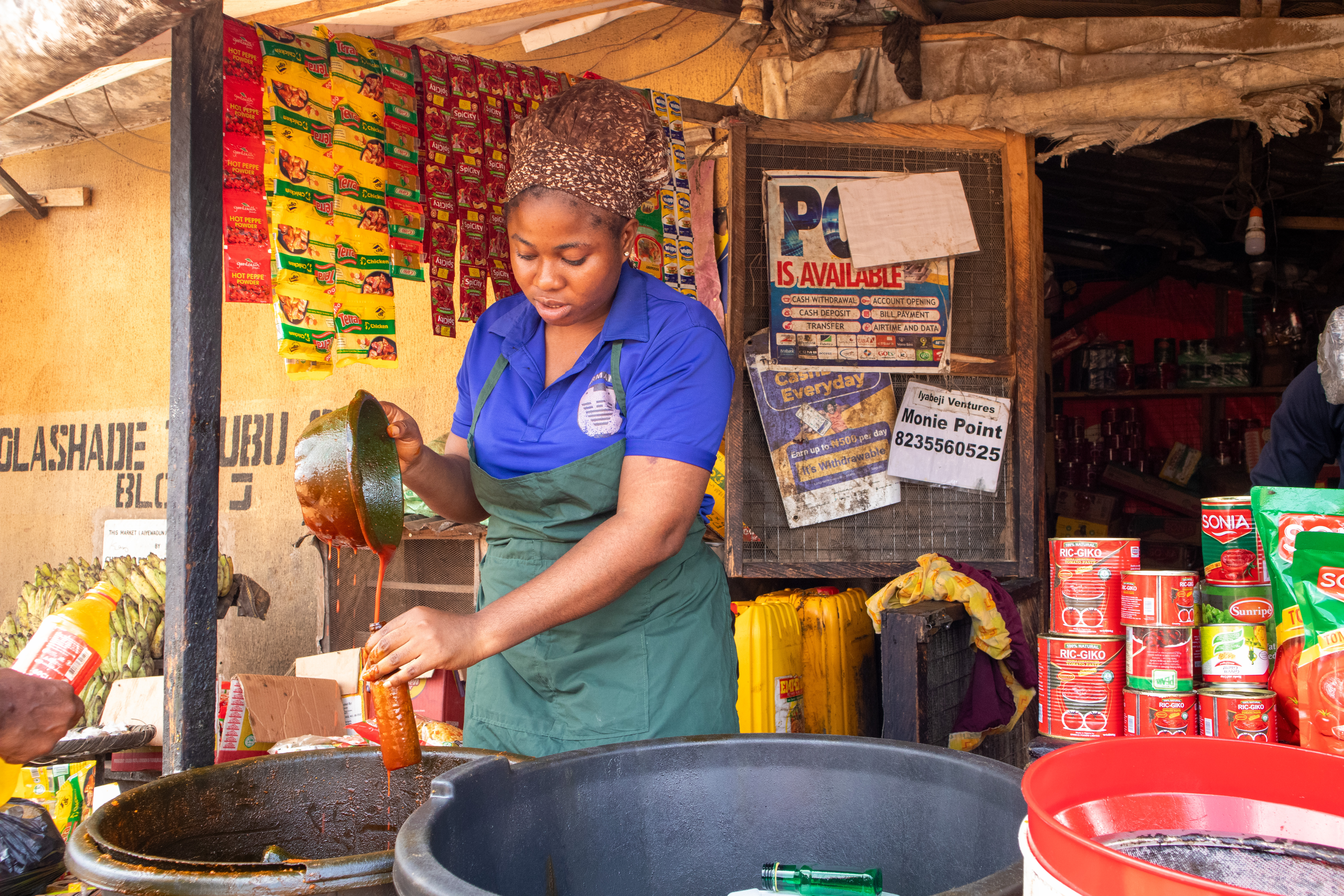 African Market Woman Pouring Palm Oil into a Bottle