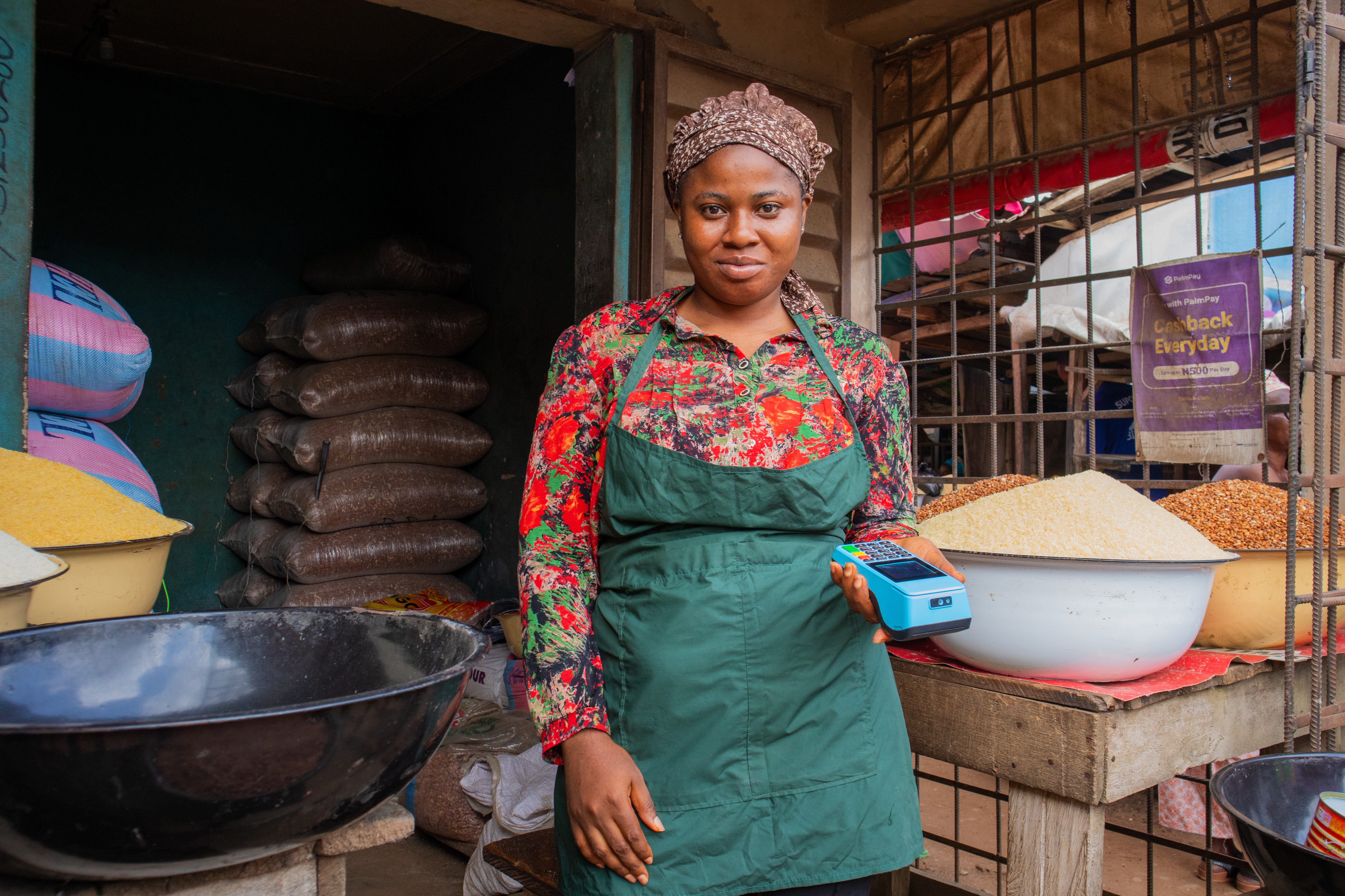 African Woman Holding a POS Terminal in Front of Her Shop  Modern Retail in Africa