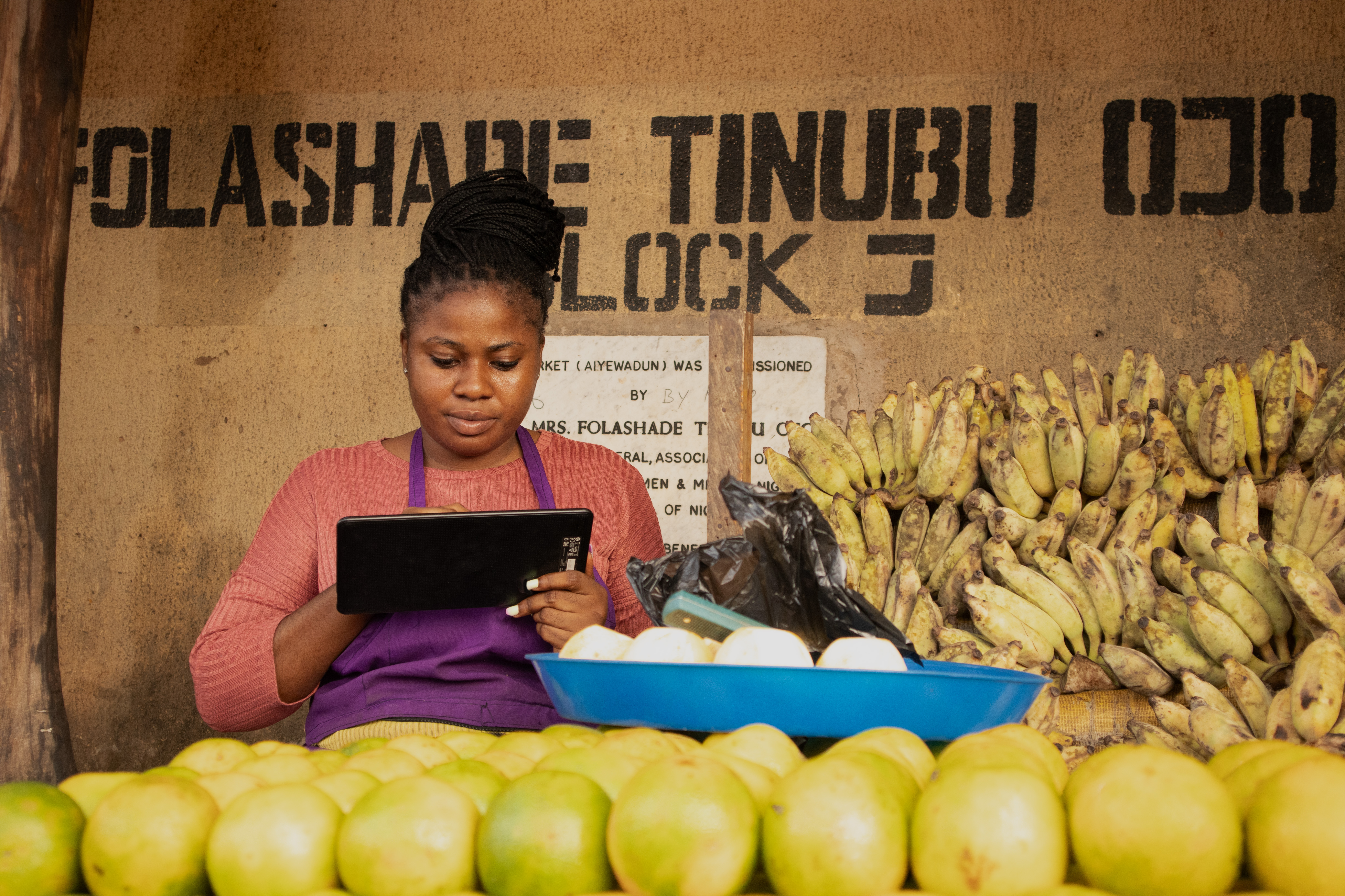 African-market woman-operation-a-tablet-in-a-market