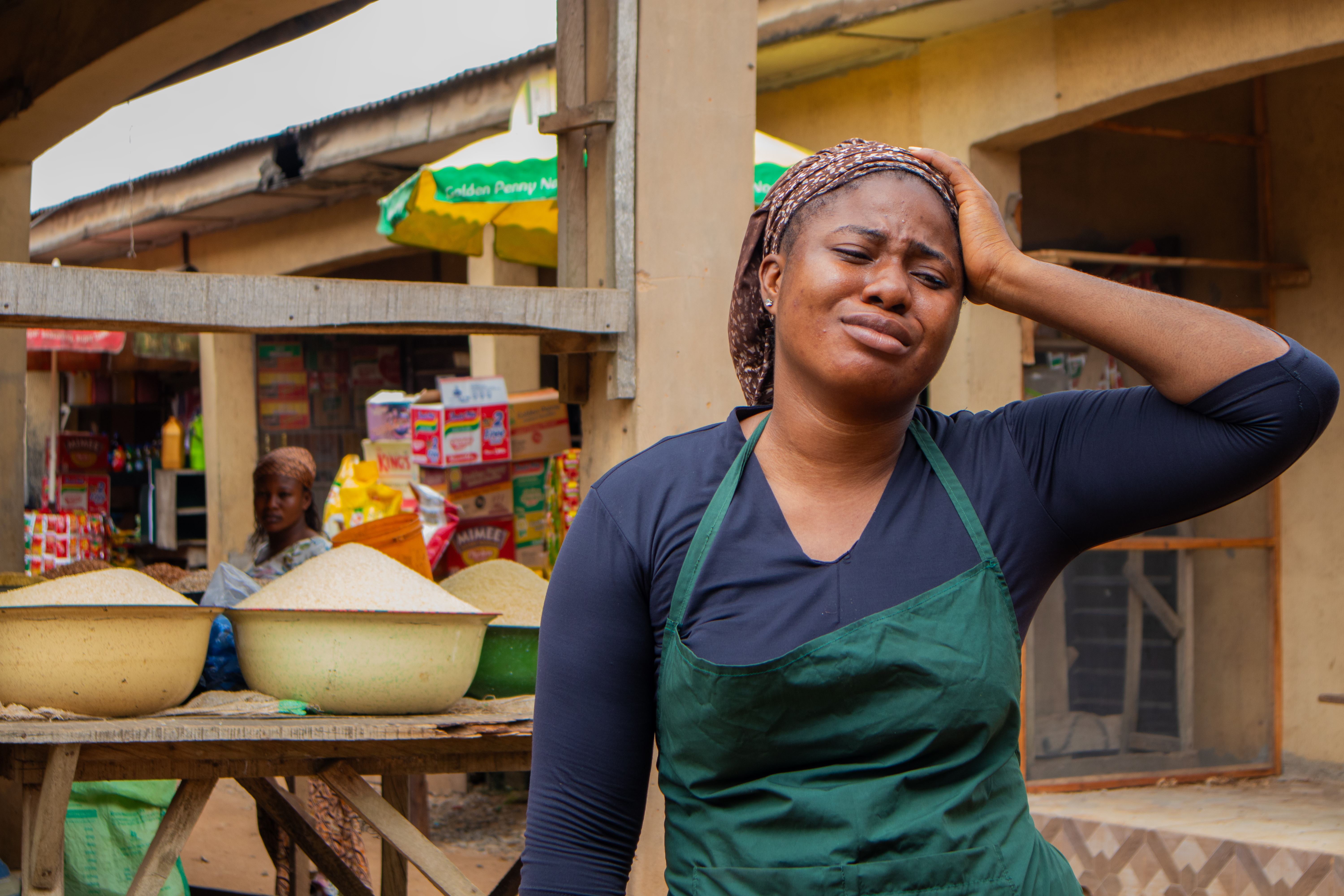 Concerned African Woman Reflecting on Challenges Outside Local Shop
