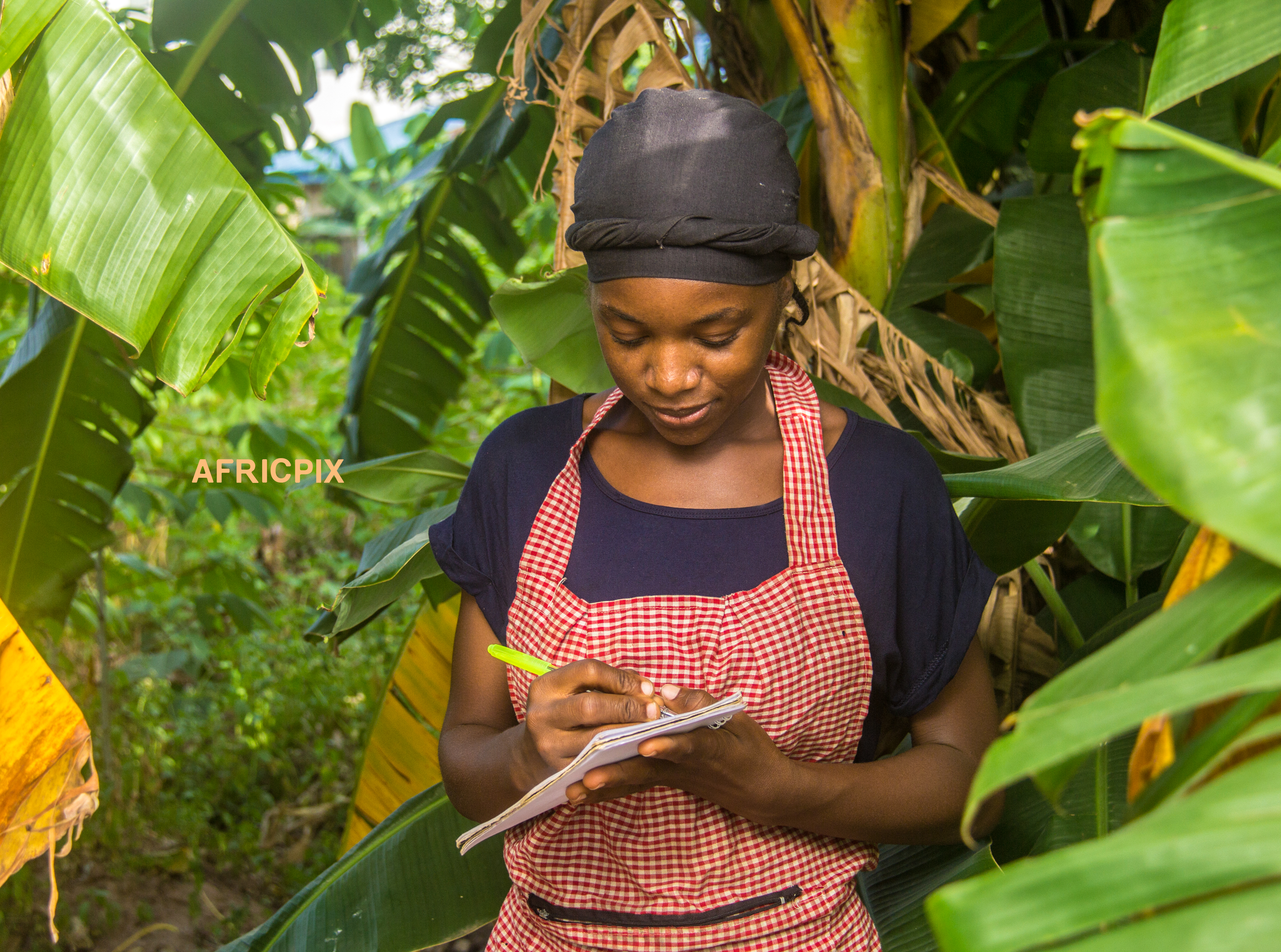 African  woman farmer writing on a piece of paper, likely keeping notes or making a sale in a busy market-female