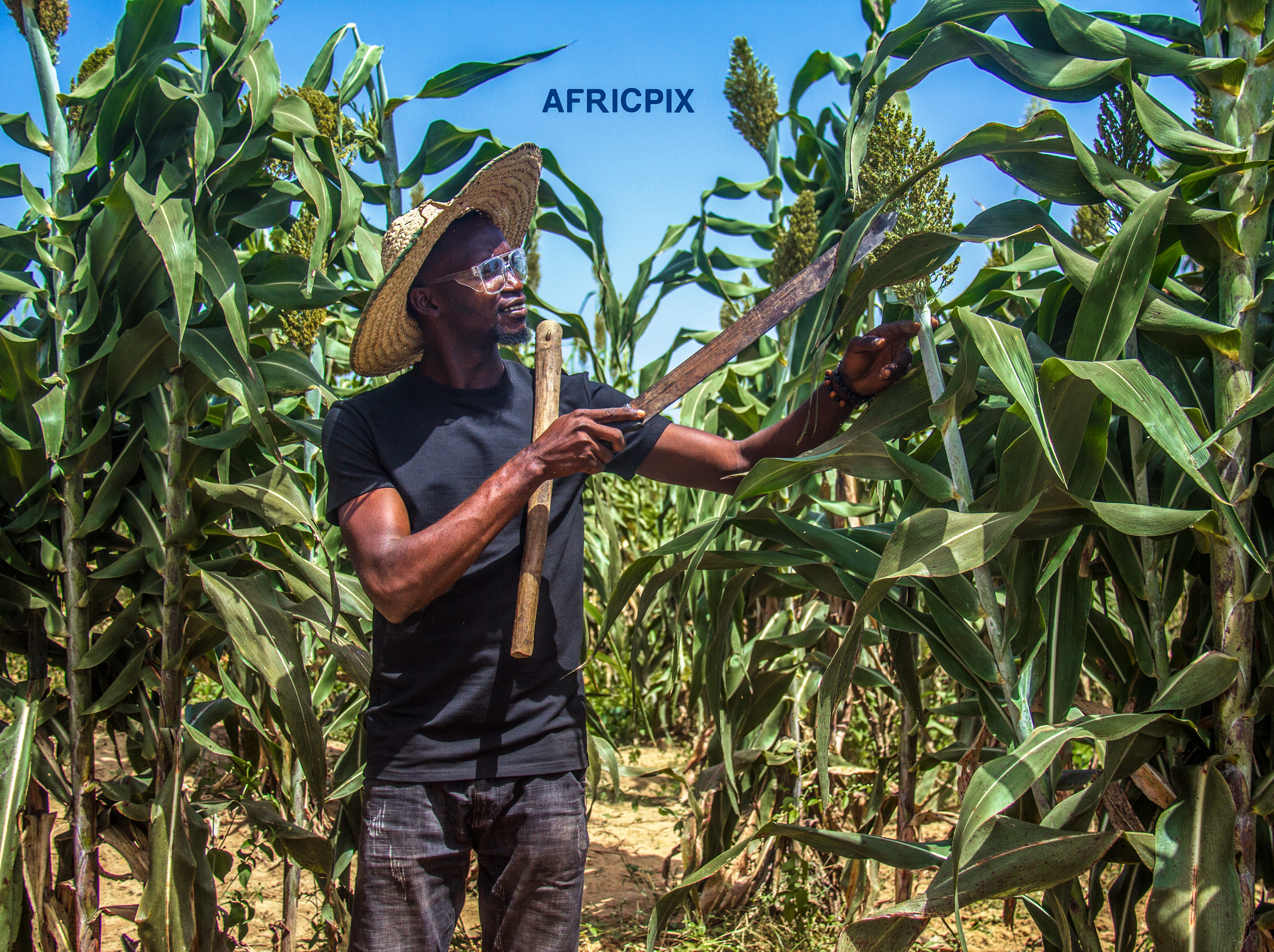 African farmer in a millet farm, wearing a hat and holding a hoe, ready for work male-man