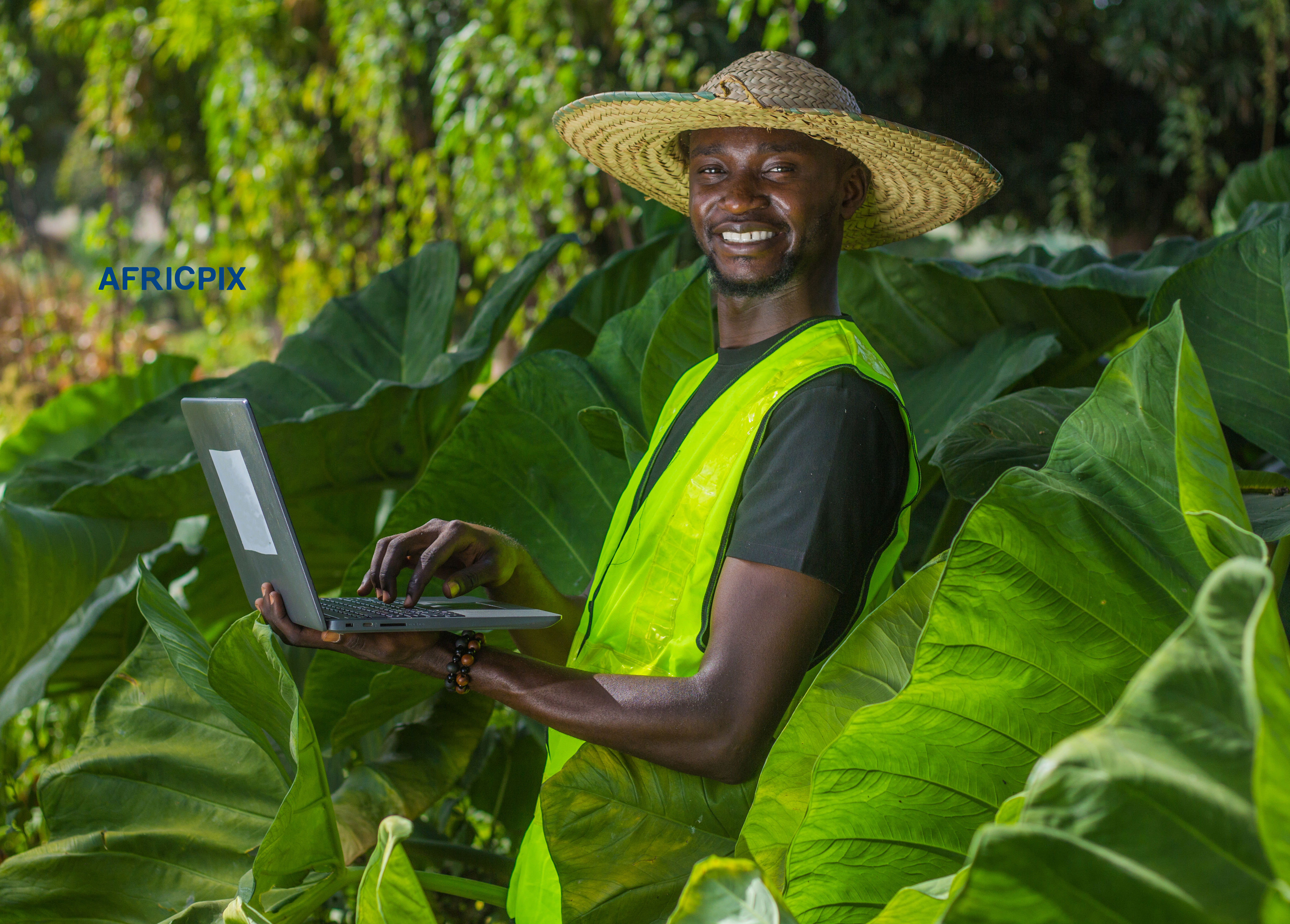 African male farmer in a farm setting, wearing a hat and using a laptop-man 2