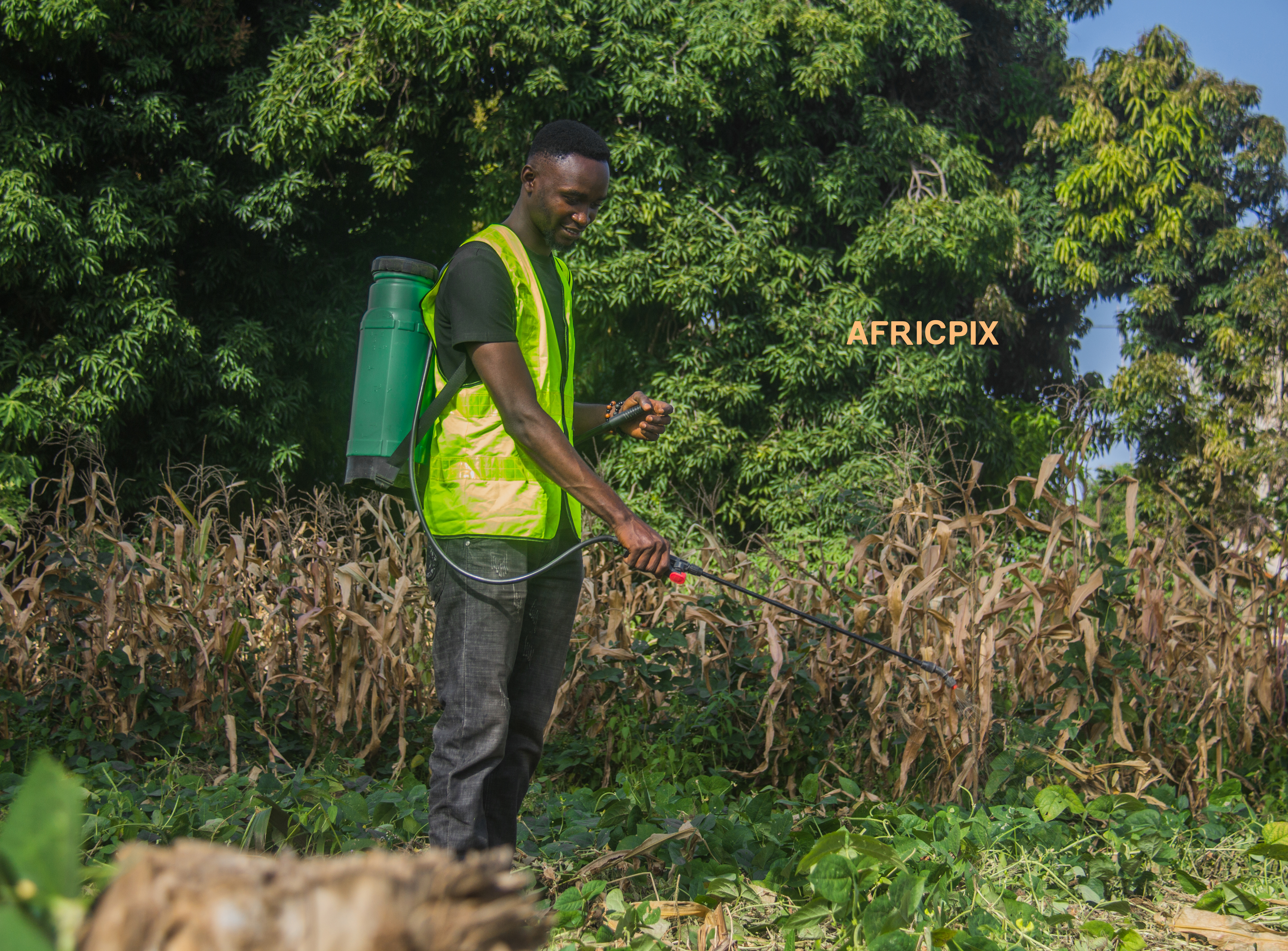 African man farmer spraying pesticides on his crops in a farm field-man