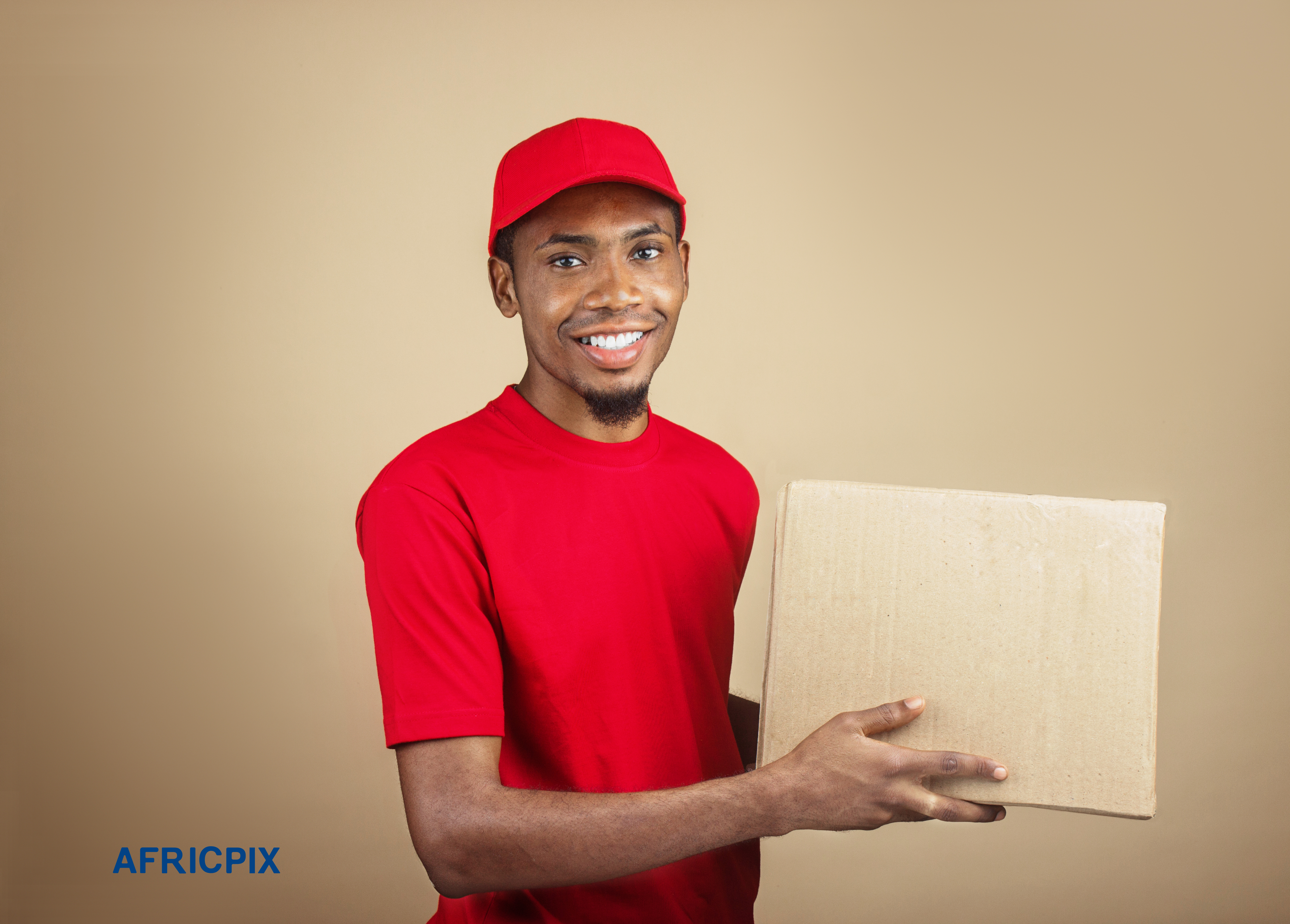 African Delivery Man Facing Forward, Holding a Package with Both Hands