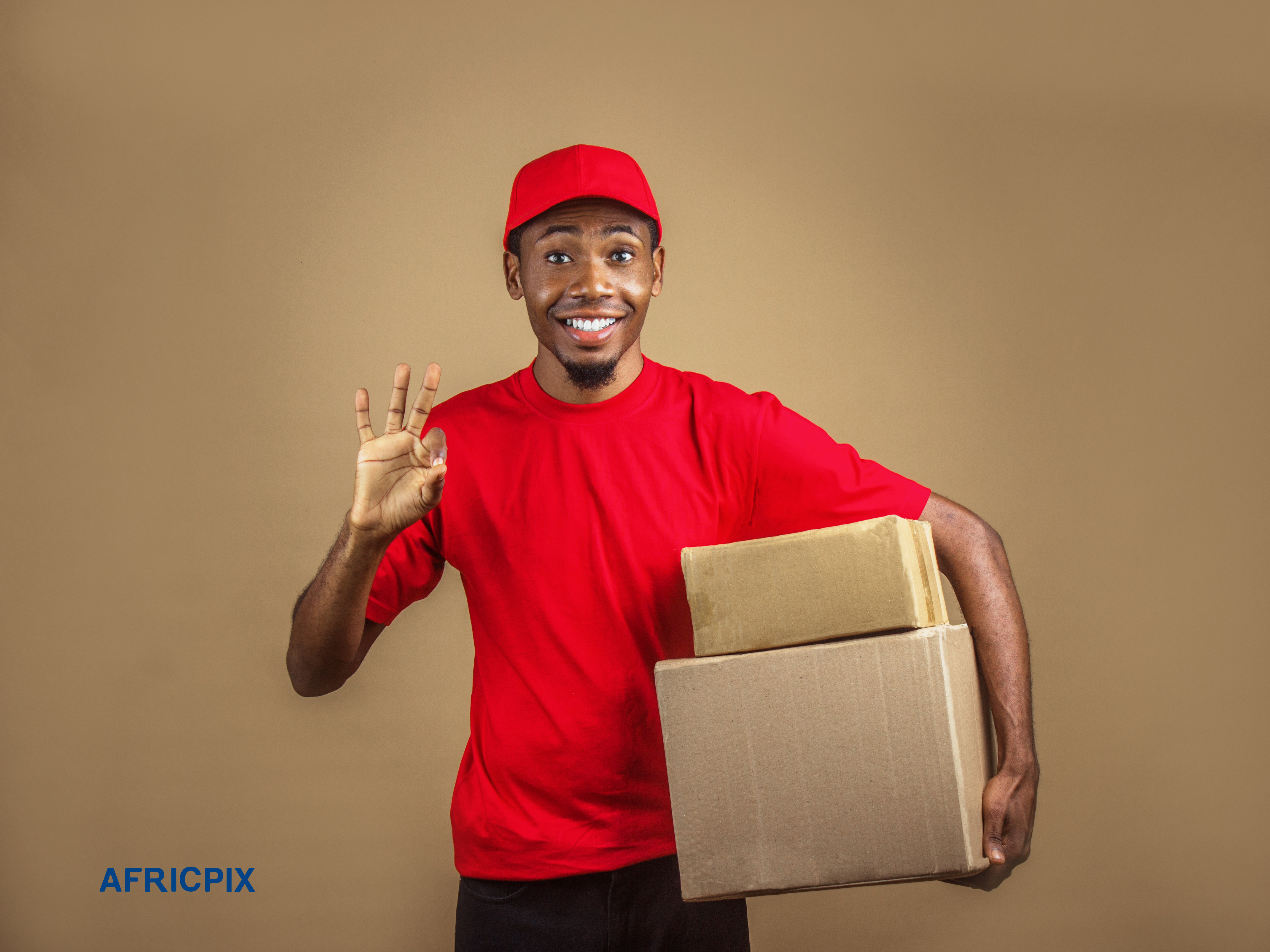 African Delivery Man Holding a Package in One Hand and Giving OK Sign with the Other