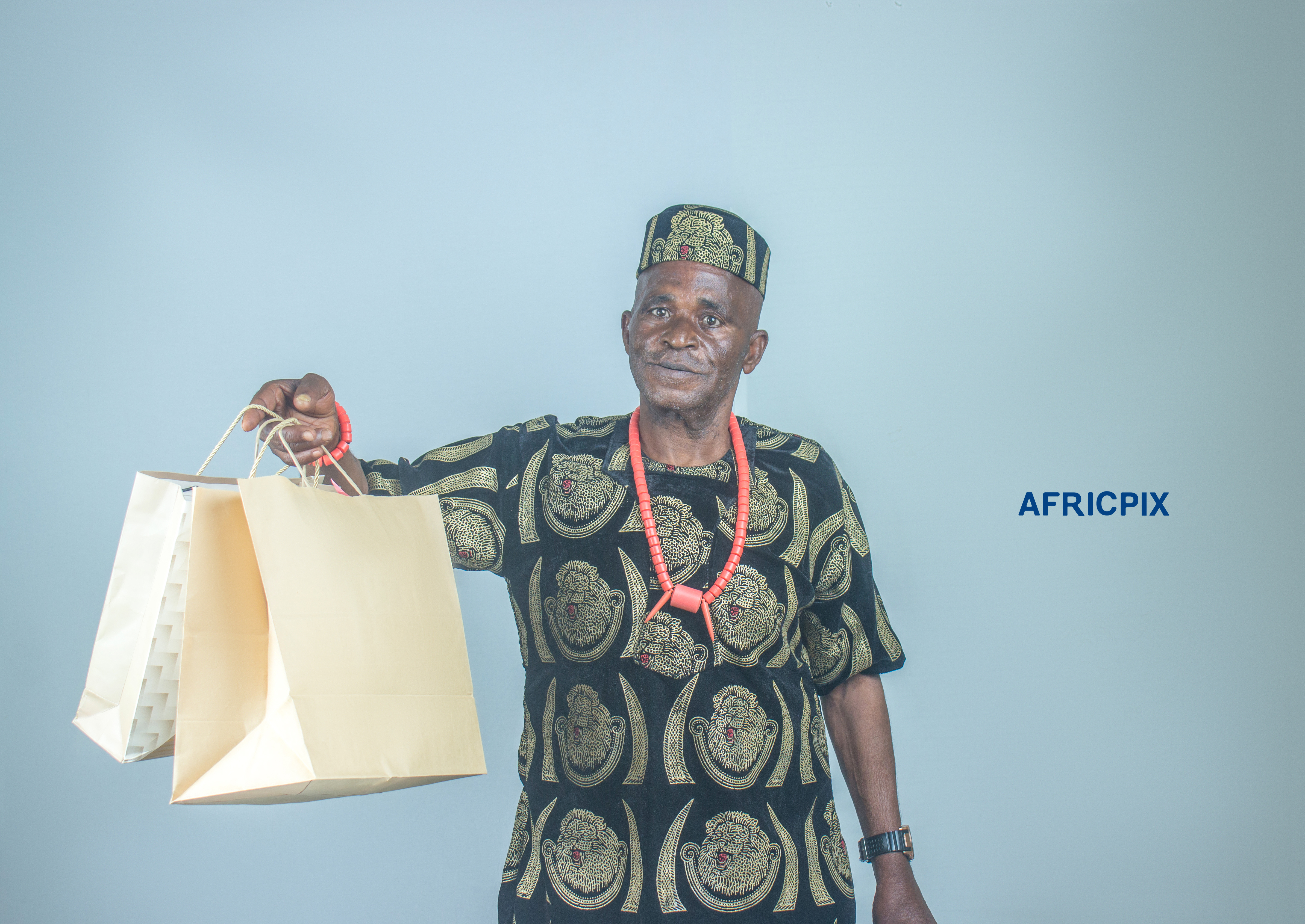 A joyful African Nigerian Igbo holding a gift bag the is looking happy