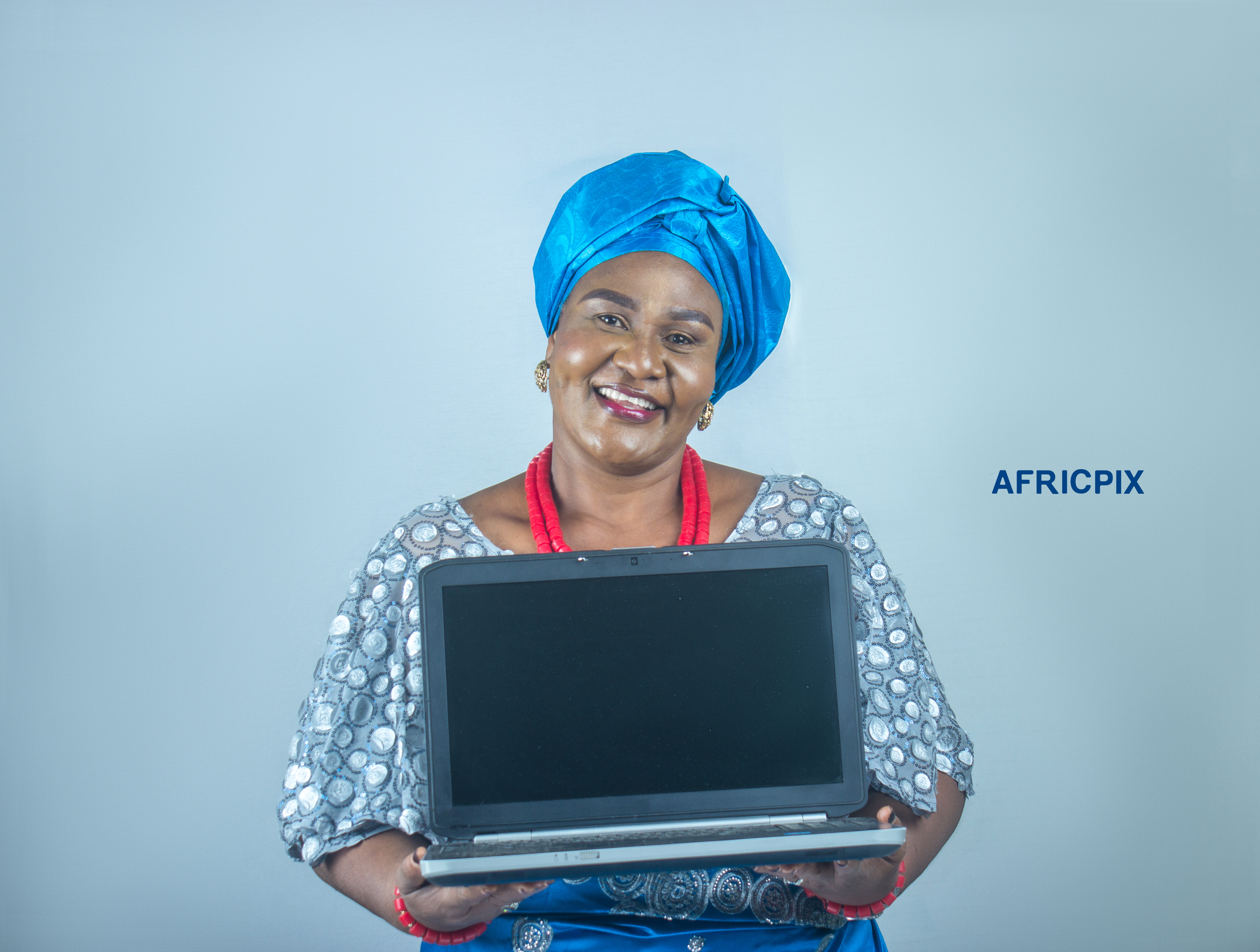 A happy African nigeria Igbo woman holding a laptop, wearing traditional attire1
