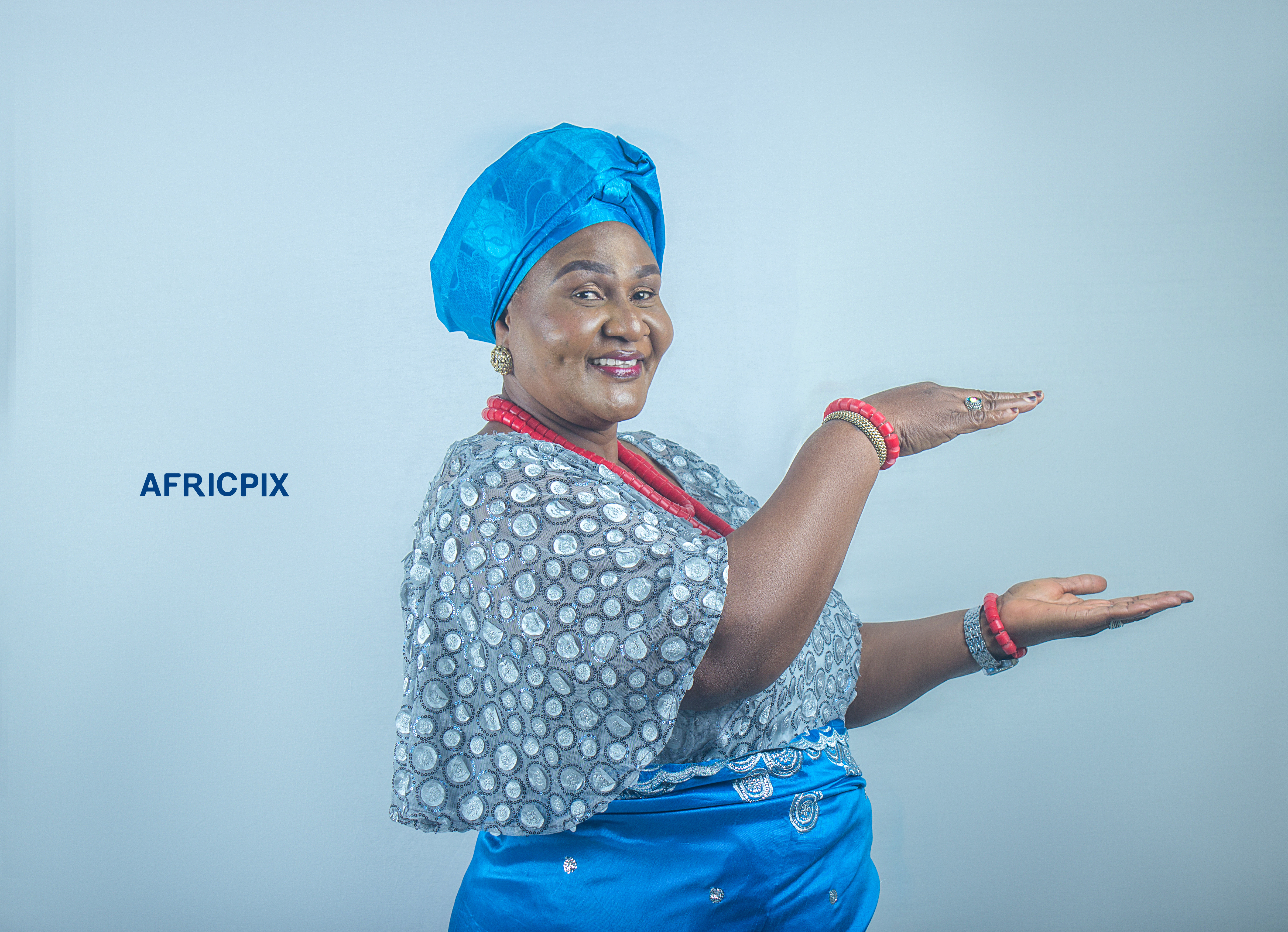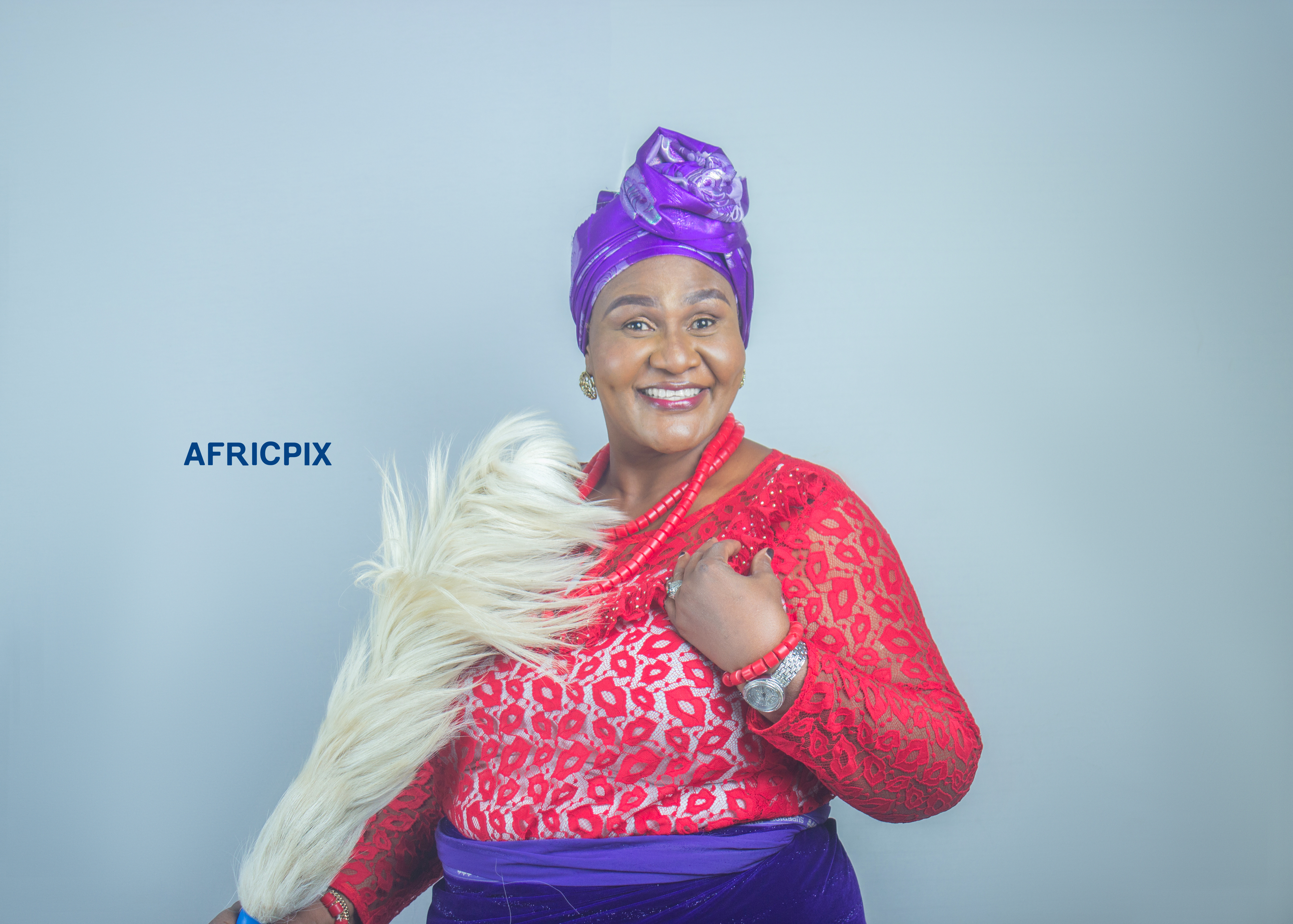 A happy African nigeria Igbo woman holding a nza, wearing traditional attire