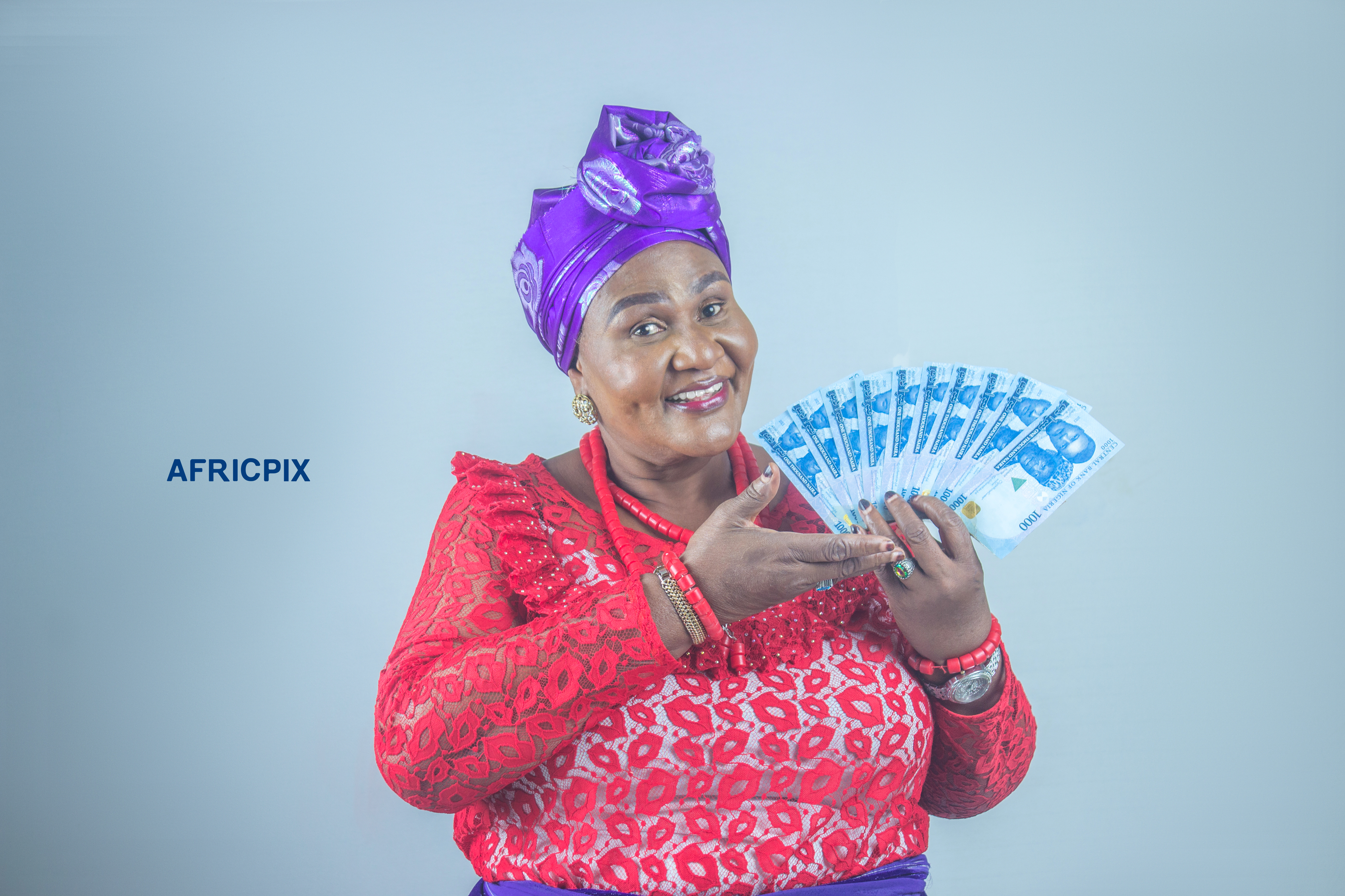 A happy African nigeria Igbo woman holding cash, naira money, wearing traditional attire