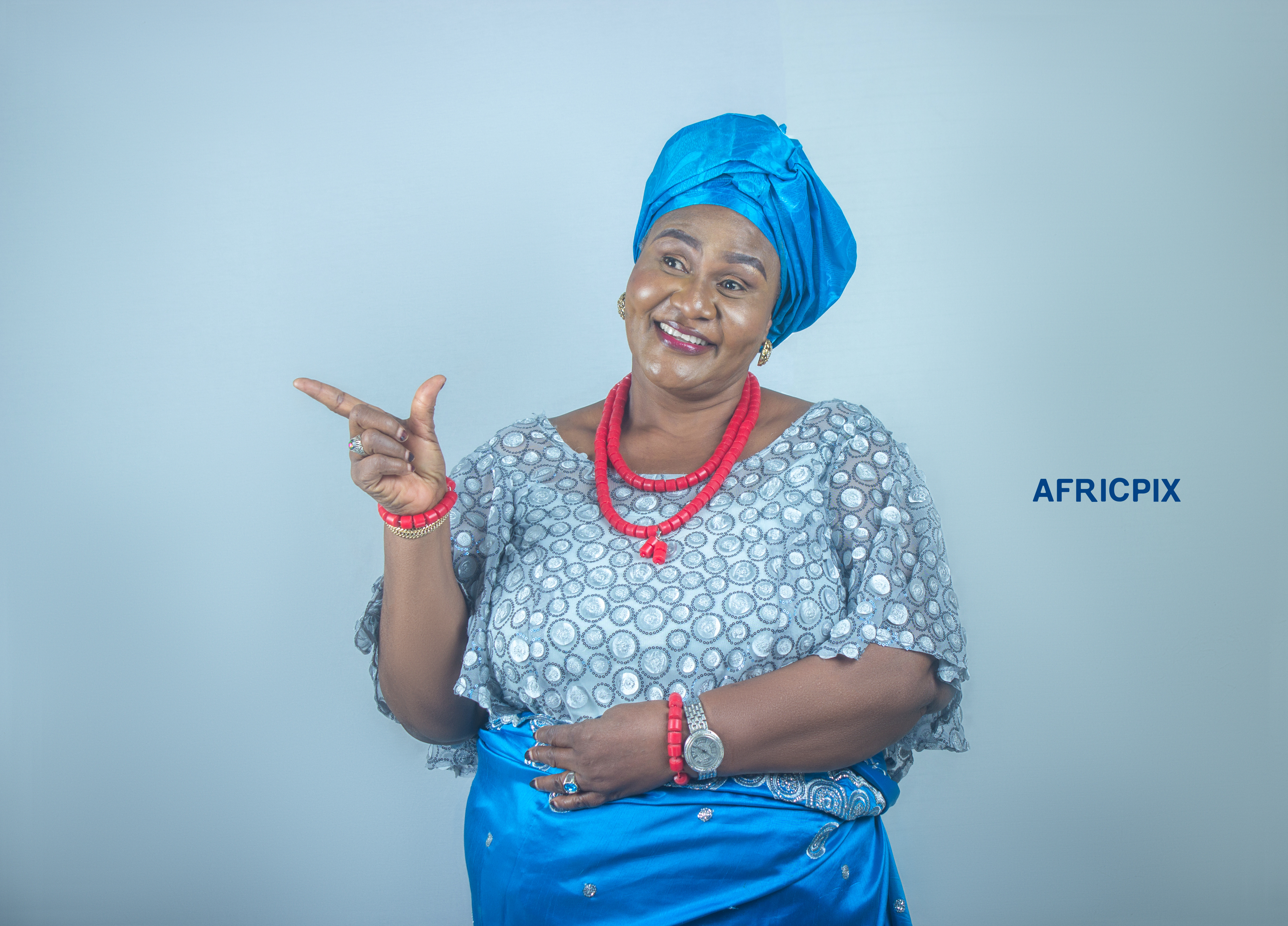 A joyful happy African Nigerian Igbo Pointing to the side