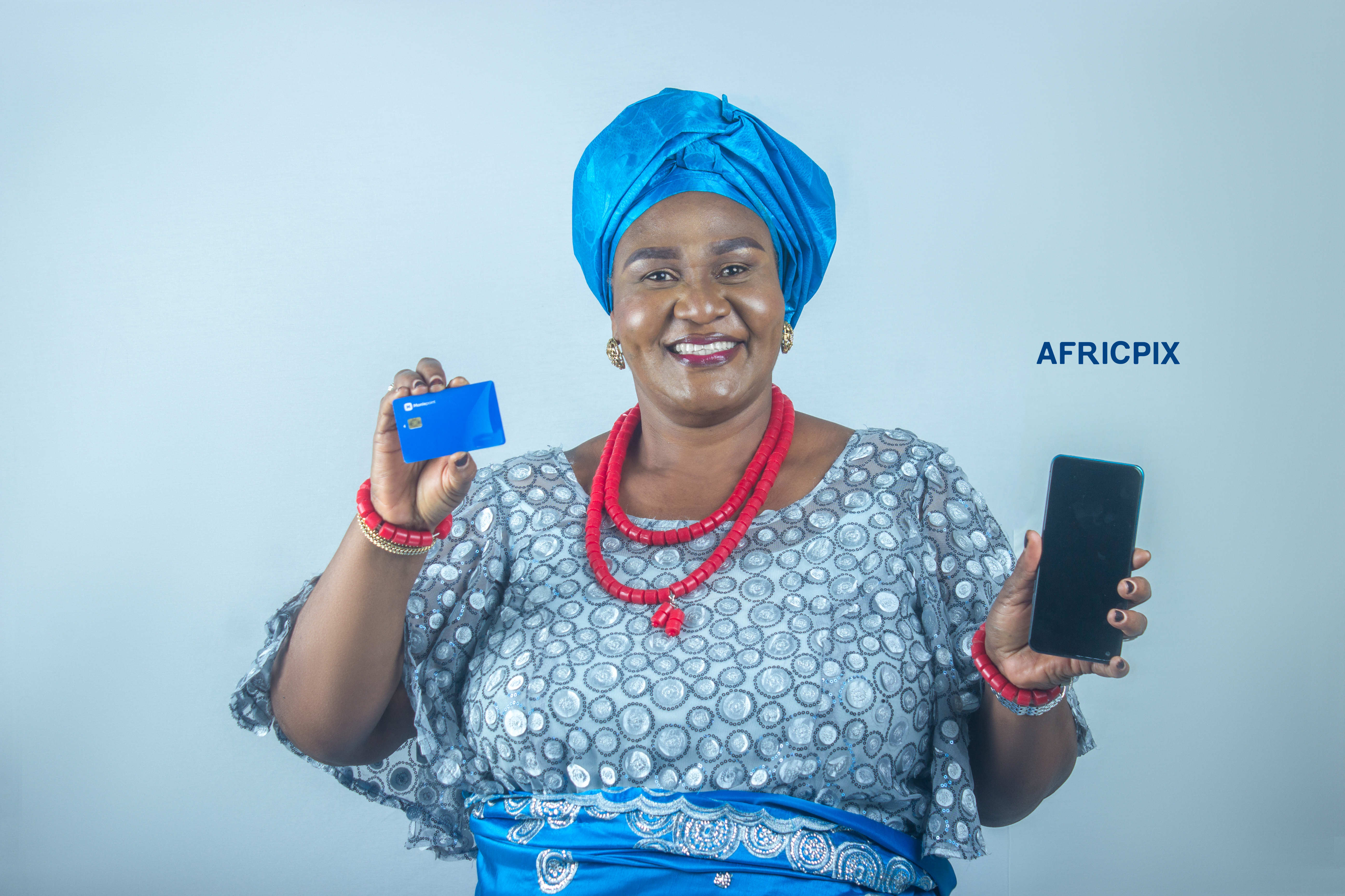 A joyful happy African Nigerian Igbo woman holding phone and ATM card debt card