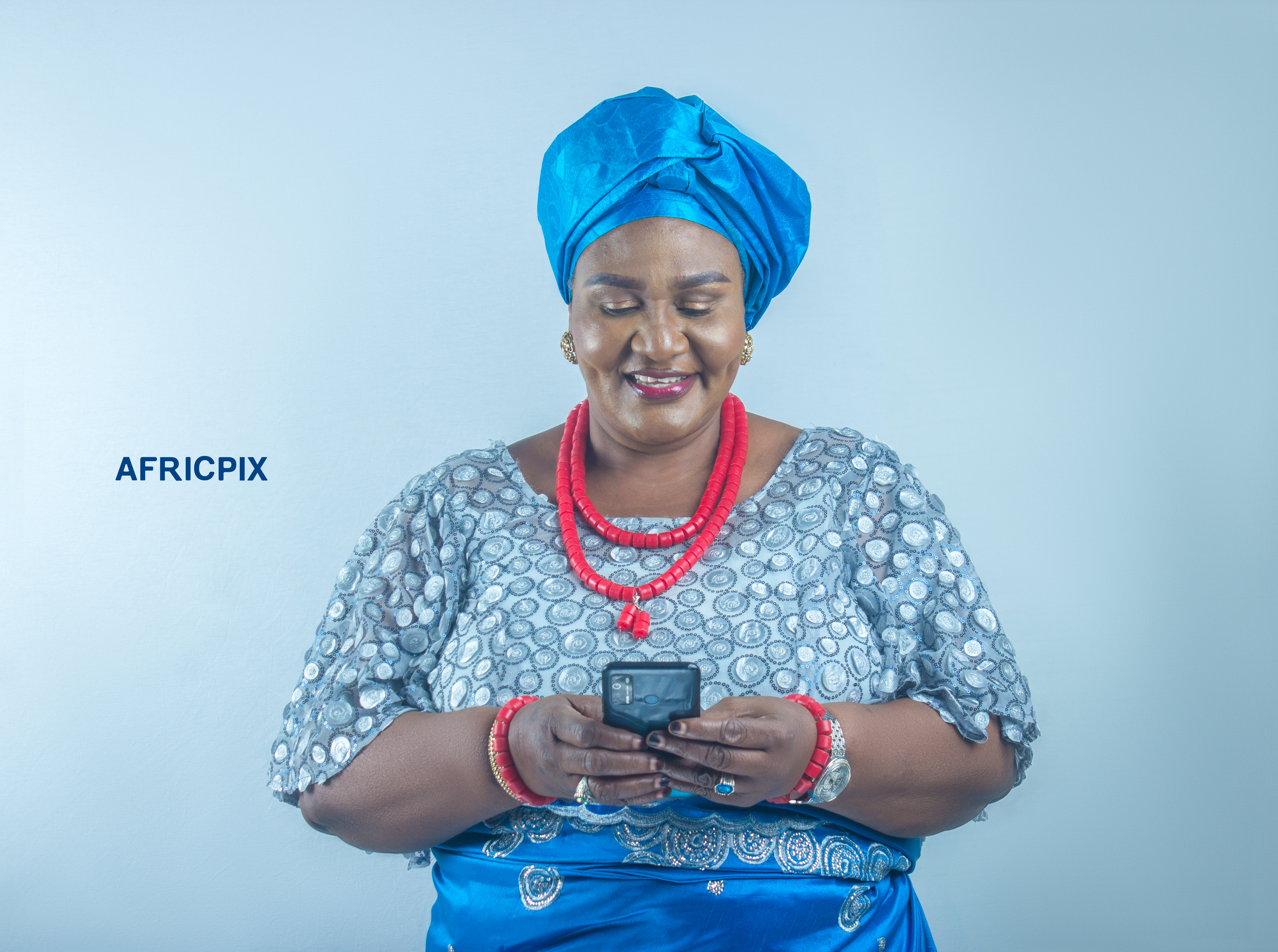 A joyful happy African Nigerian Igbo woman holding phone