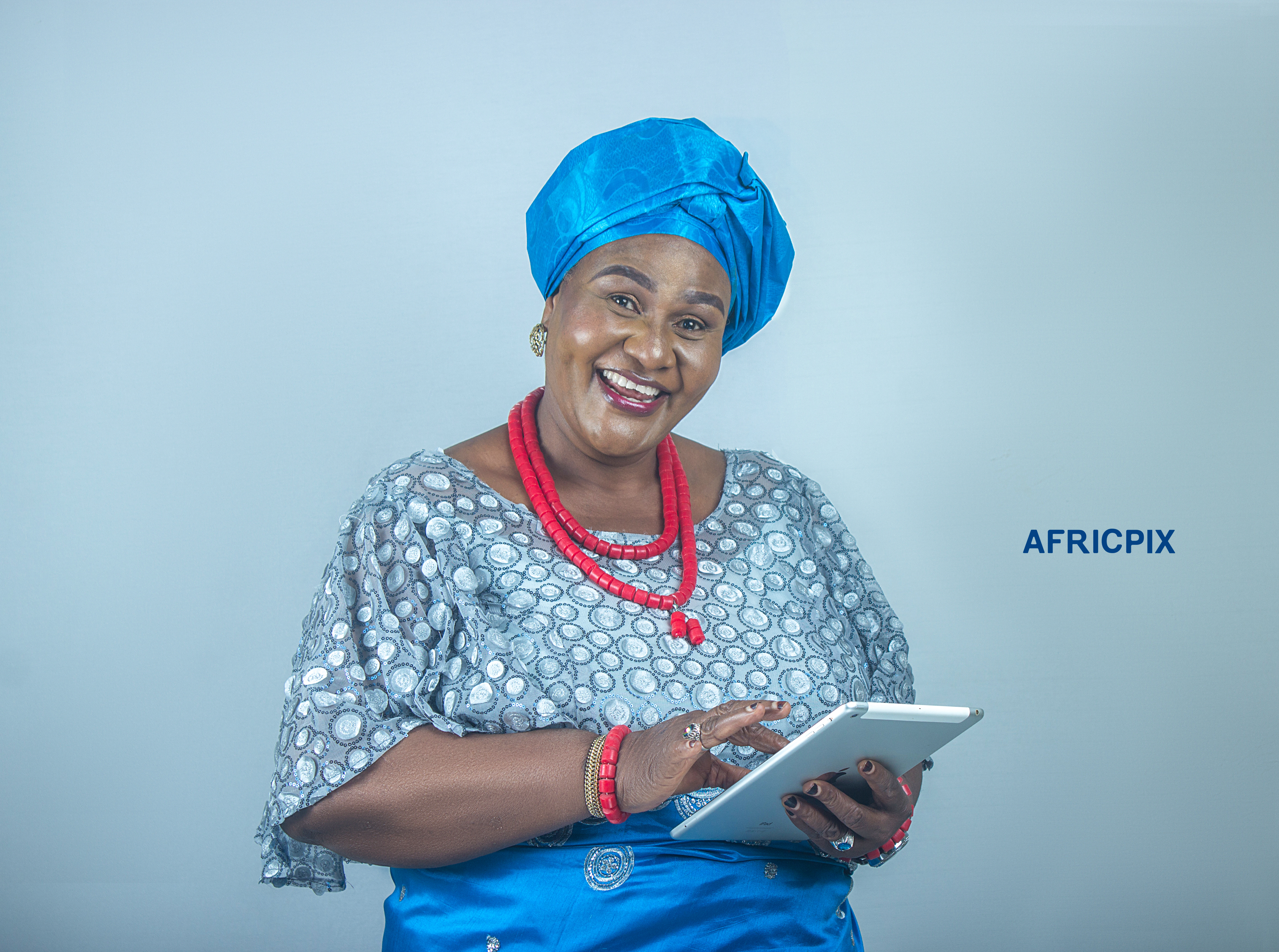 A joyful happy African Nigerian Igbo woman holding tablet