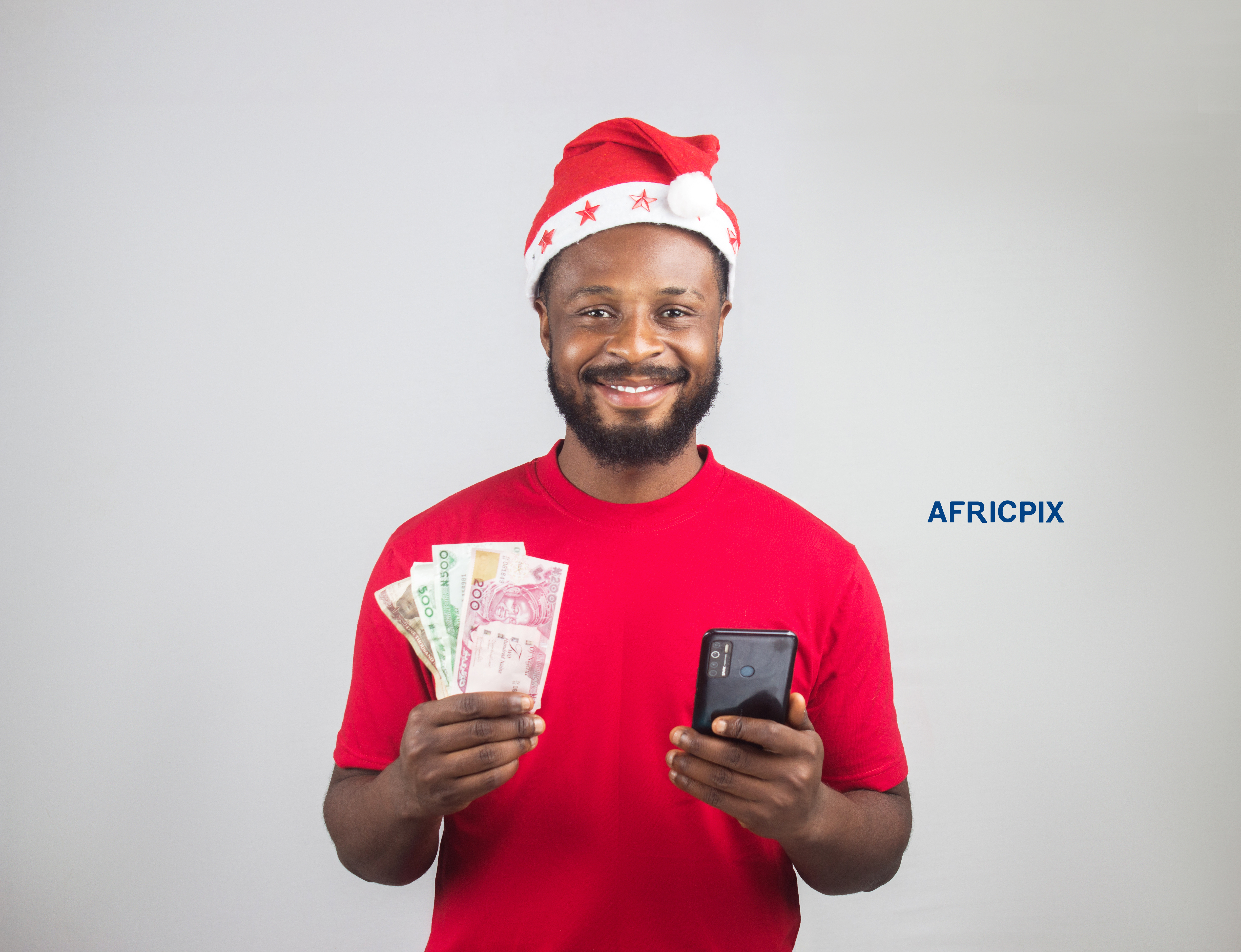 An African Nigerian man wearing a Christmas cap, holding Naira notes in one hand and a phone in the other. 2