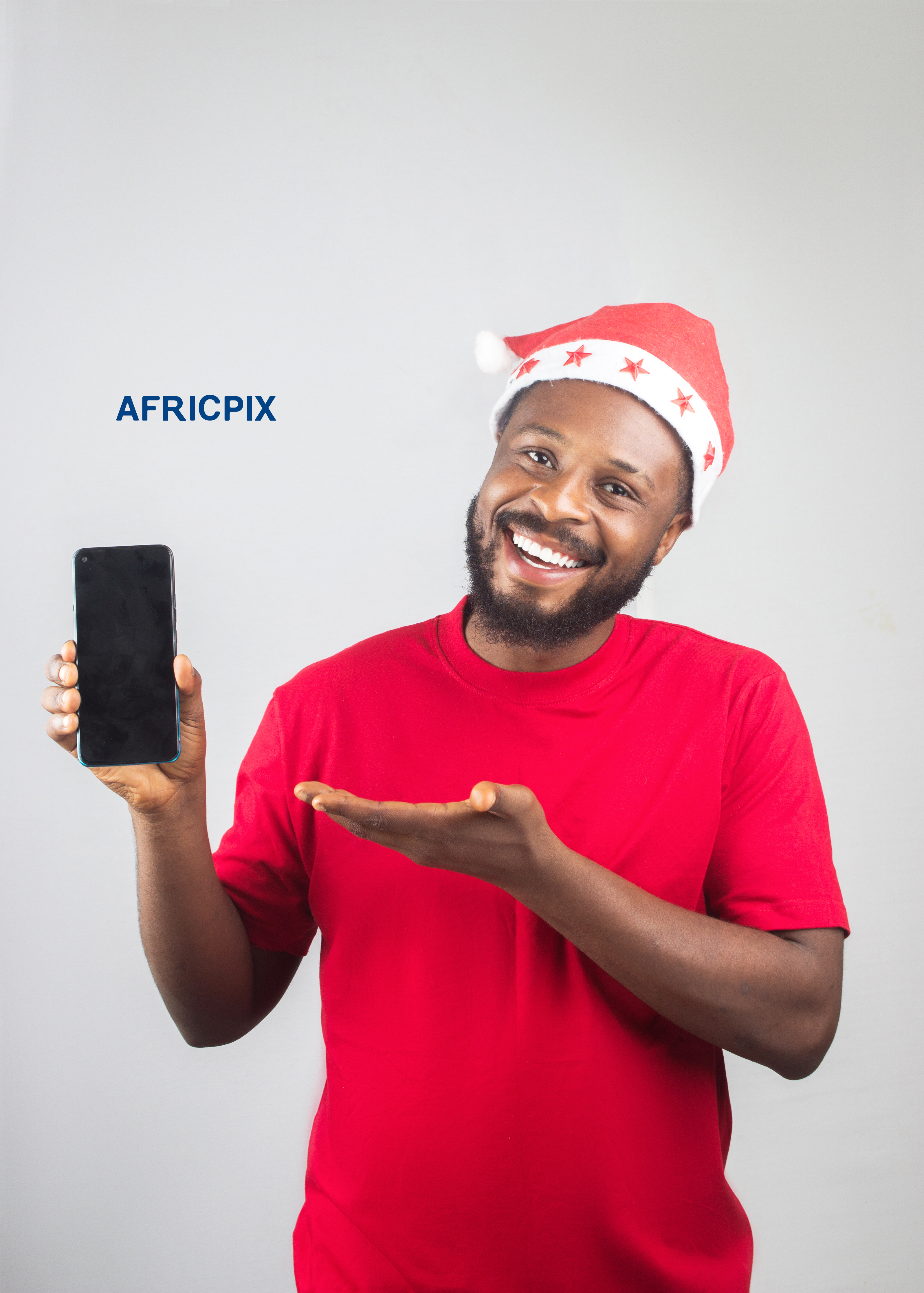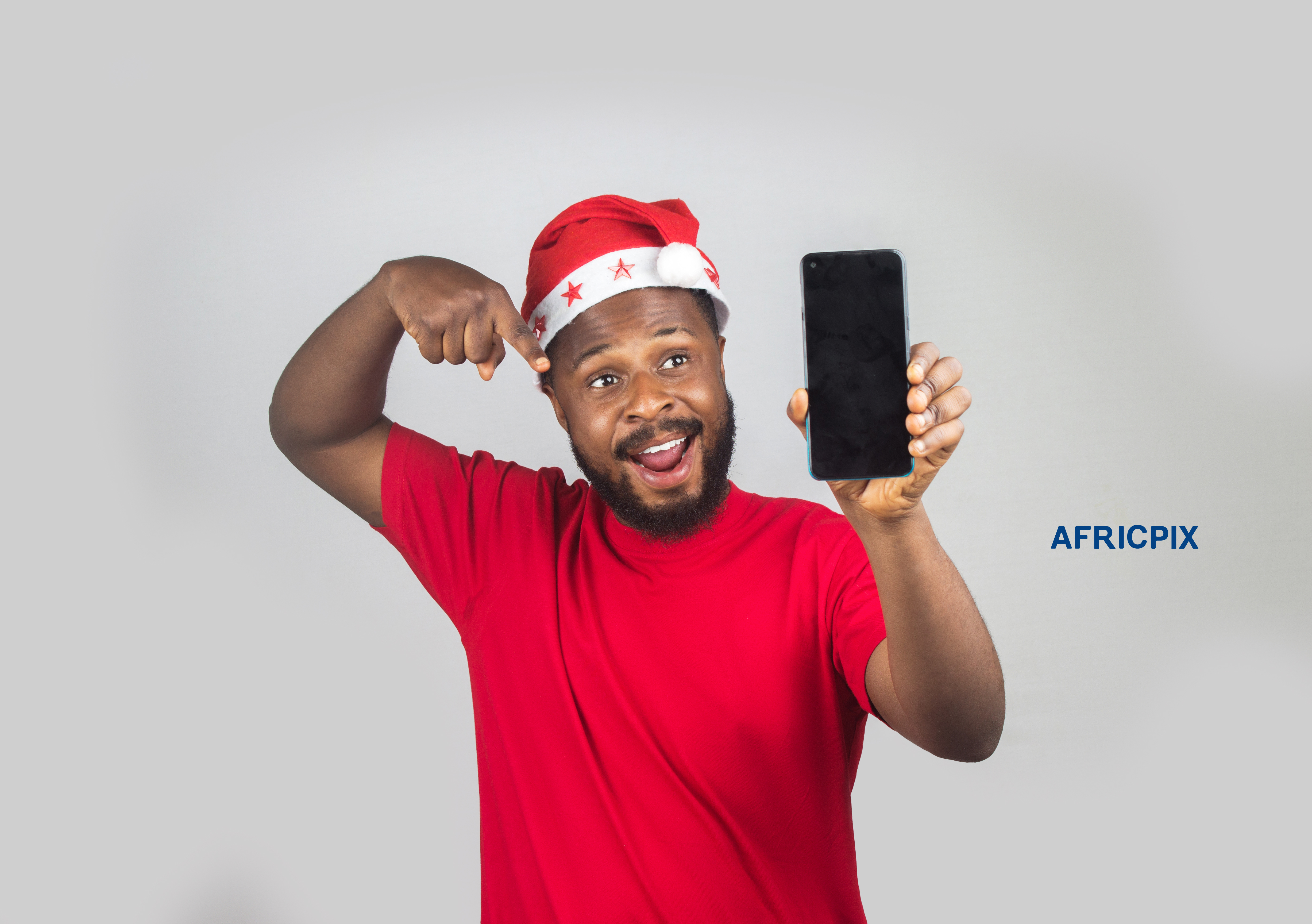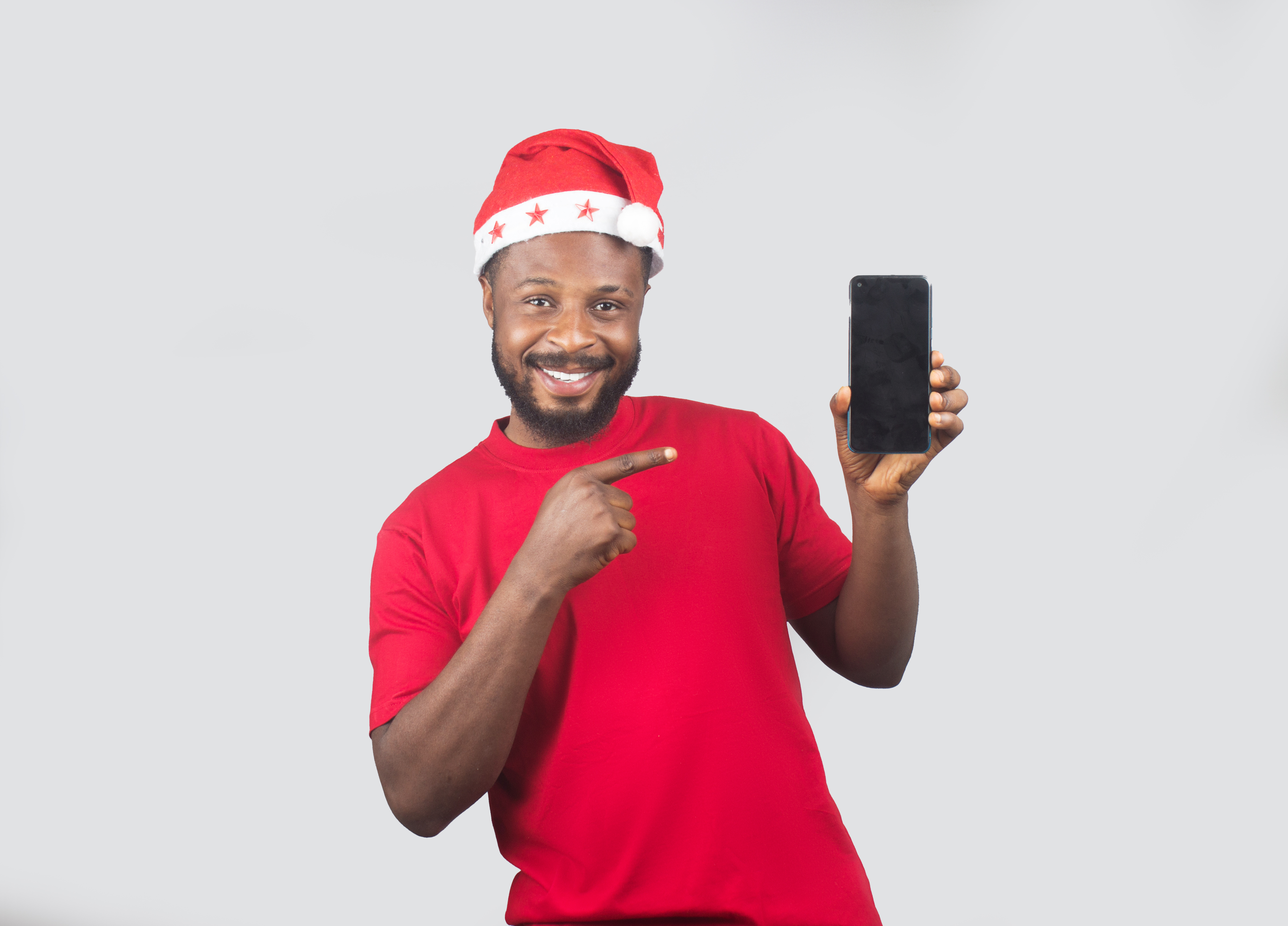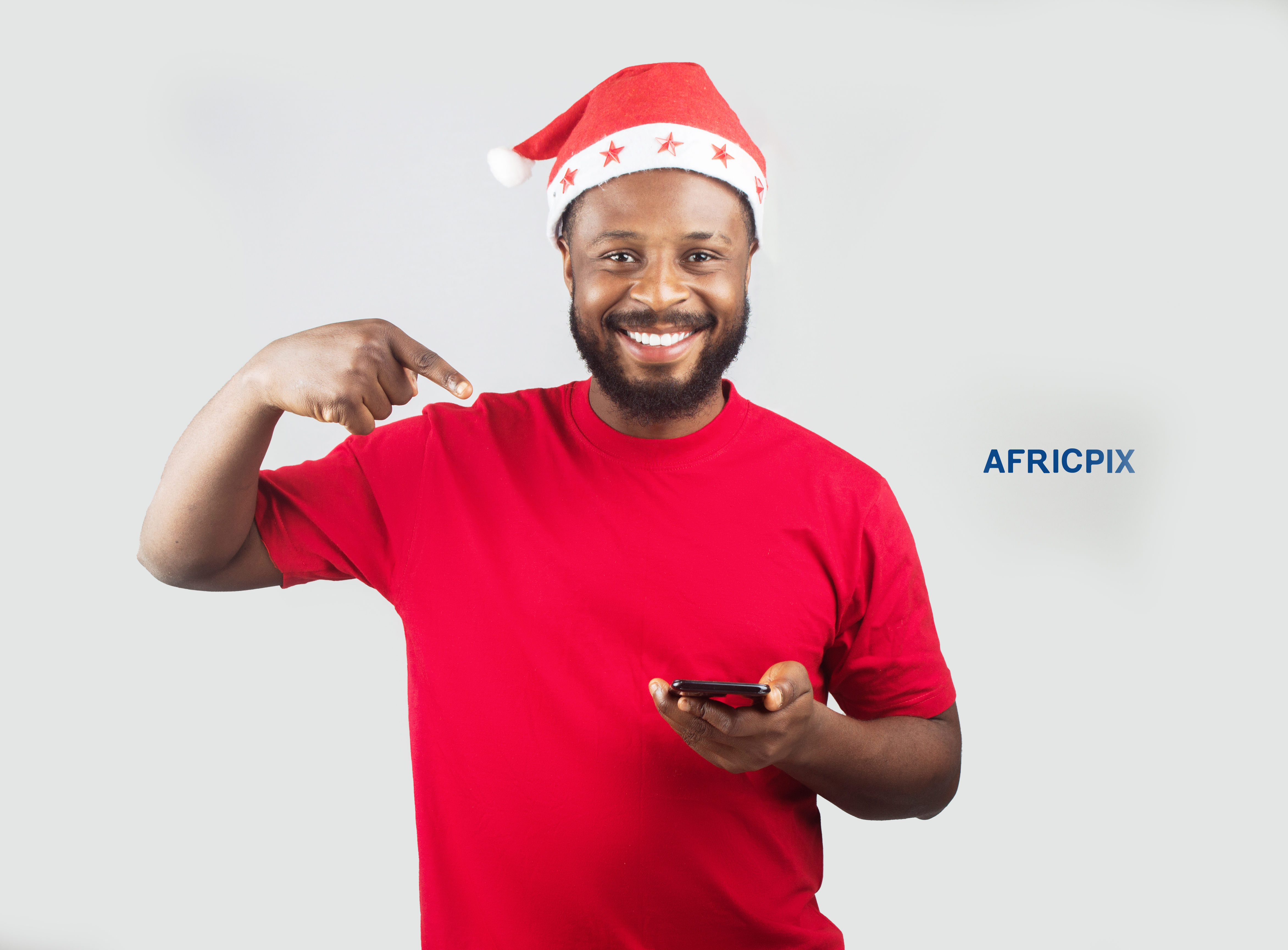 An African Nigerian man wearing a Christmas cap, holding a phone in one hand and pointing at it with the other hand 3.