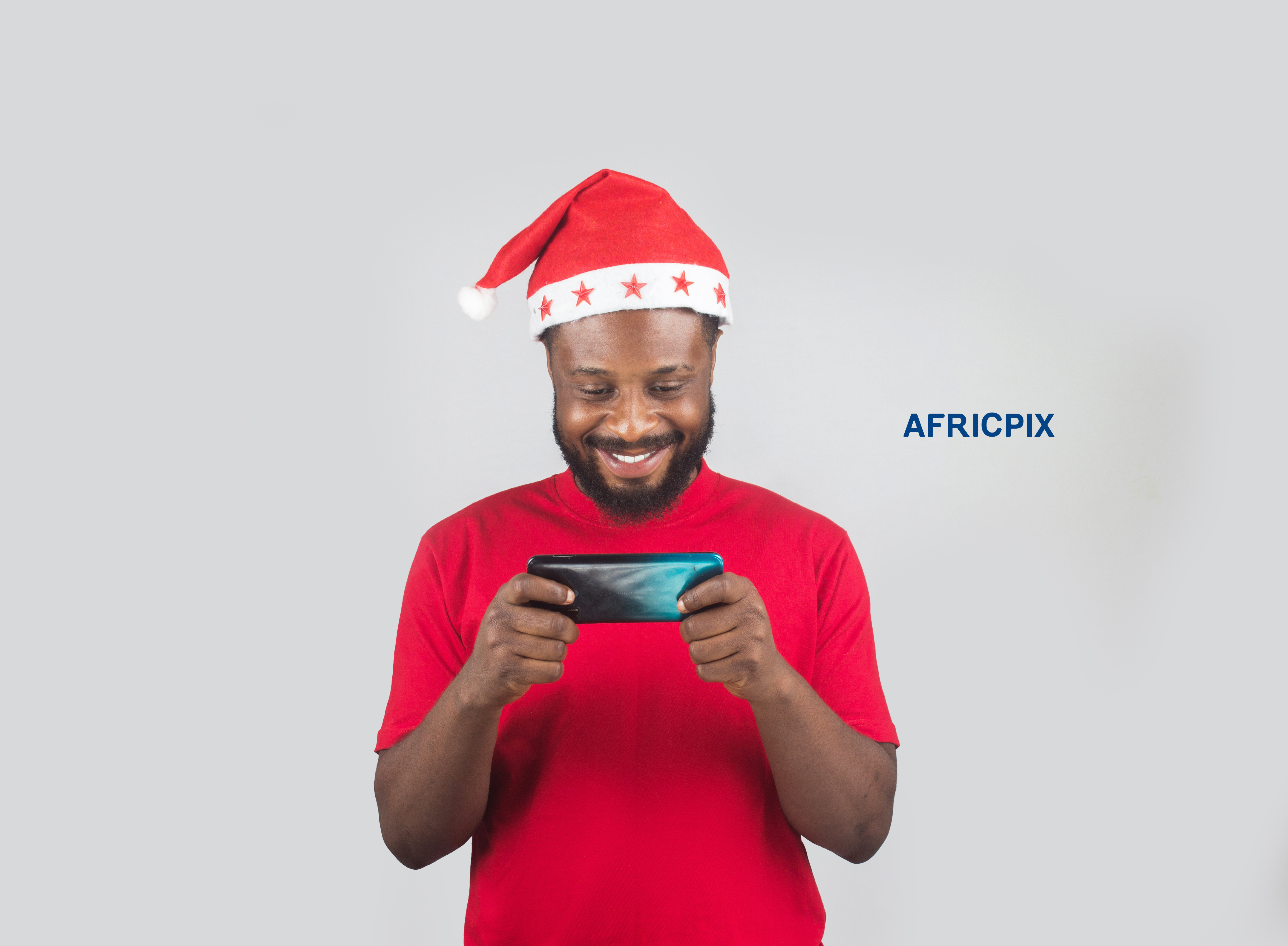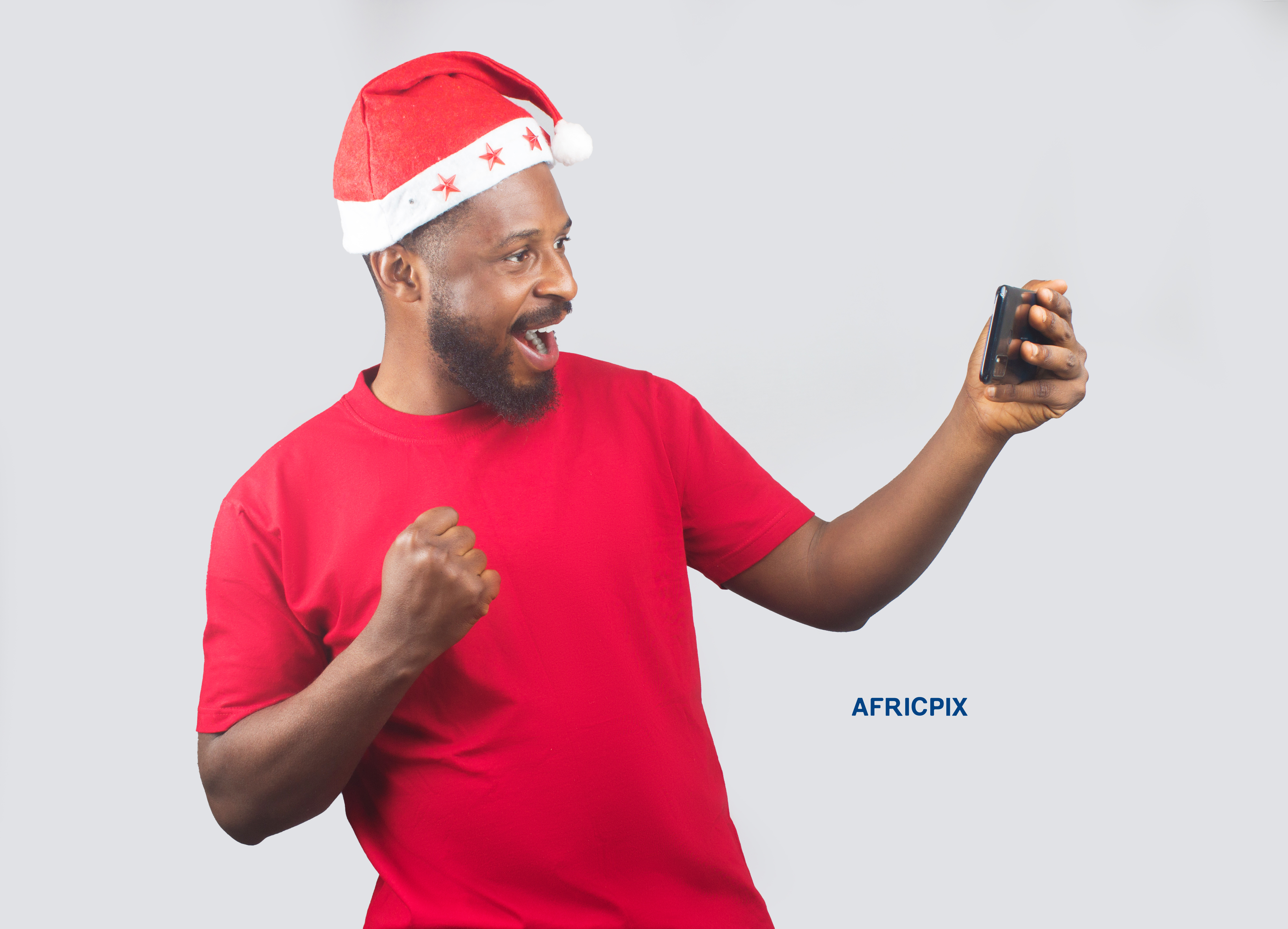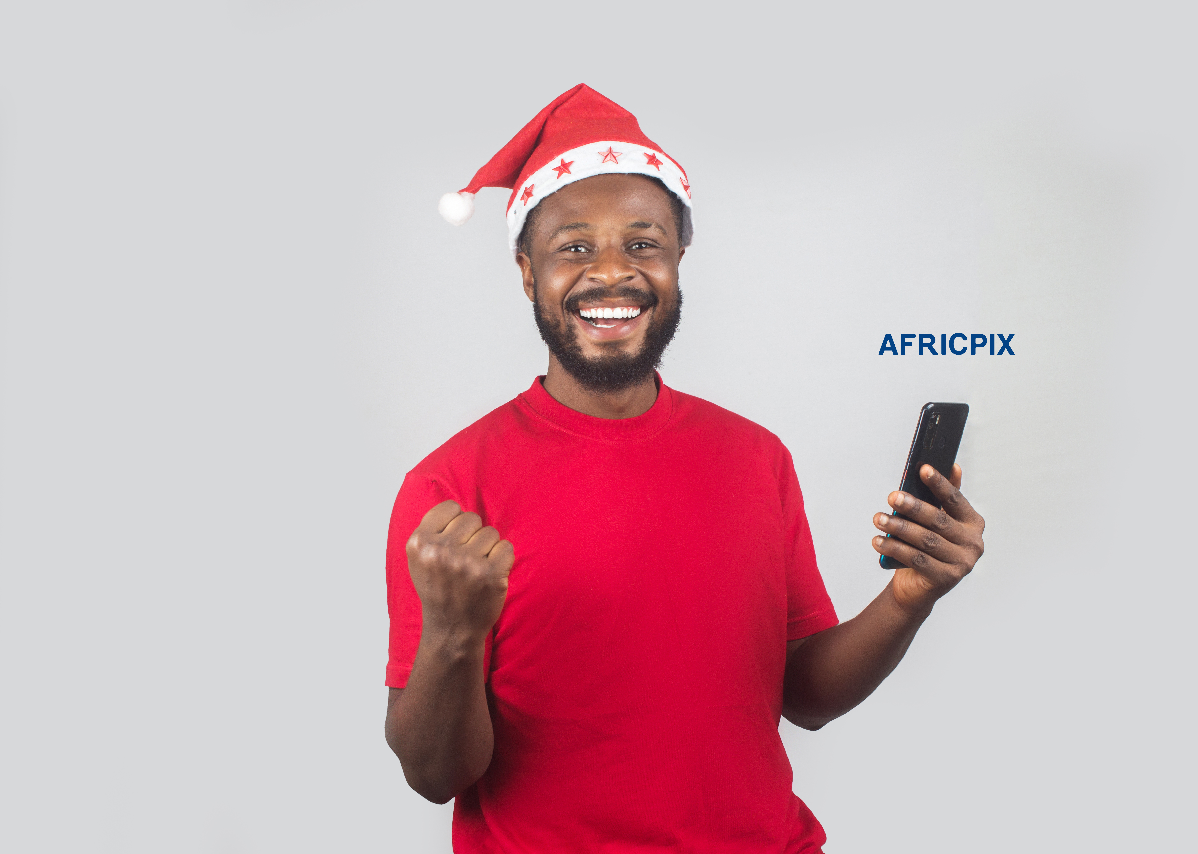 An African Nigerian man wearing a Christmas cap, holding a phone, and looking excited with a big smile.