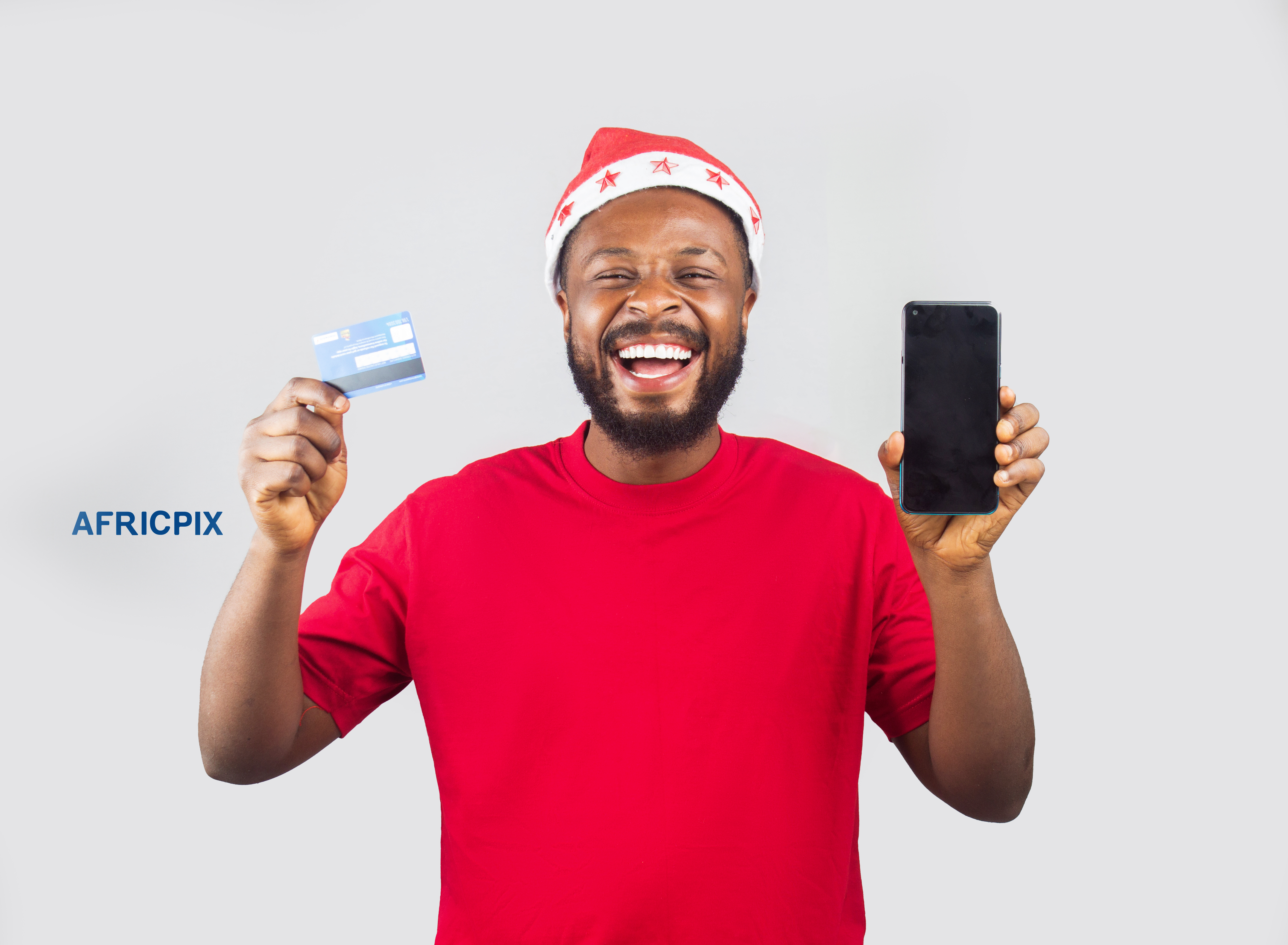 An African Nigerian man wearing a Christmas cap, holding an ATM or debit card and a phone, looking happy and cheerful.