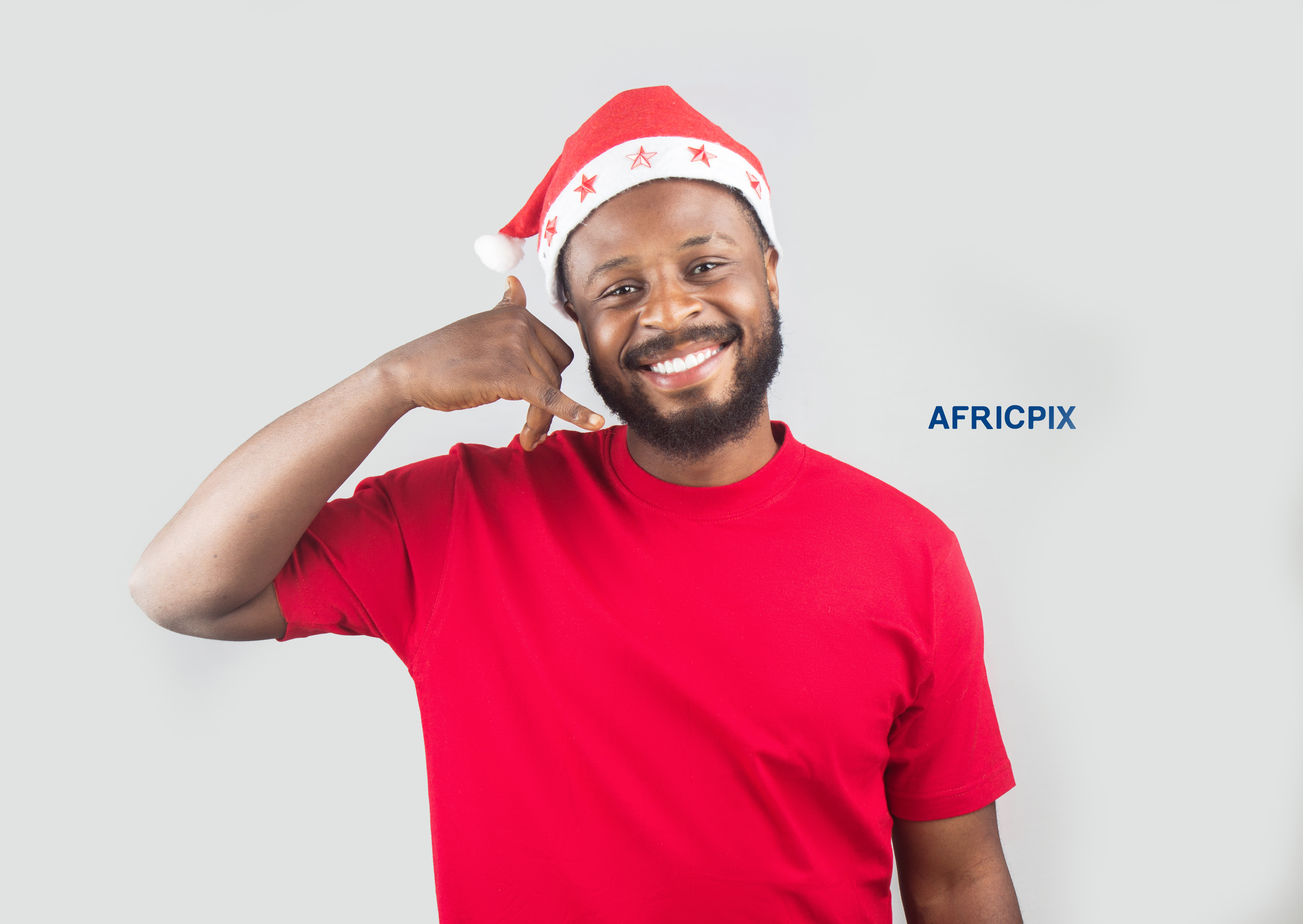 An African Nigerian man wearing a Christmas cap, making a hand gesture like talking on the telephone with his fingers
