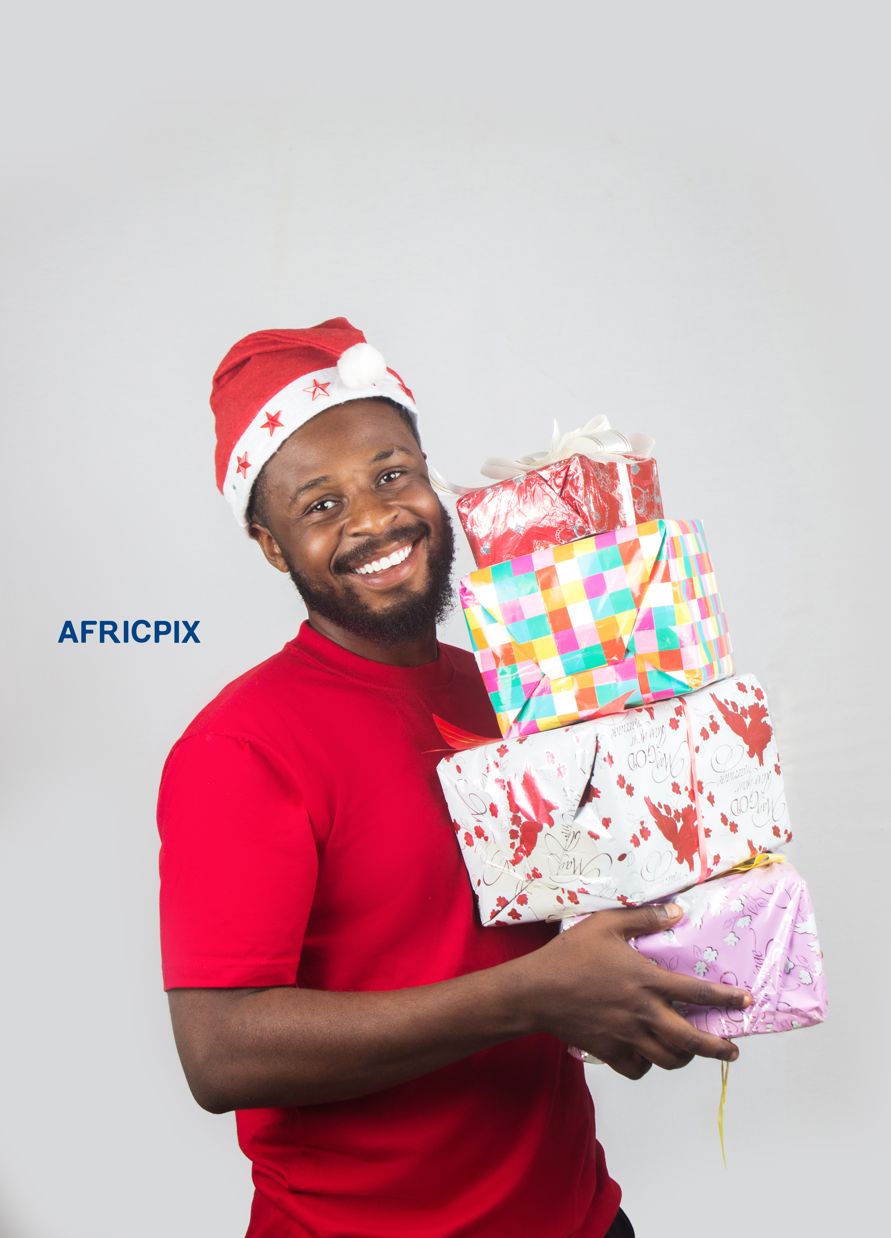 An African Nigerian man wearing a Christmas cap, holding a large stack of gifts, smiling with joy.