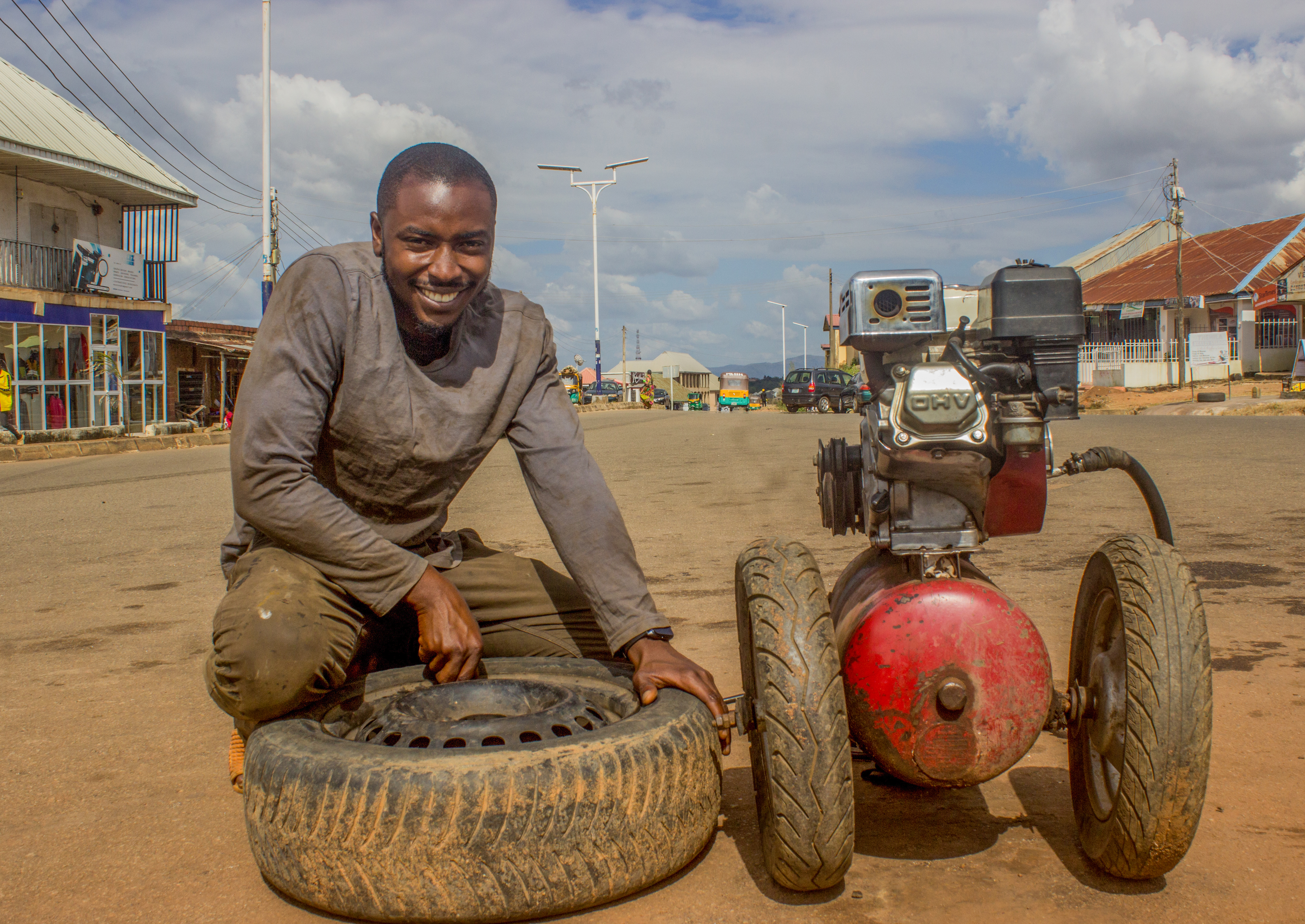 African Vulcanizer Giving a Thumbs-Up While Pumping Air into a Tire
