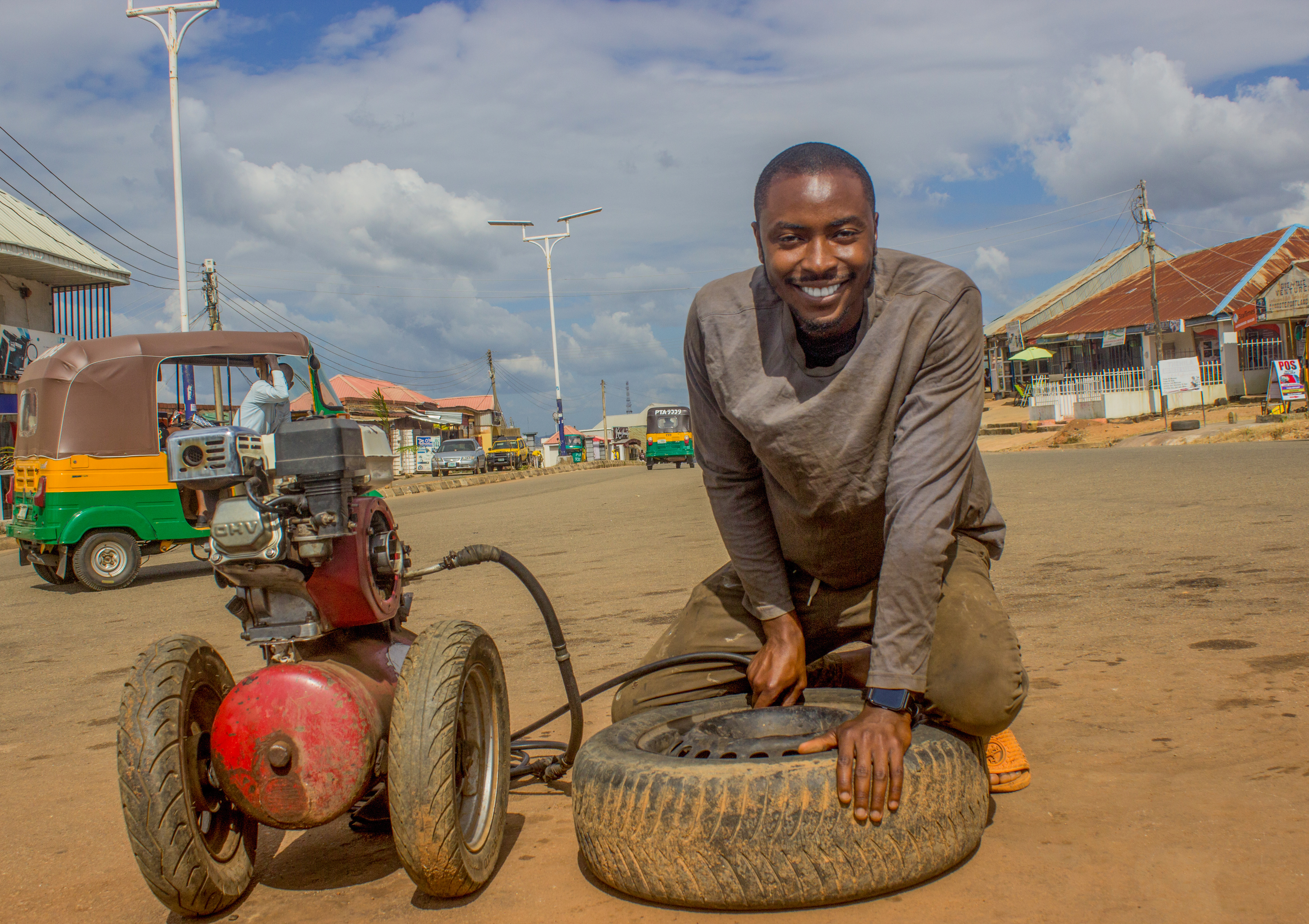 Smiling African Vulcanizer Fixing a Tire .jpg