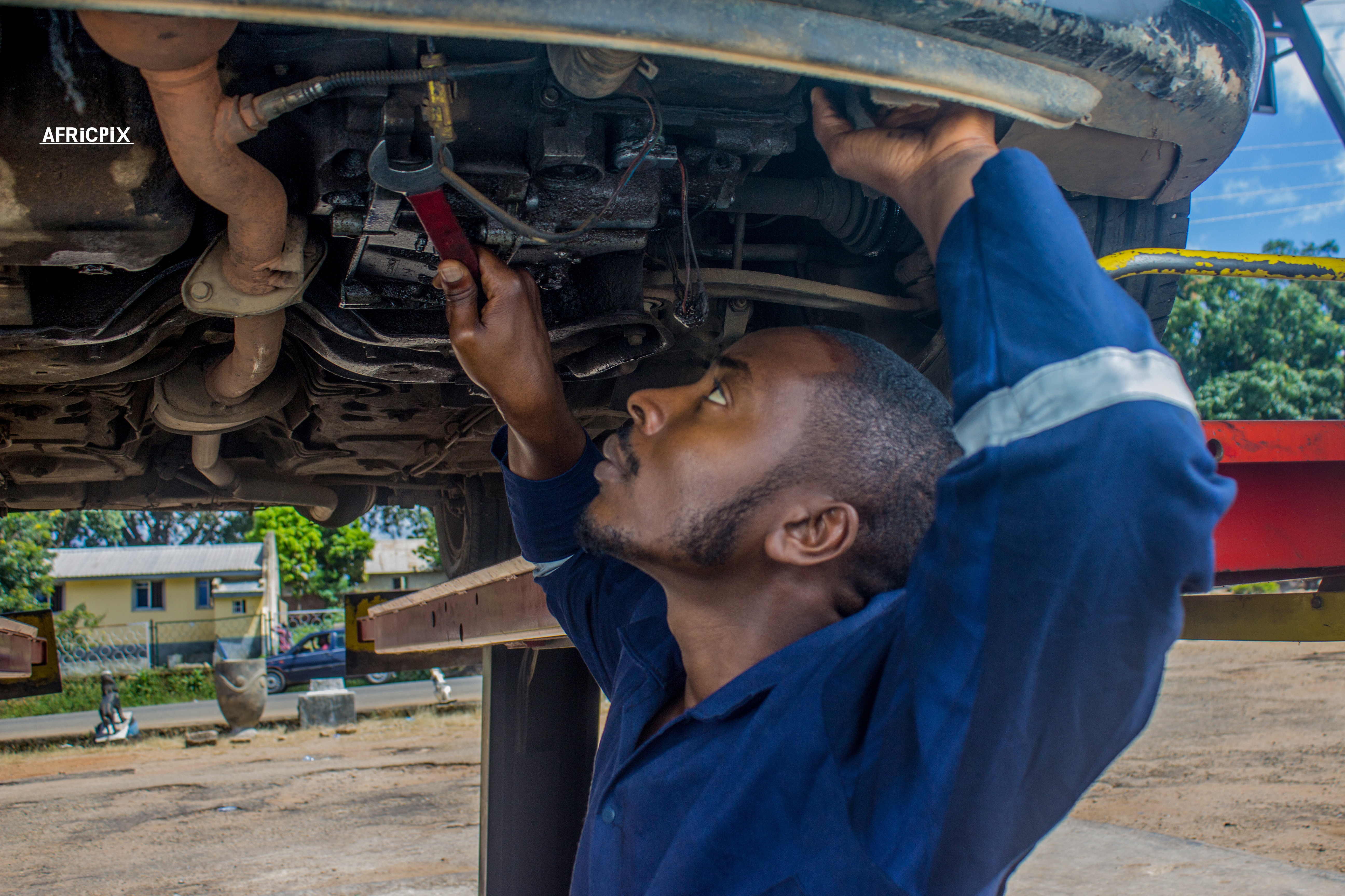 Smiling African Mechanic Under a Car While Holding a Spanner.jpg