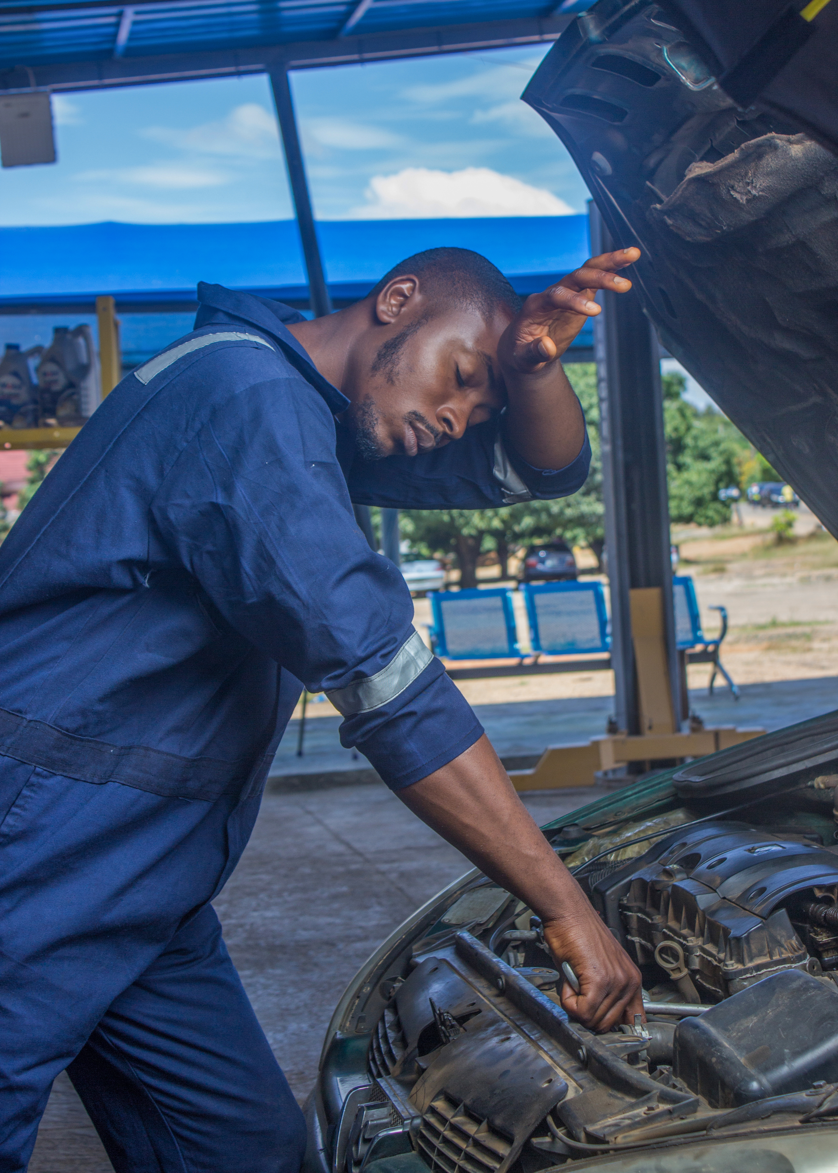 Exhausted African Mechanic Repairing Car with Hand on Head, Sweating 5.jpg