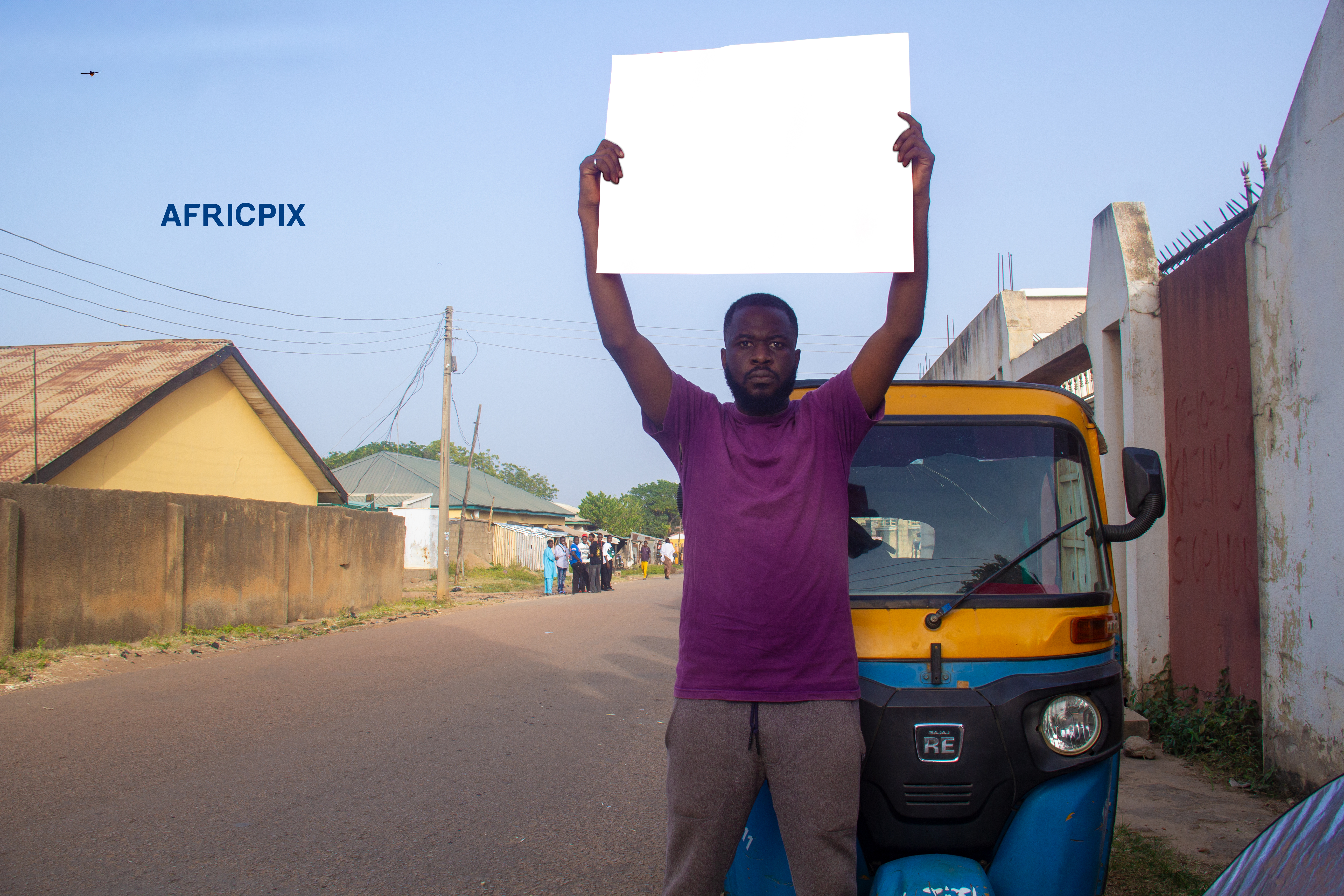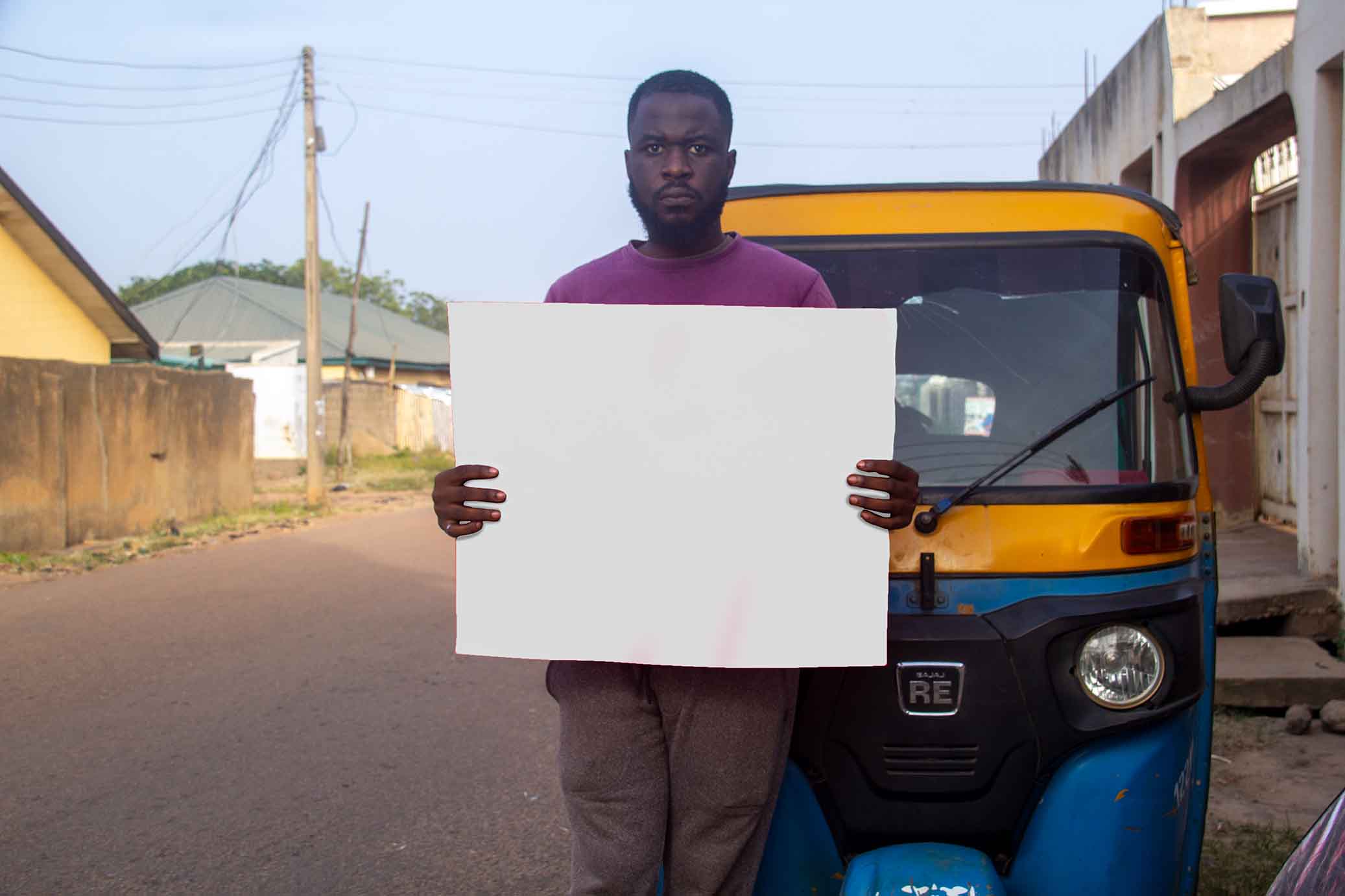 A Sad African tricycle rider, also known as Keke or Maruwa rider, standing with his tricycle behind him, holding a placard with an angry expression