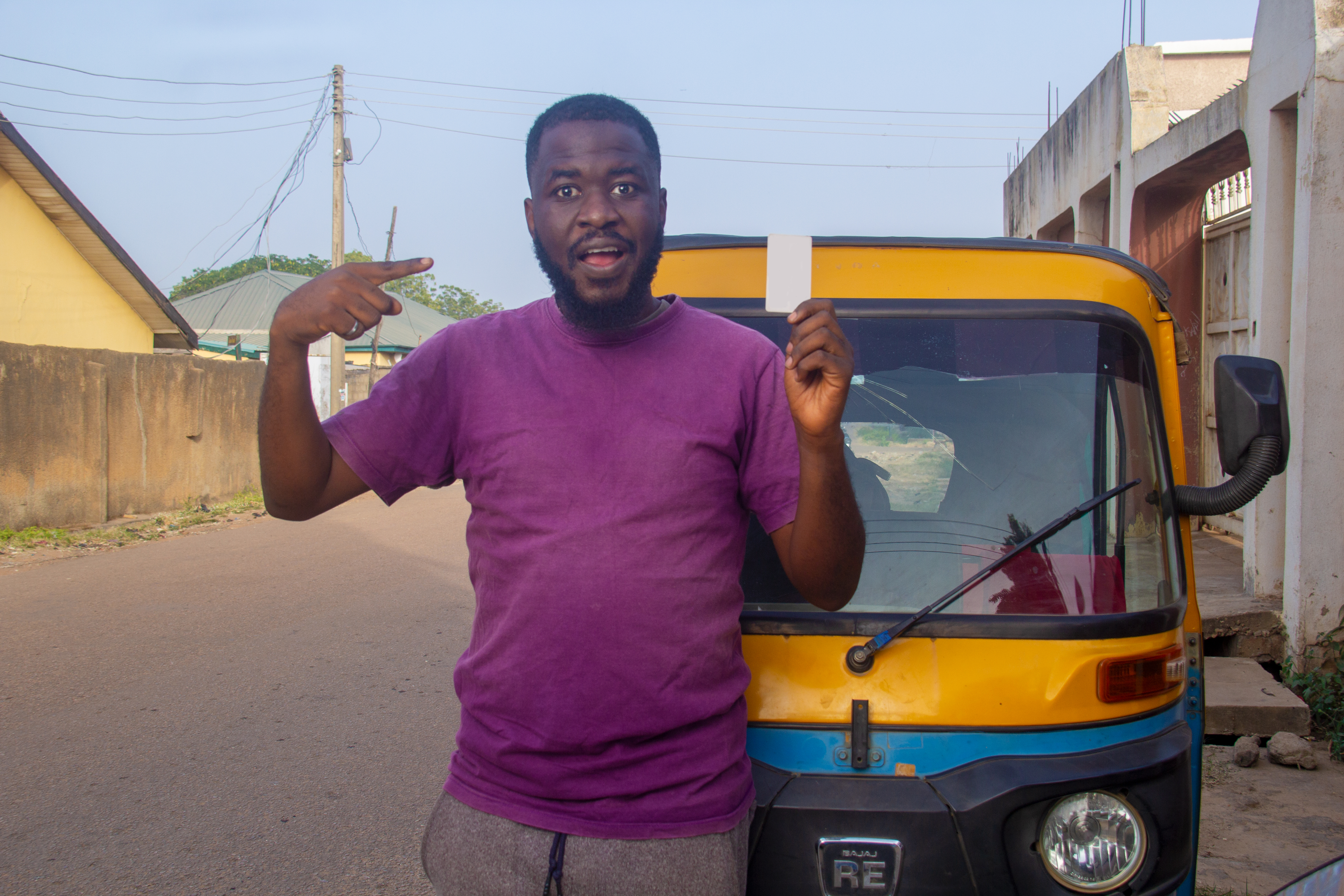 A Surprise, happy African tricycle rider, also known as Keke or Maruwa rider, standing with his tricycle behind him, pointing at debt card, ID card with a cheerful expression.2