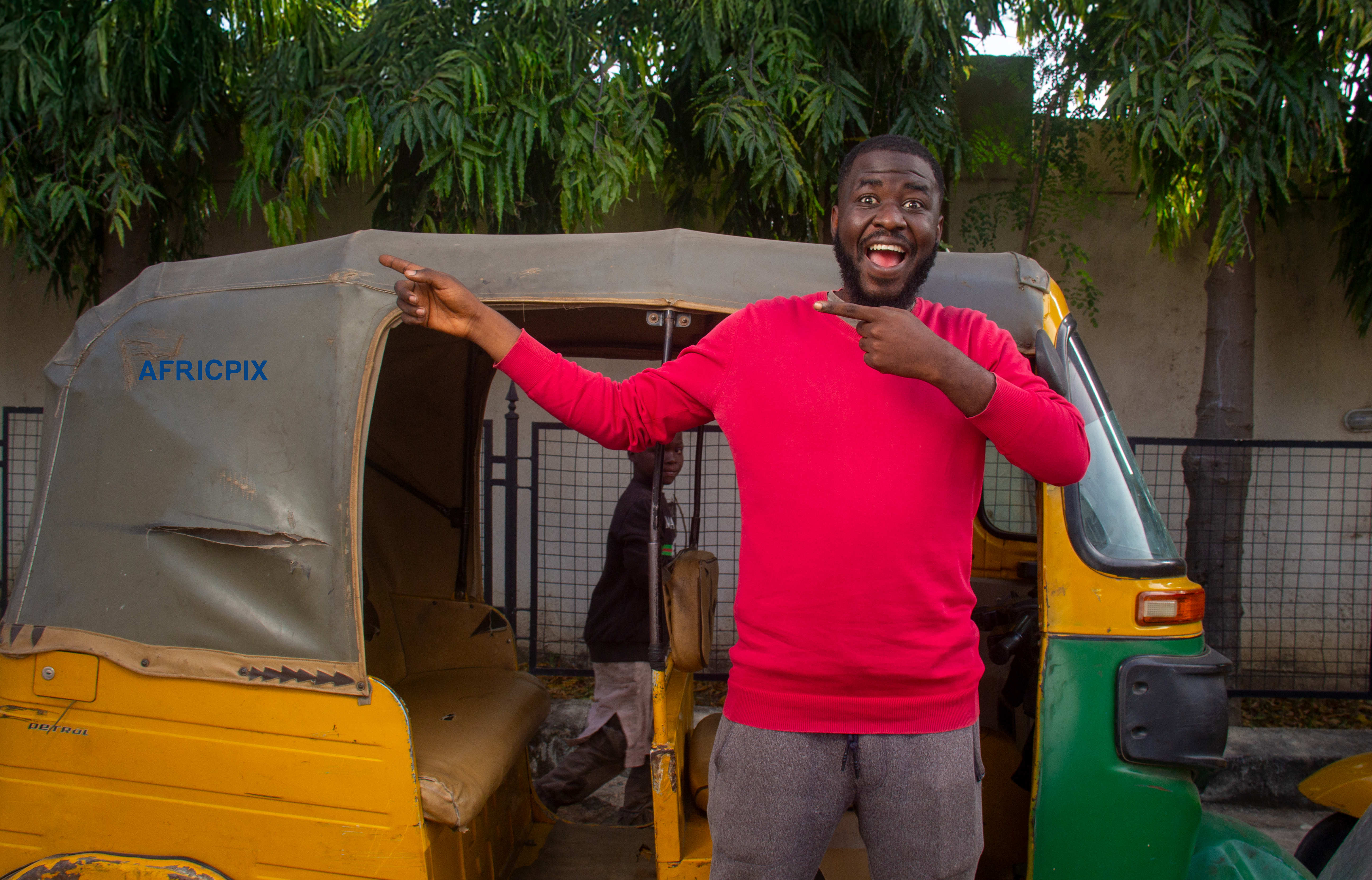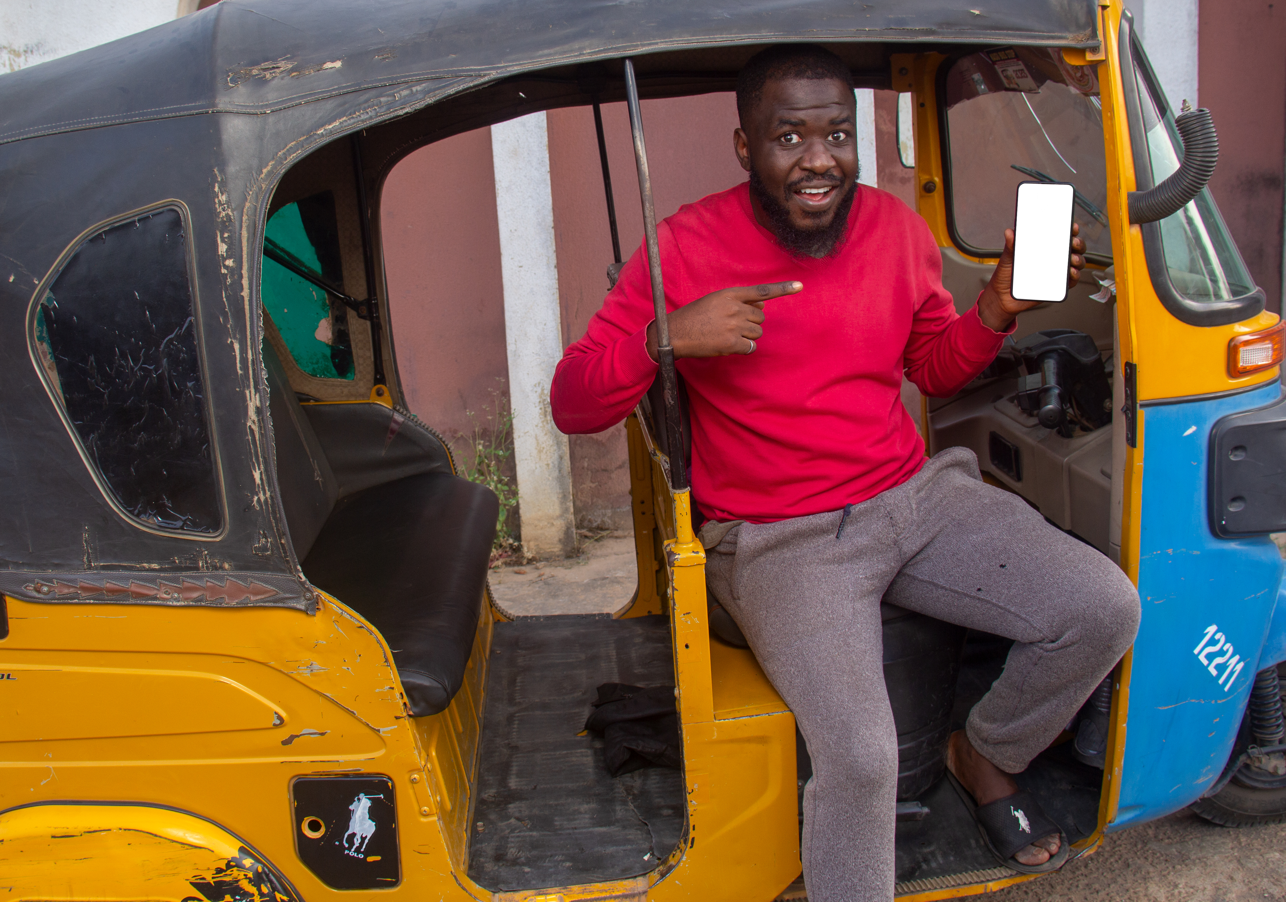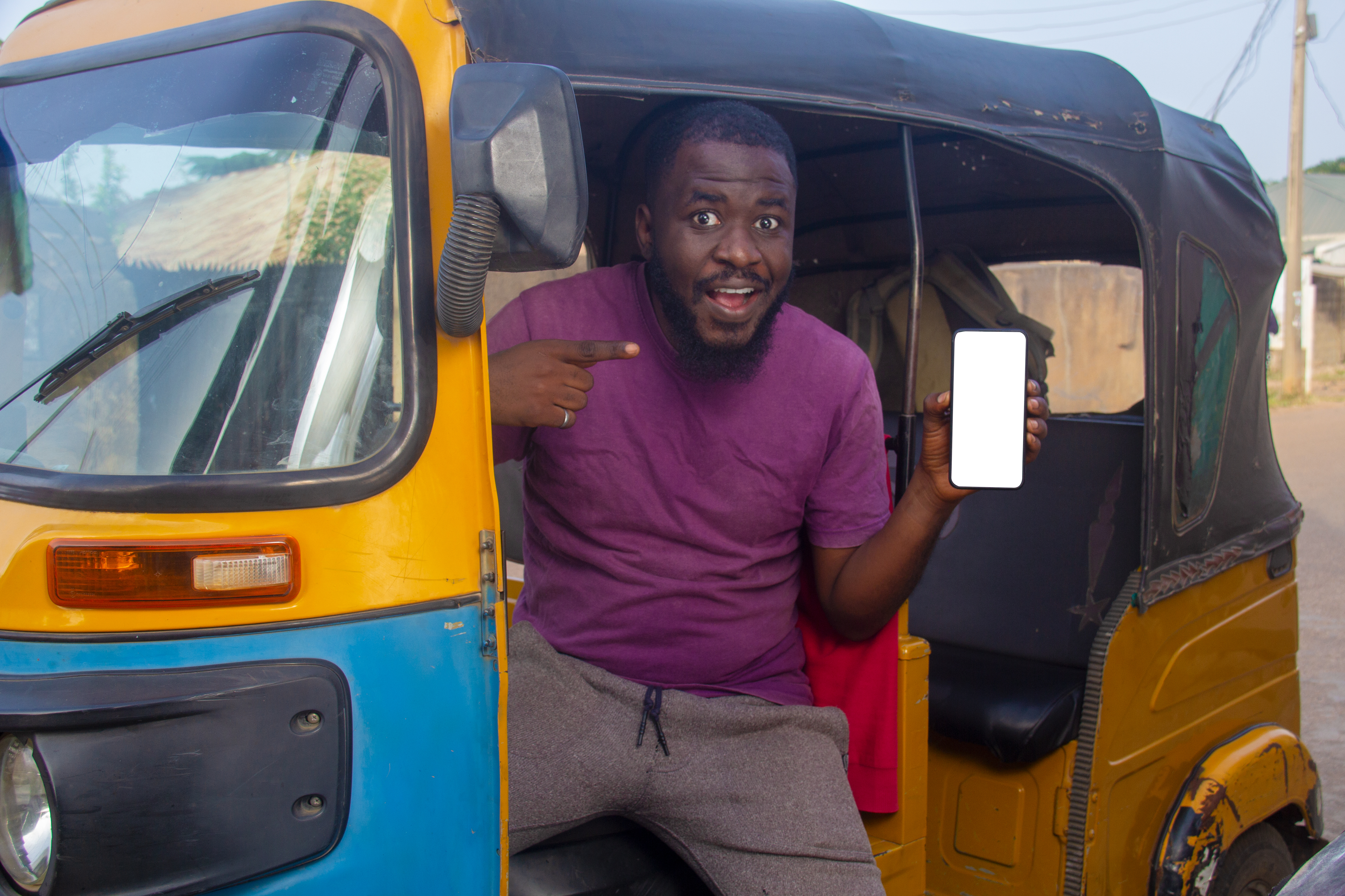 A happy African tricycle rider, also known as Keke or Maruwa, Keke rider, sitting in a tricycle  pointing at his phone