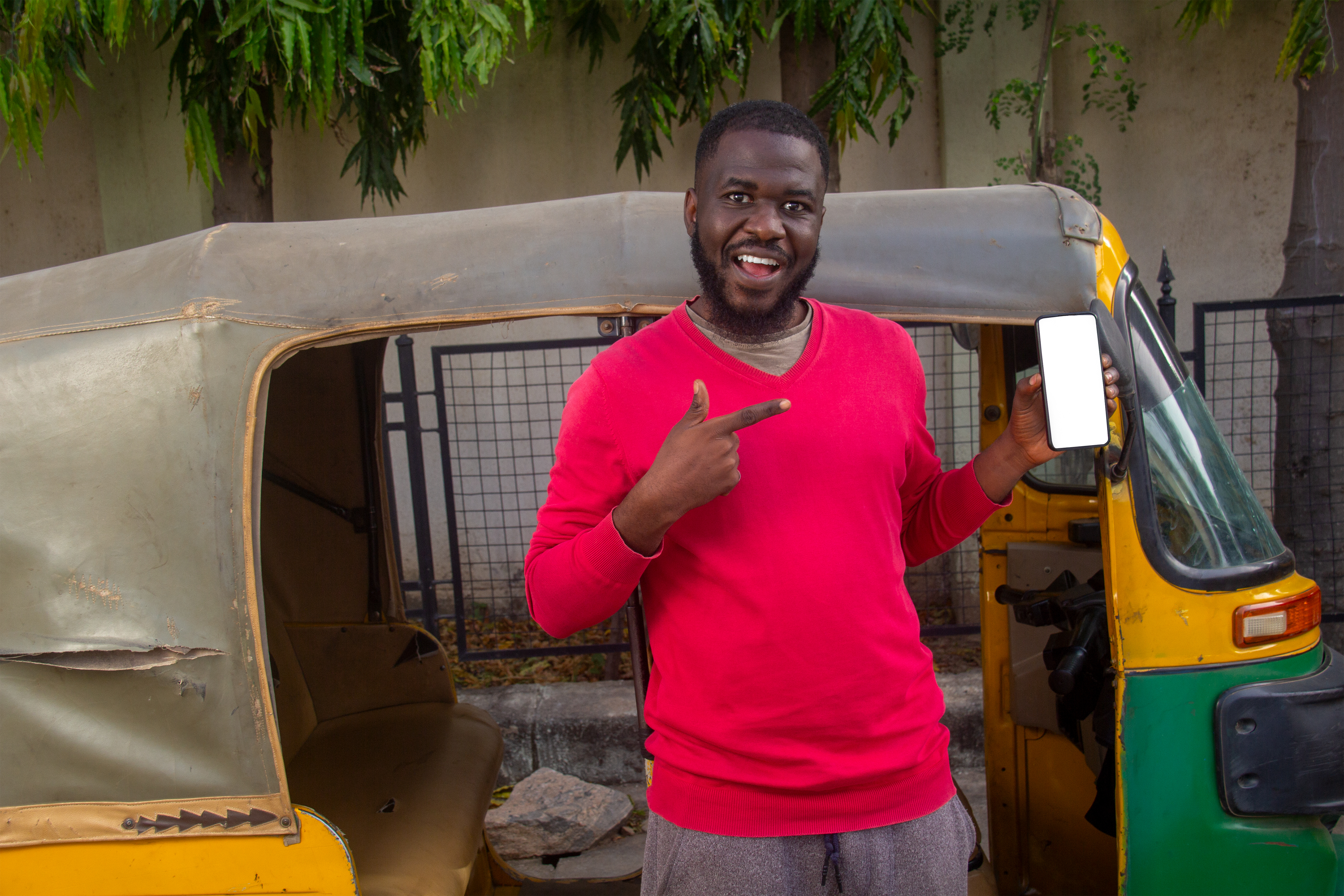 A happy African tricycle rider, also known as Keke or Maruwa, Keke rider, standing with his tricycle behind him, His is pointing at his phone.