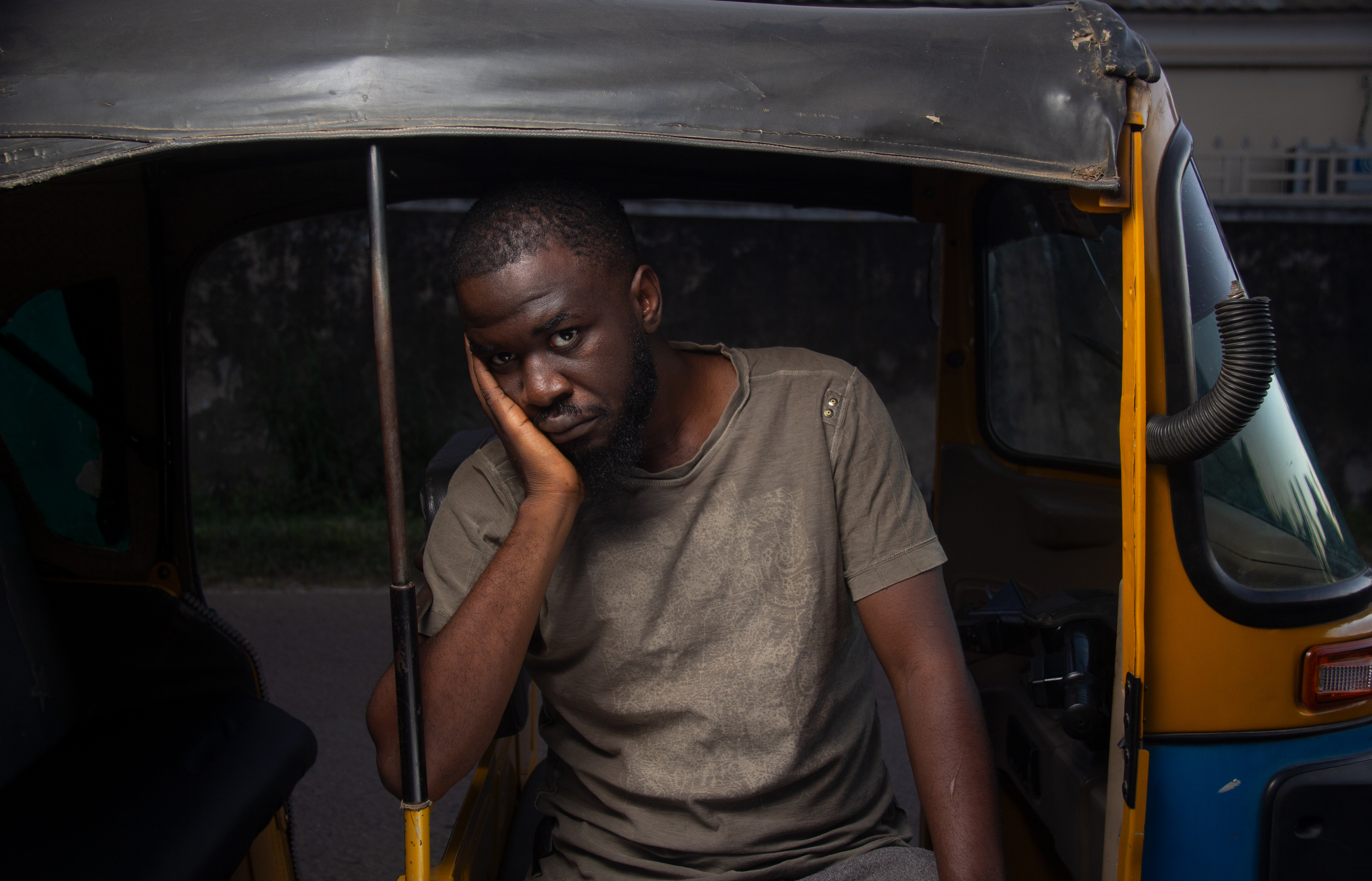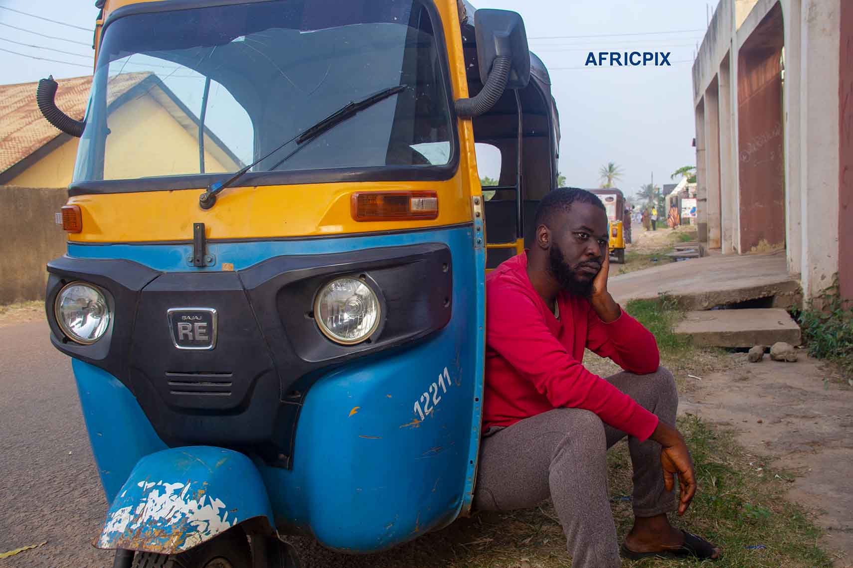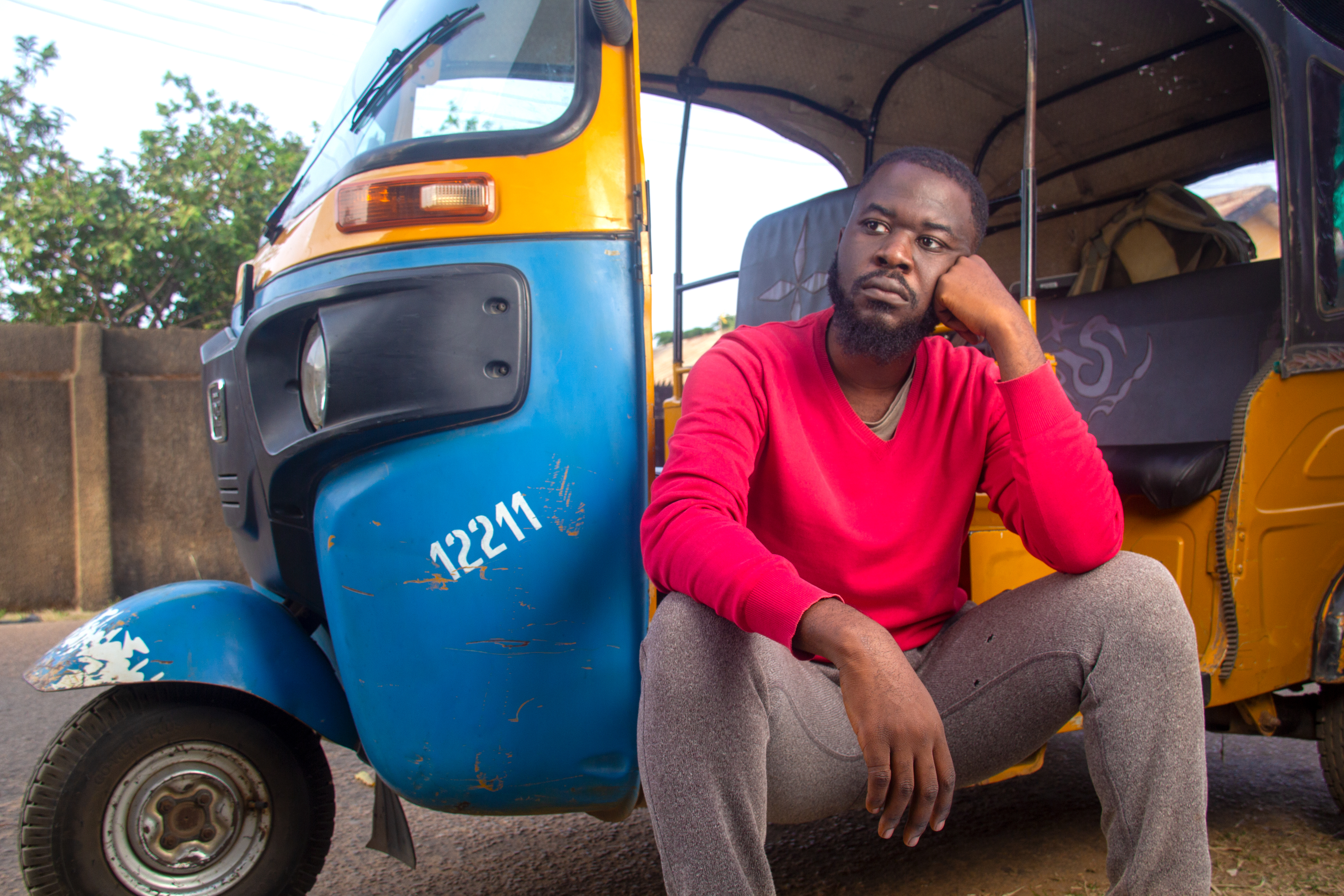 A sad and worried African man sitting in a tricycle with his hand on his cheek, looking worried.