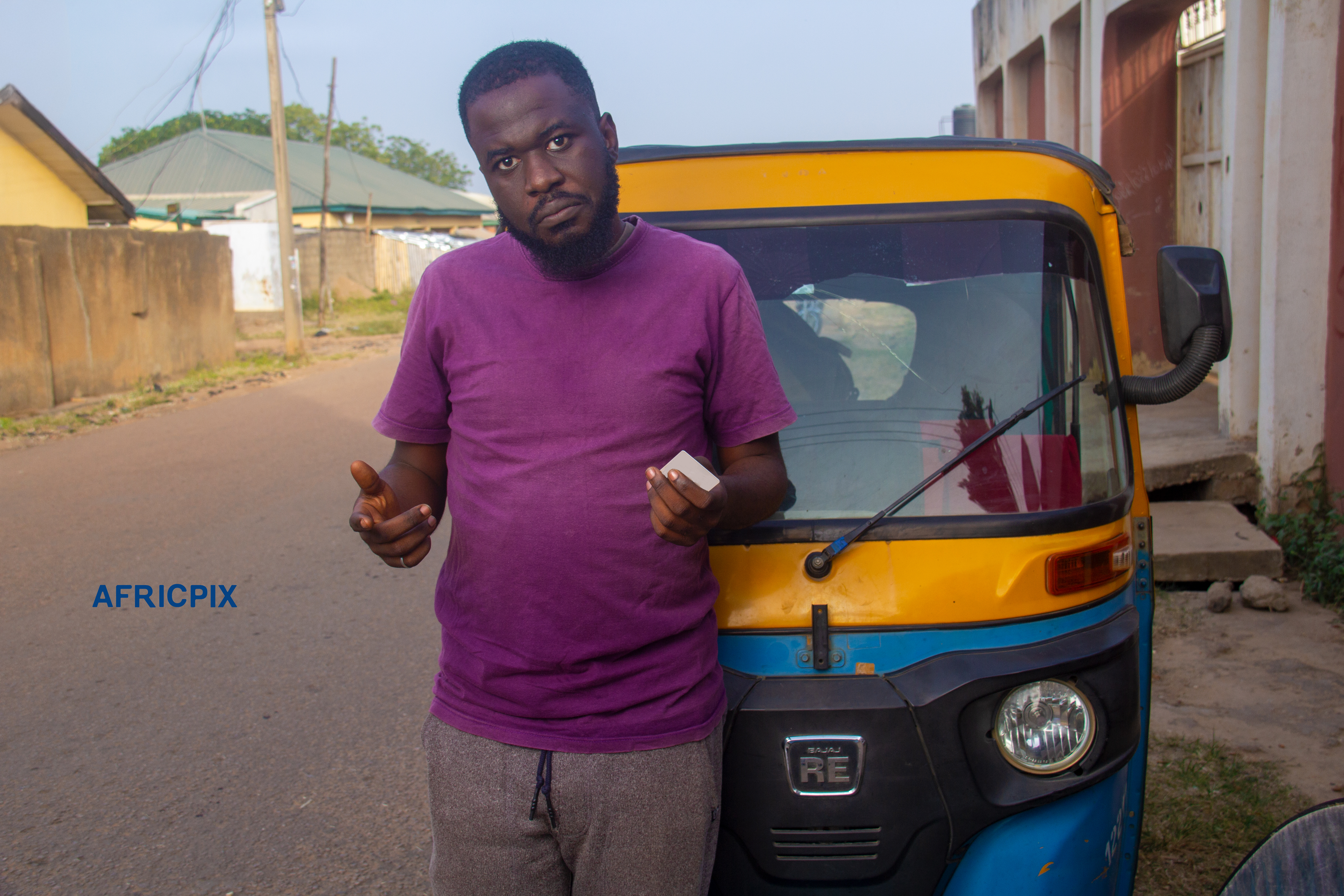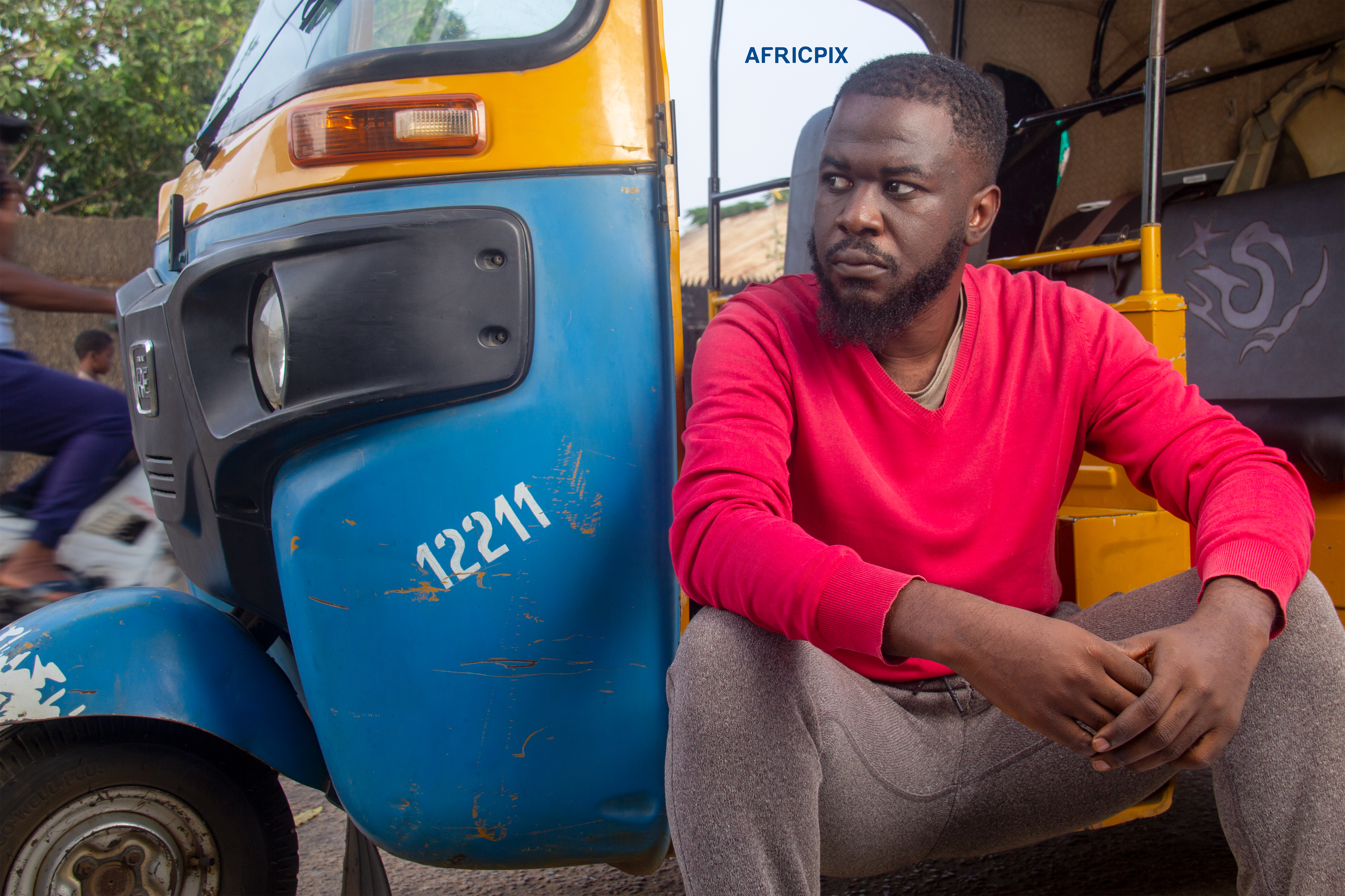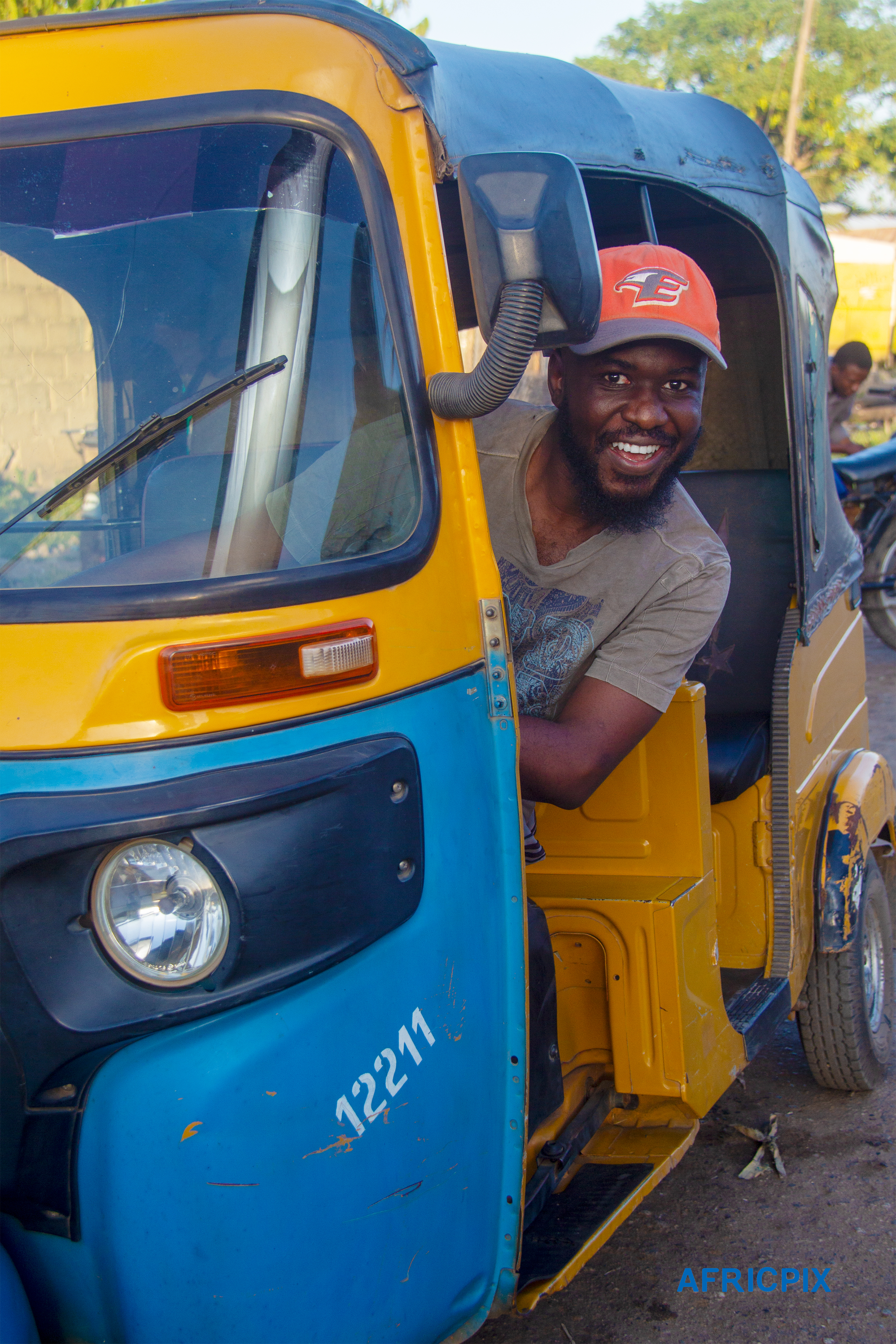 A  African tricycle rider, also known as Keke or Maruwa sitting  behind of his tricycle