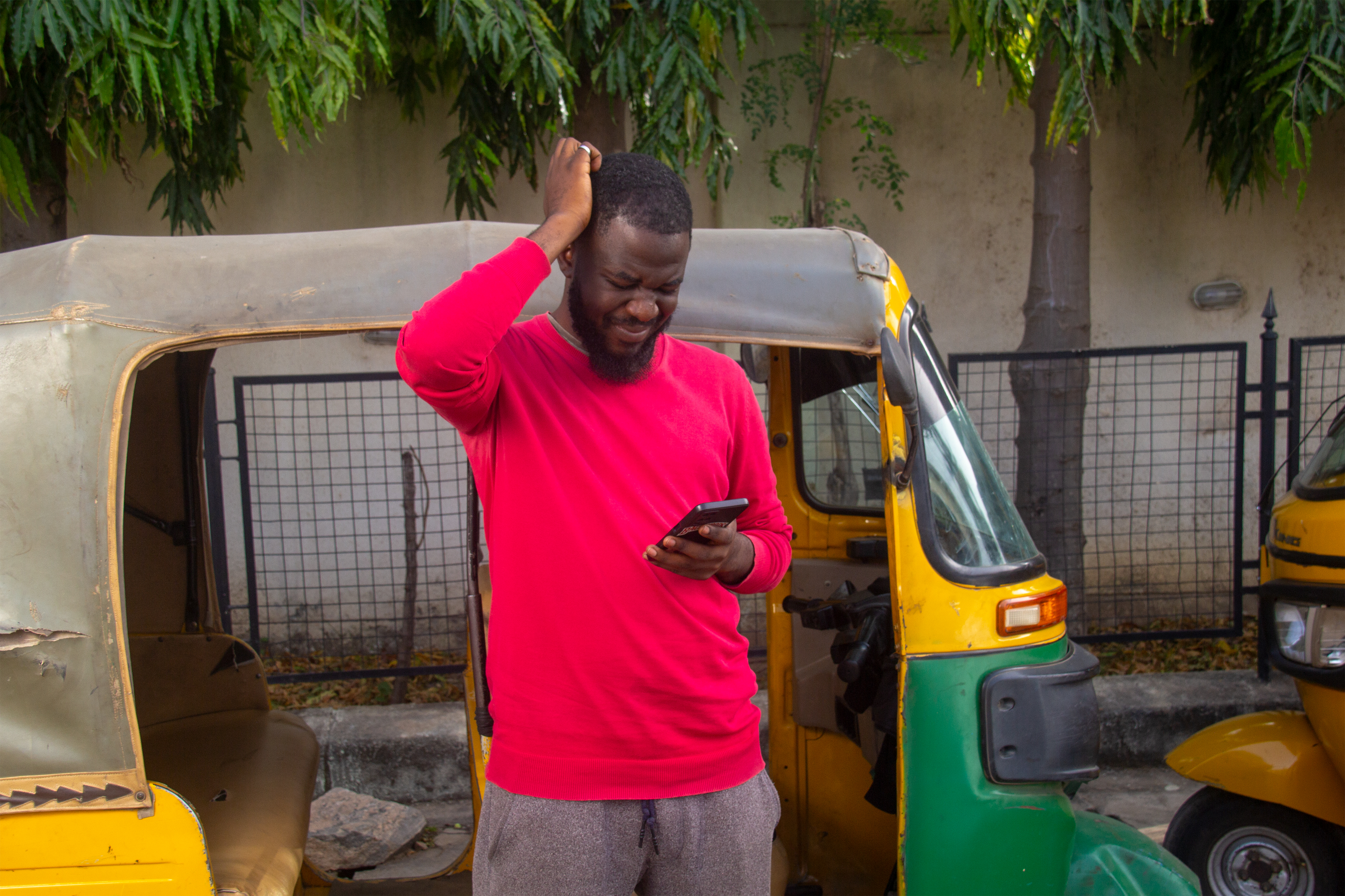 A confuse African tricycle rider standing with his tricycle, Keke, Maruwa behind him, happy, looking confused, hand on his head, while his holding his phone