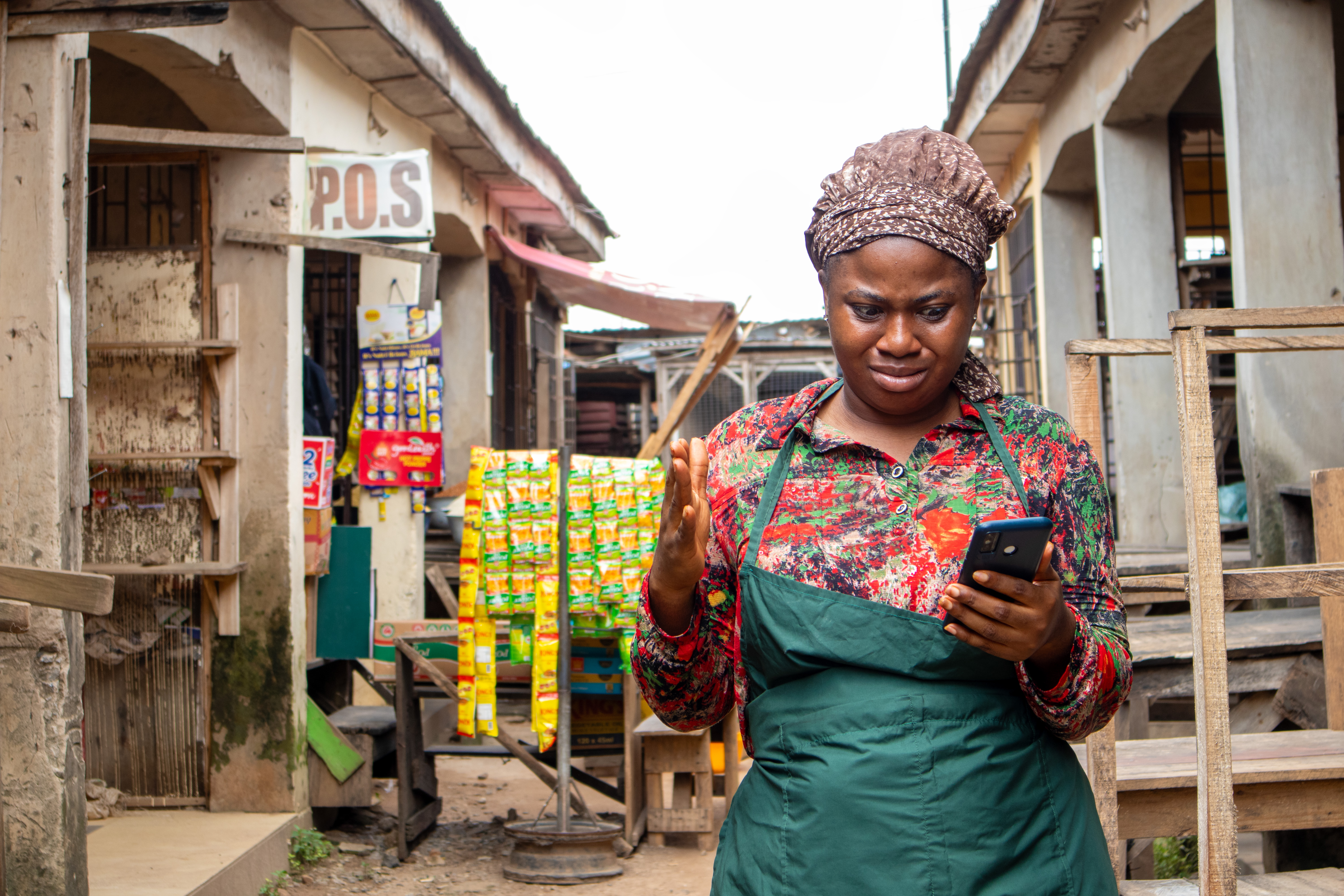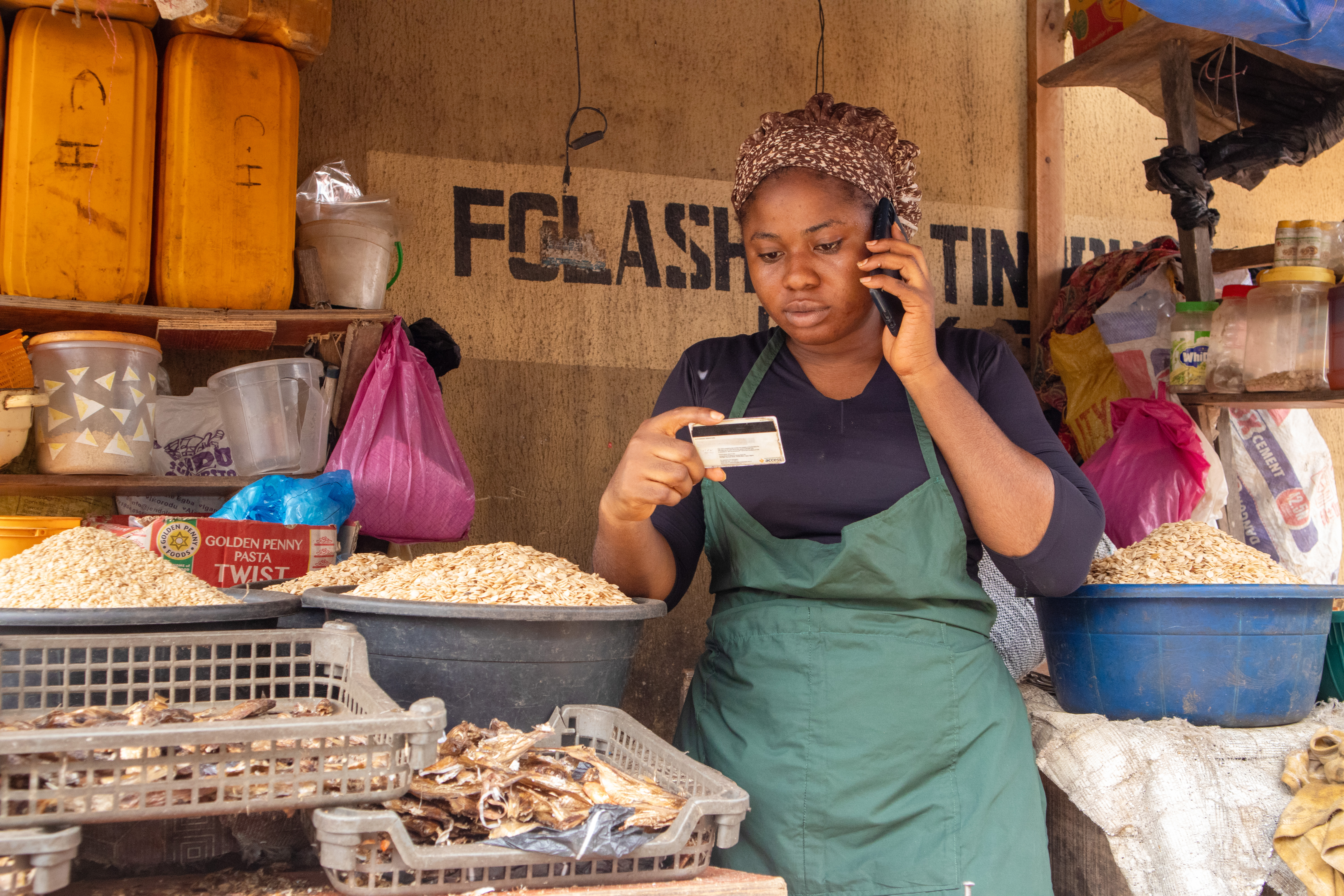 Happy Market Woman Making a Call While Referencing ATM Numbers