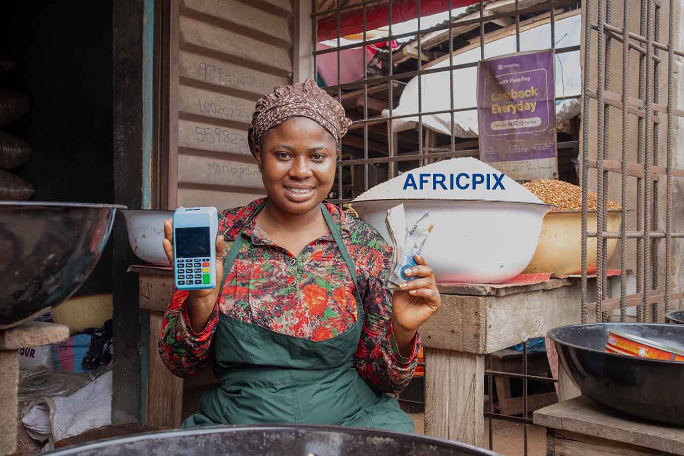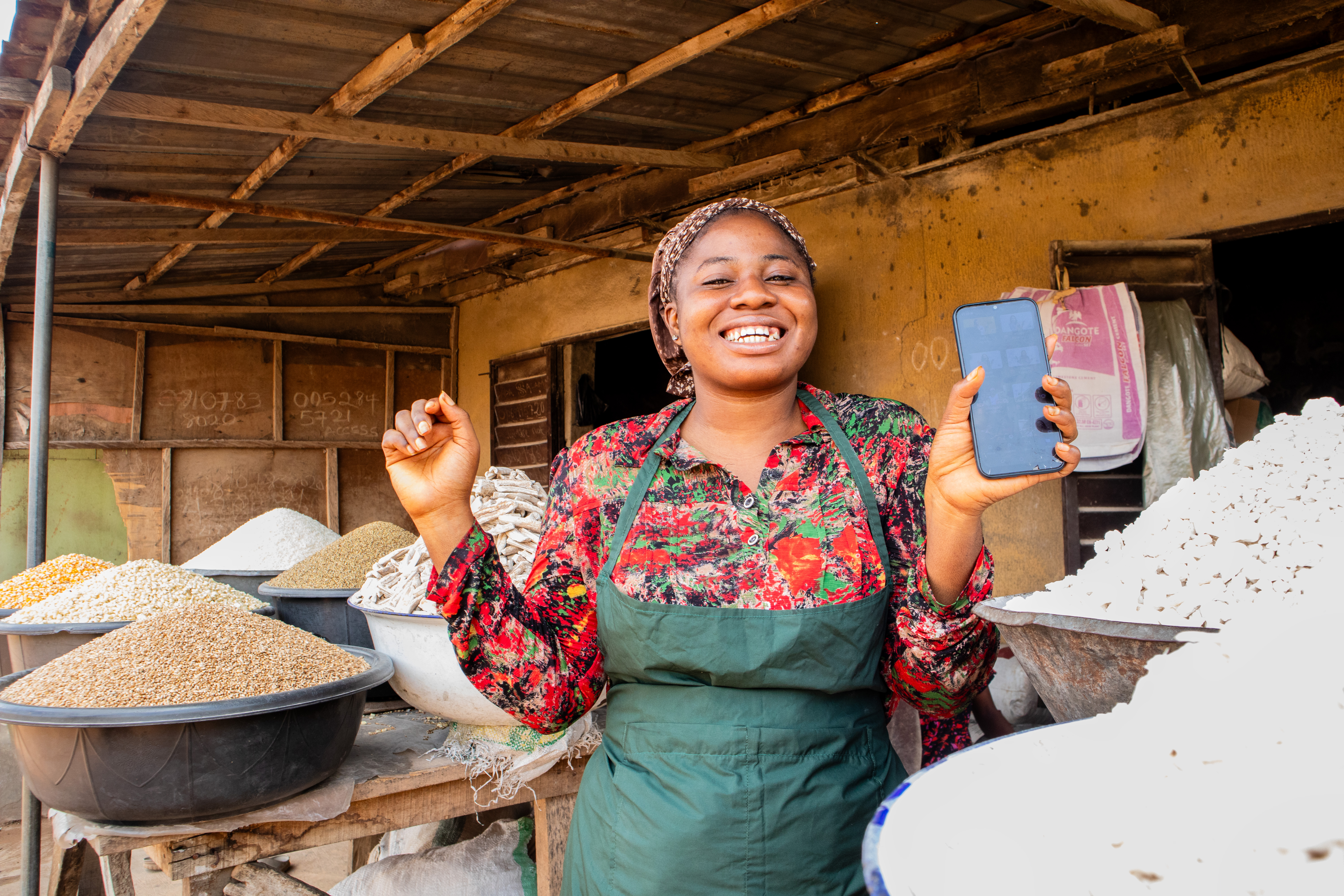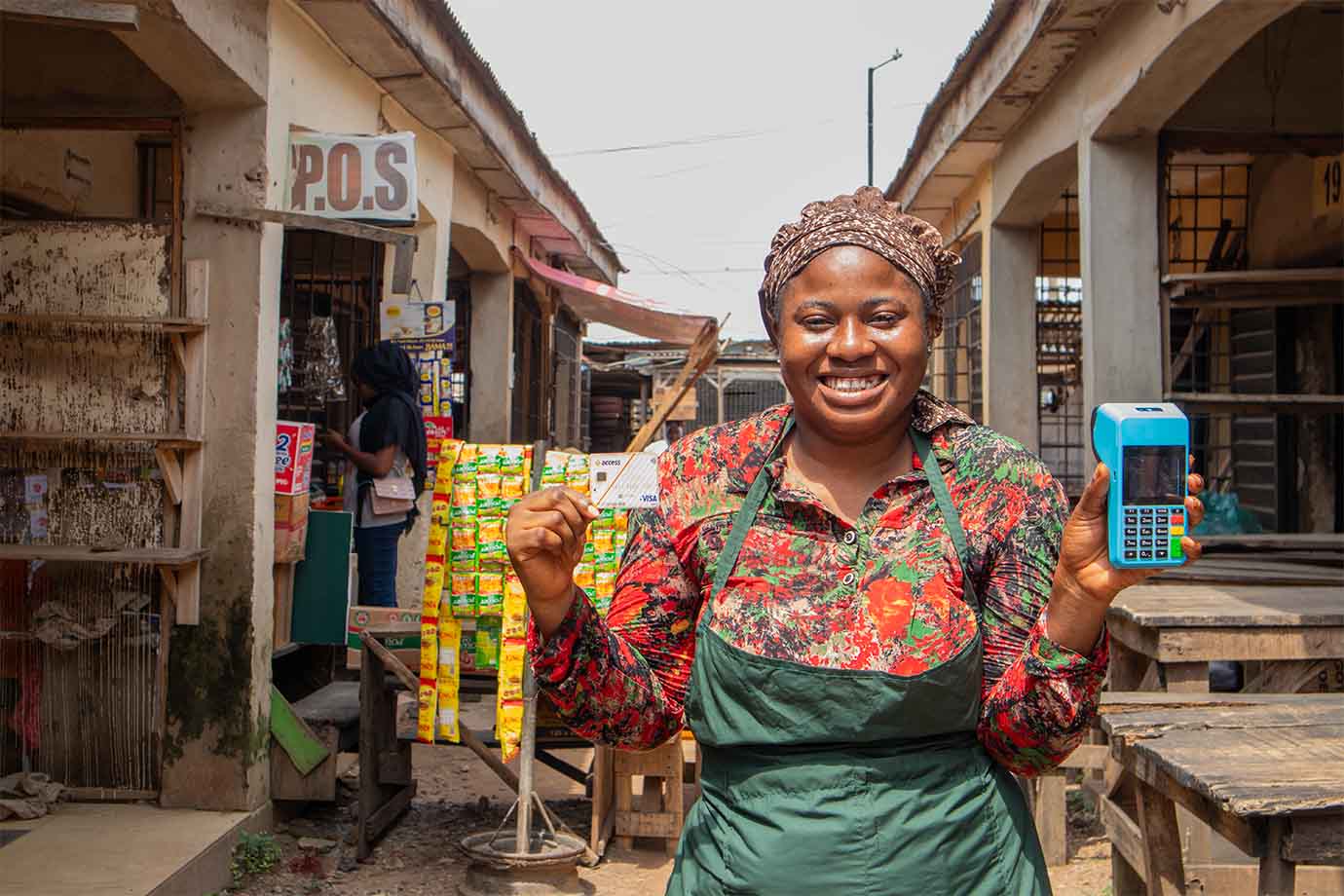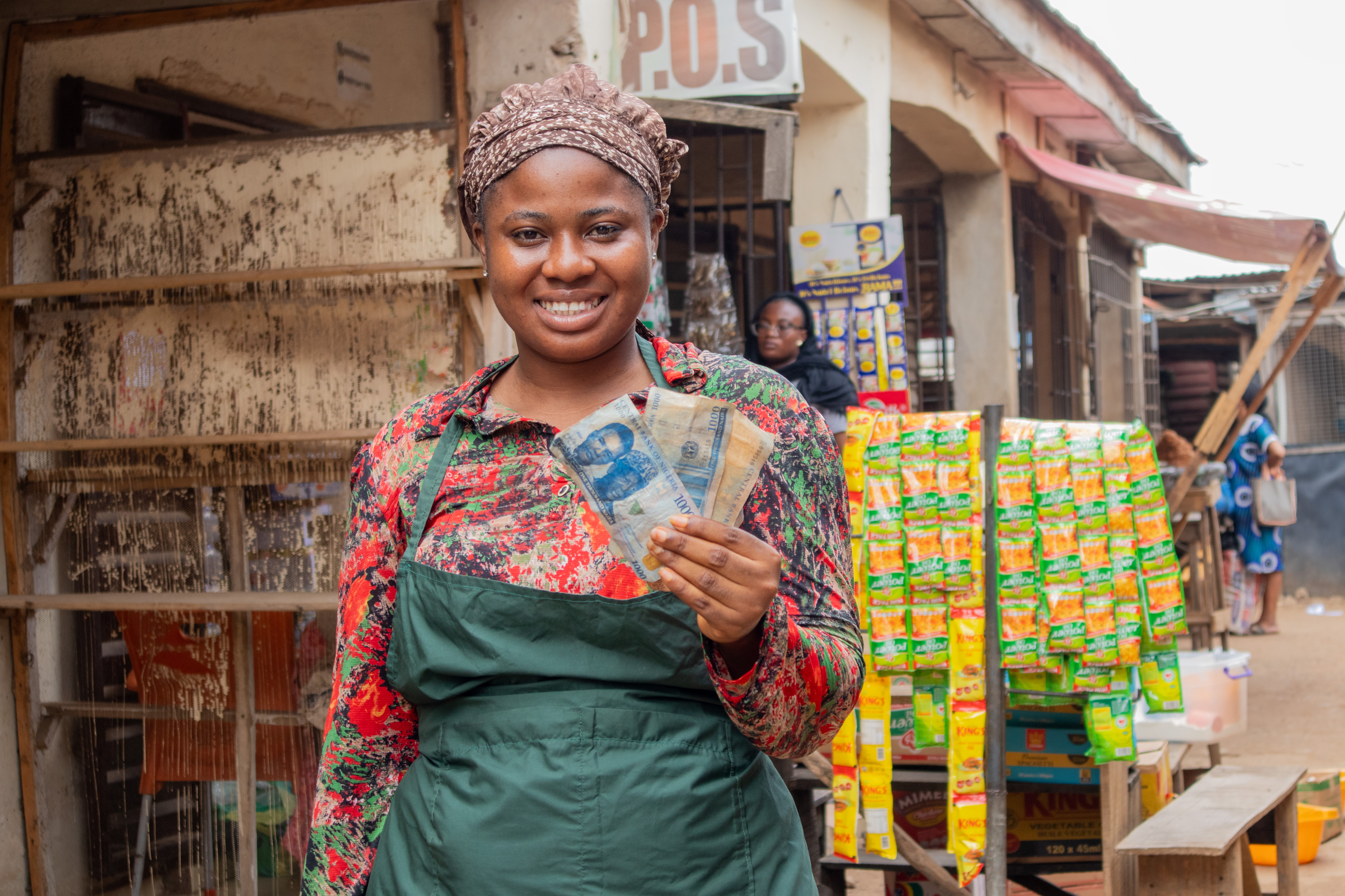 Joyful African Woman Holding Naira and POS Terminal in Front of Her Shop