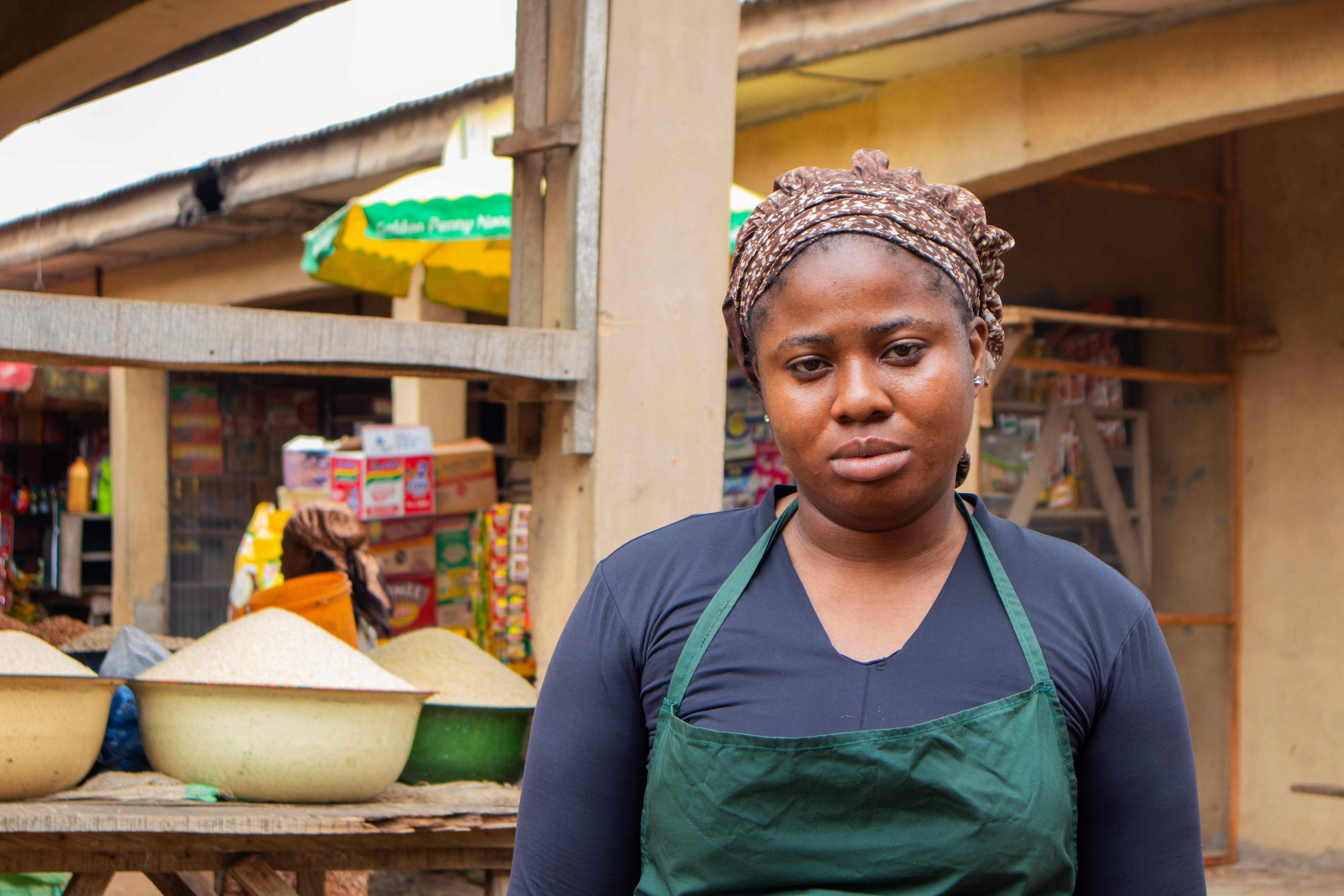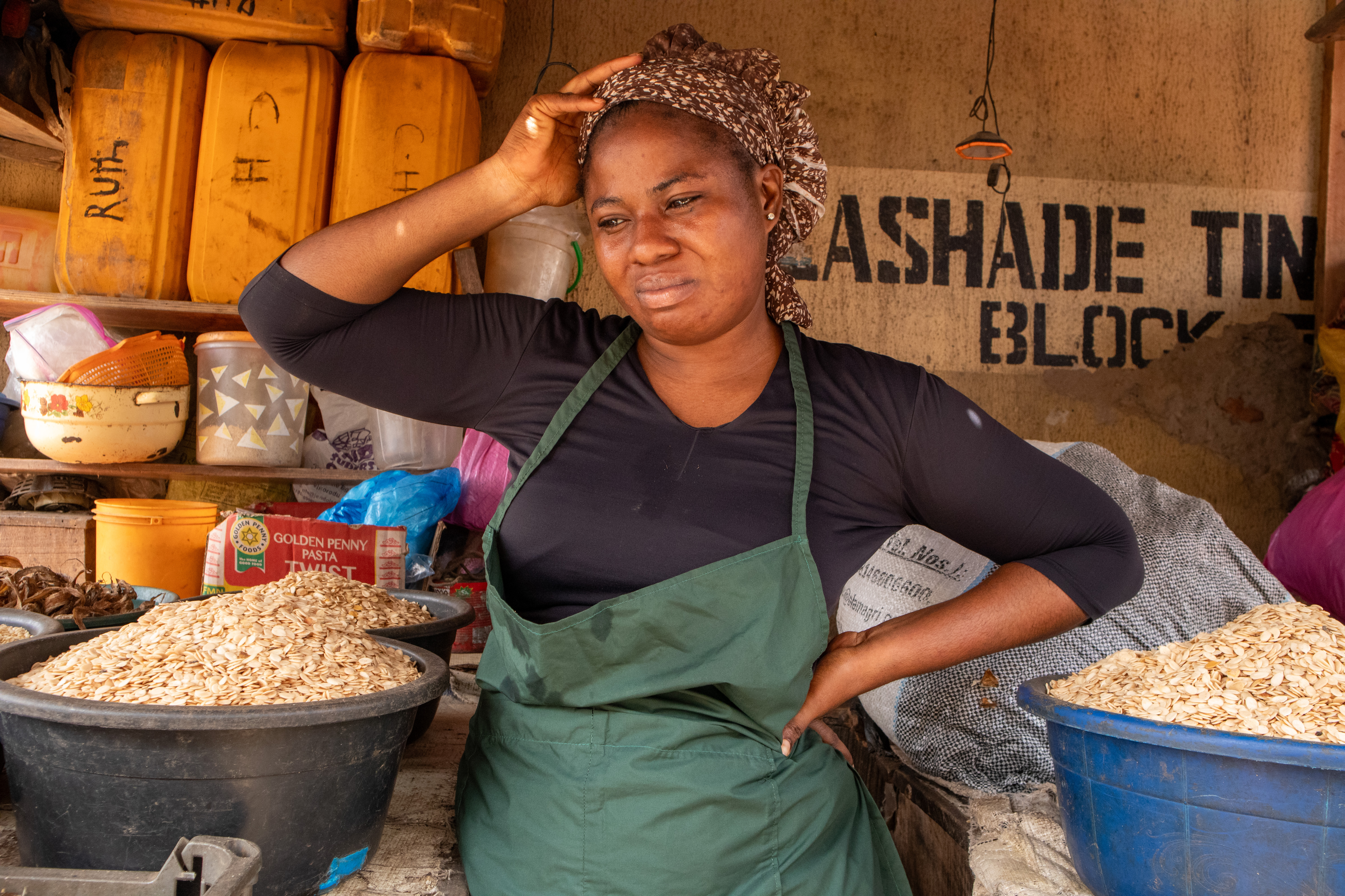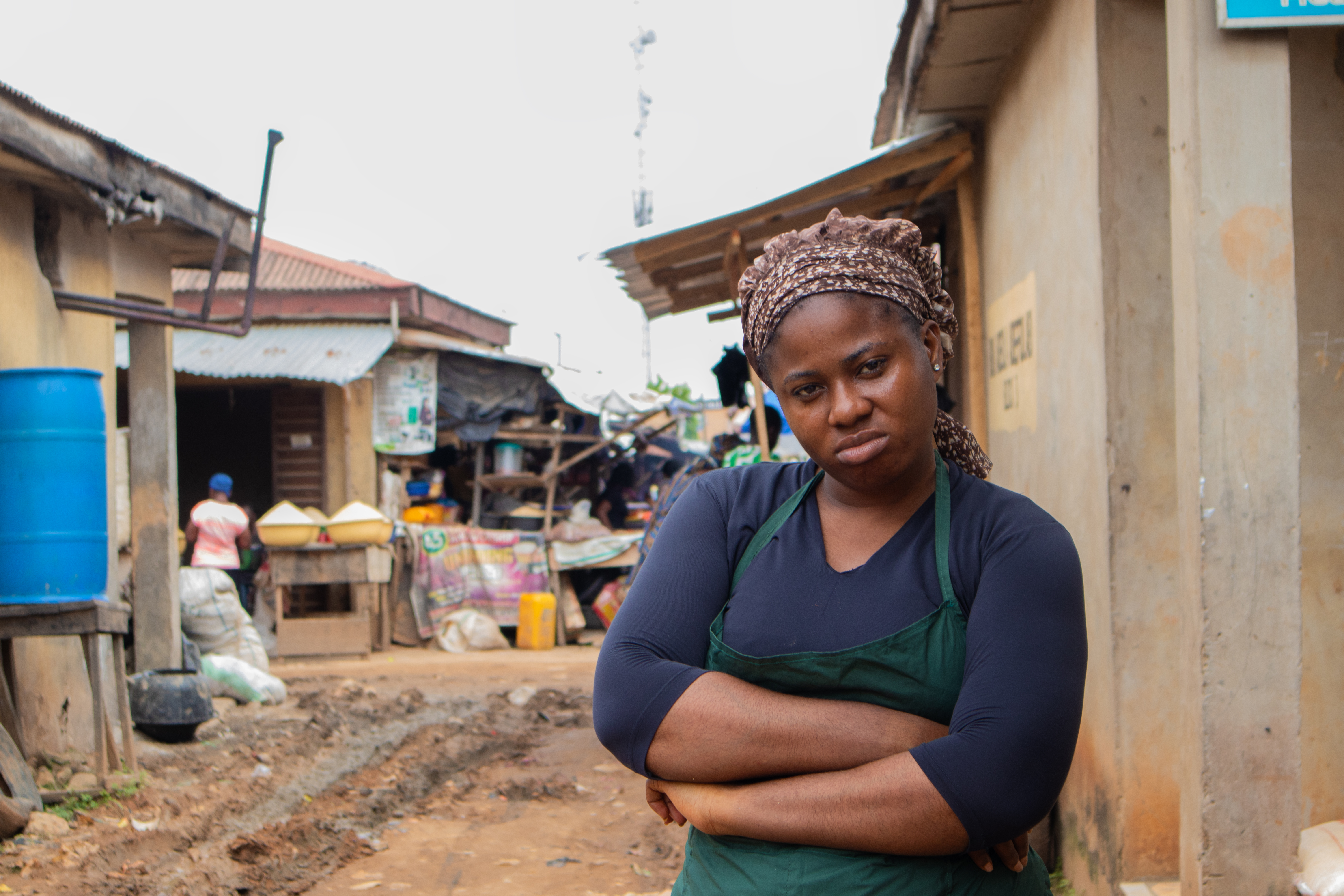 Concerned African Woman Reflecting on Challenges Outside Local Shop