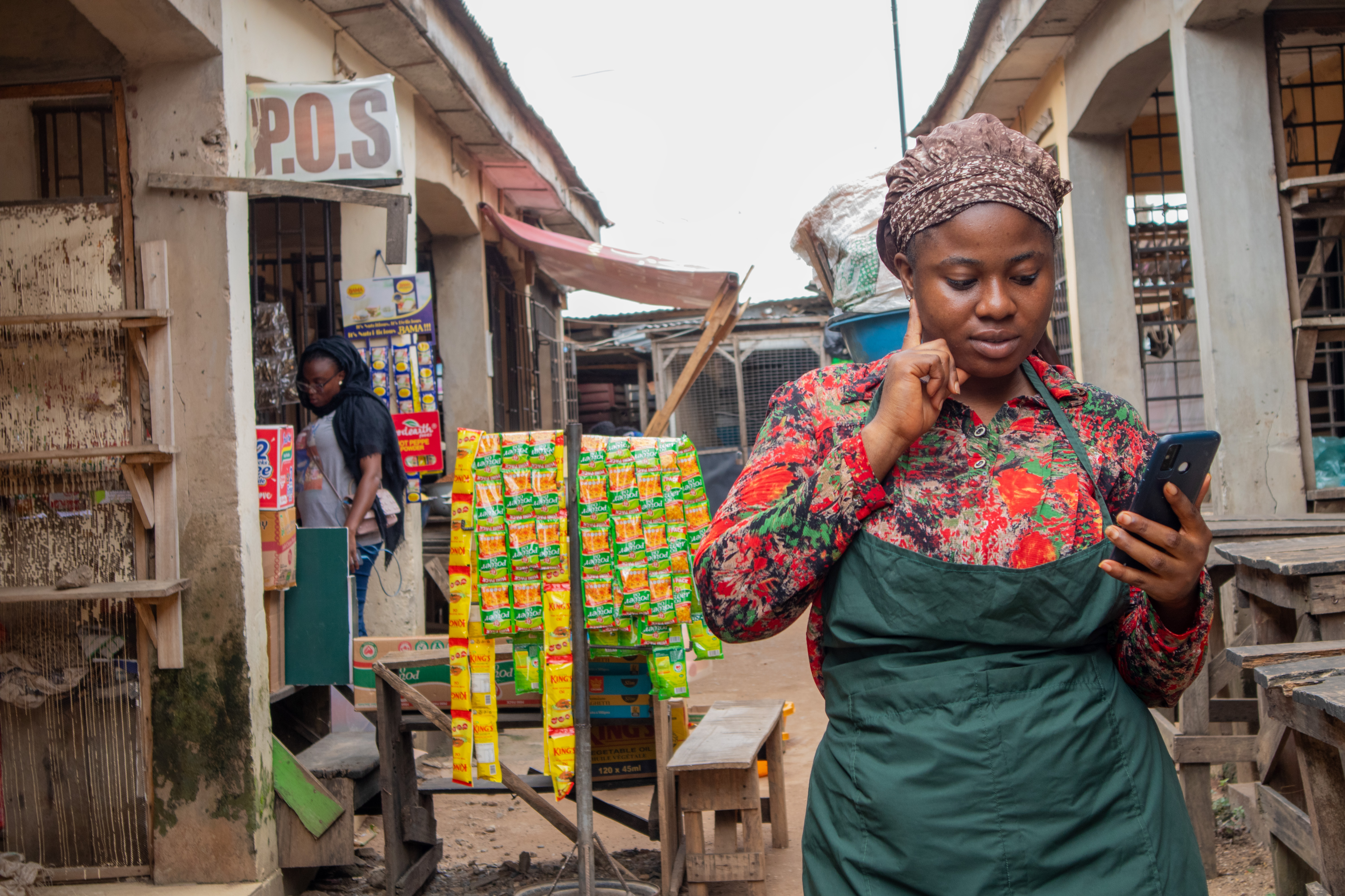 Contemplative African Market Woman Holding Phone in Front of Her Shop
