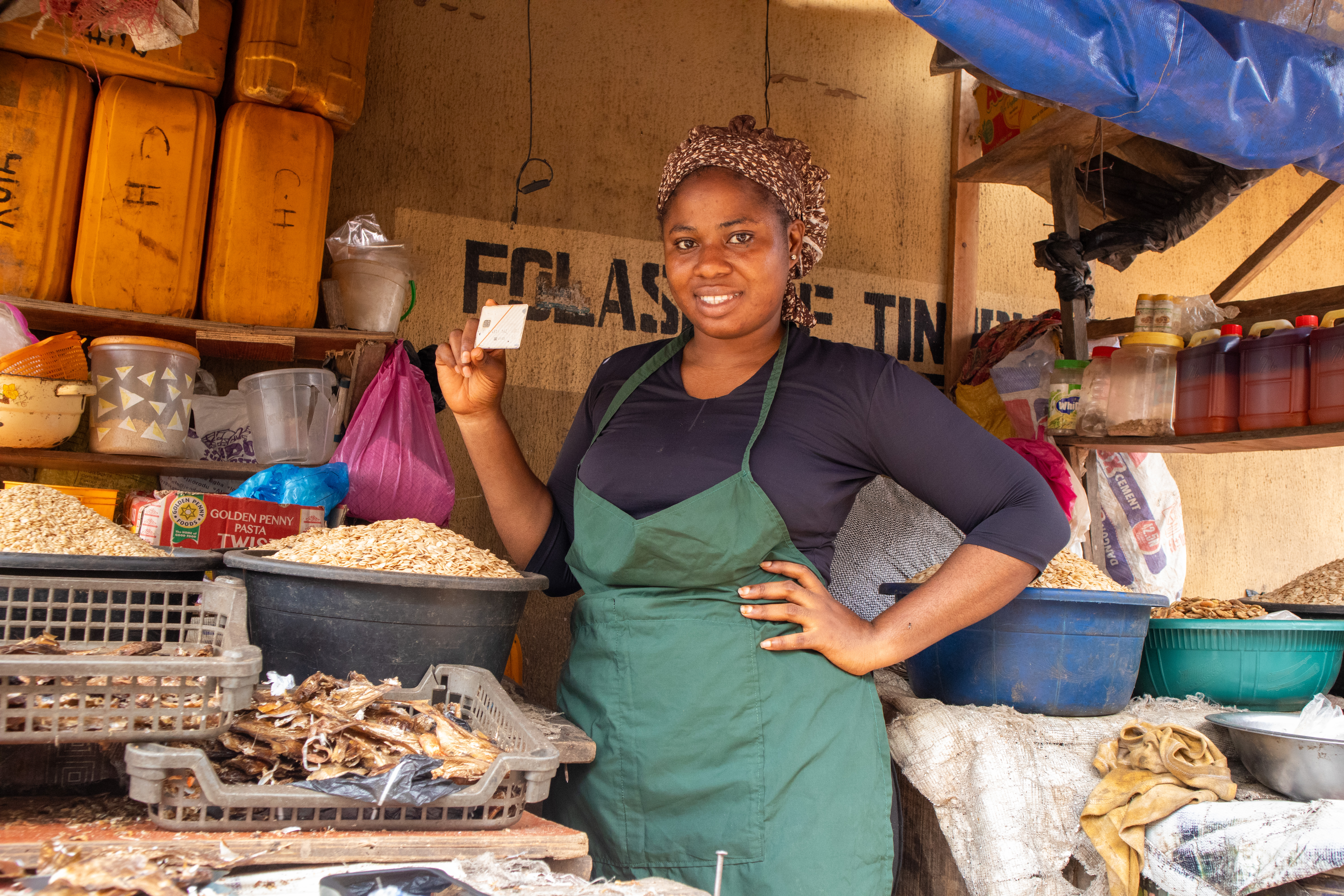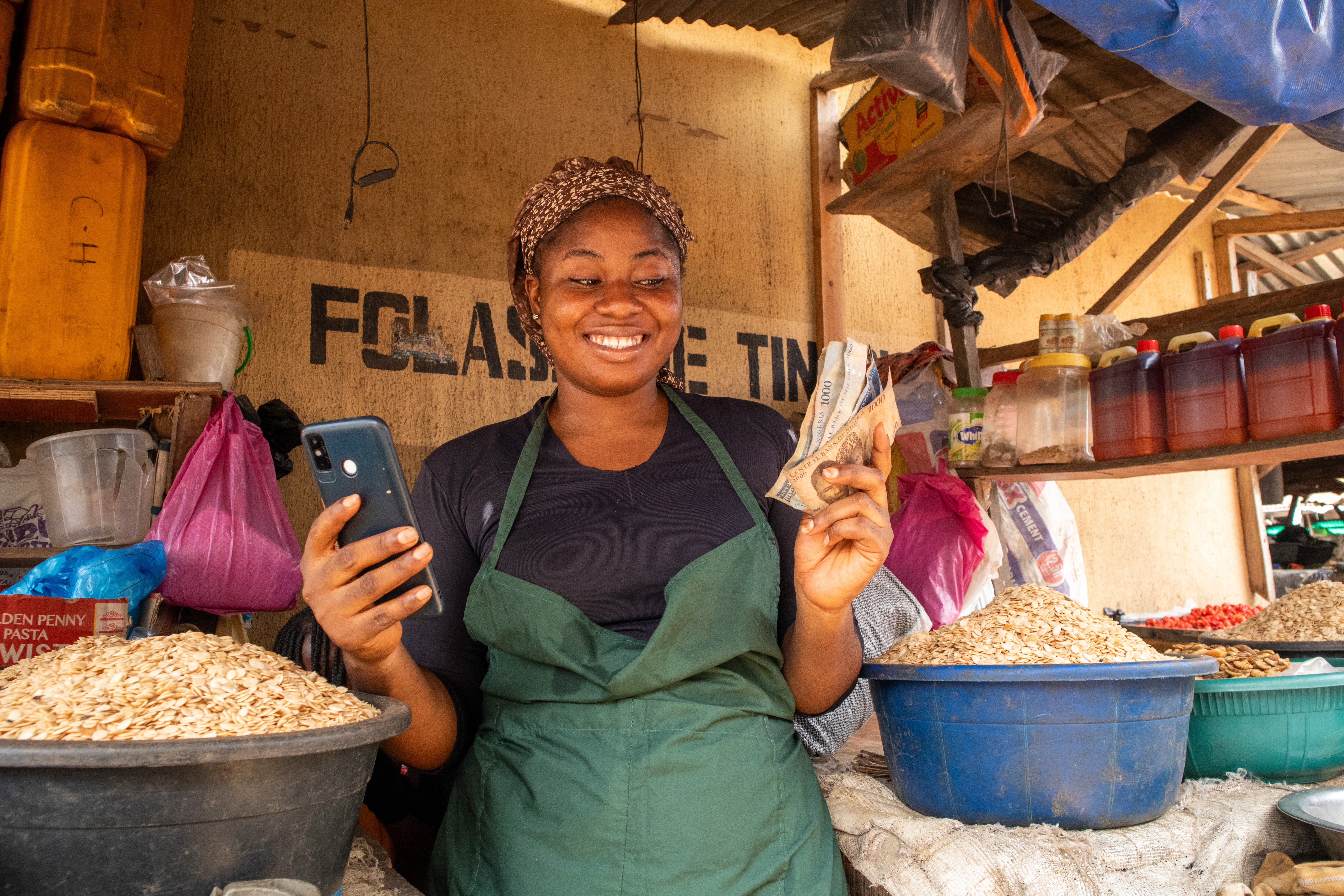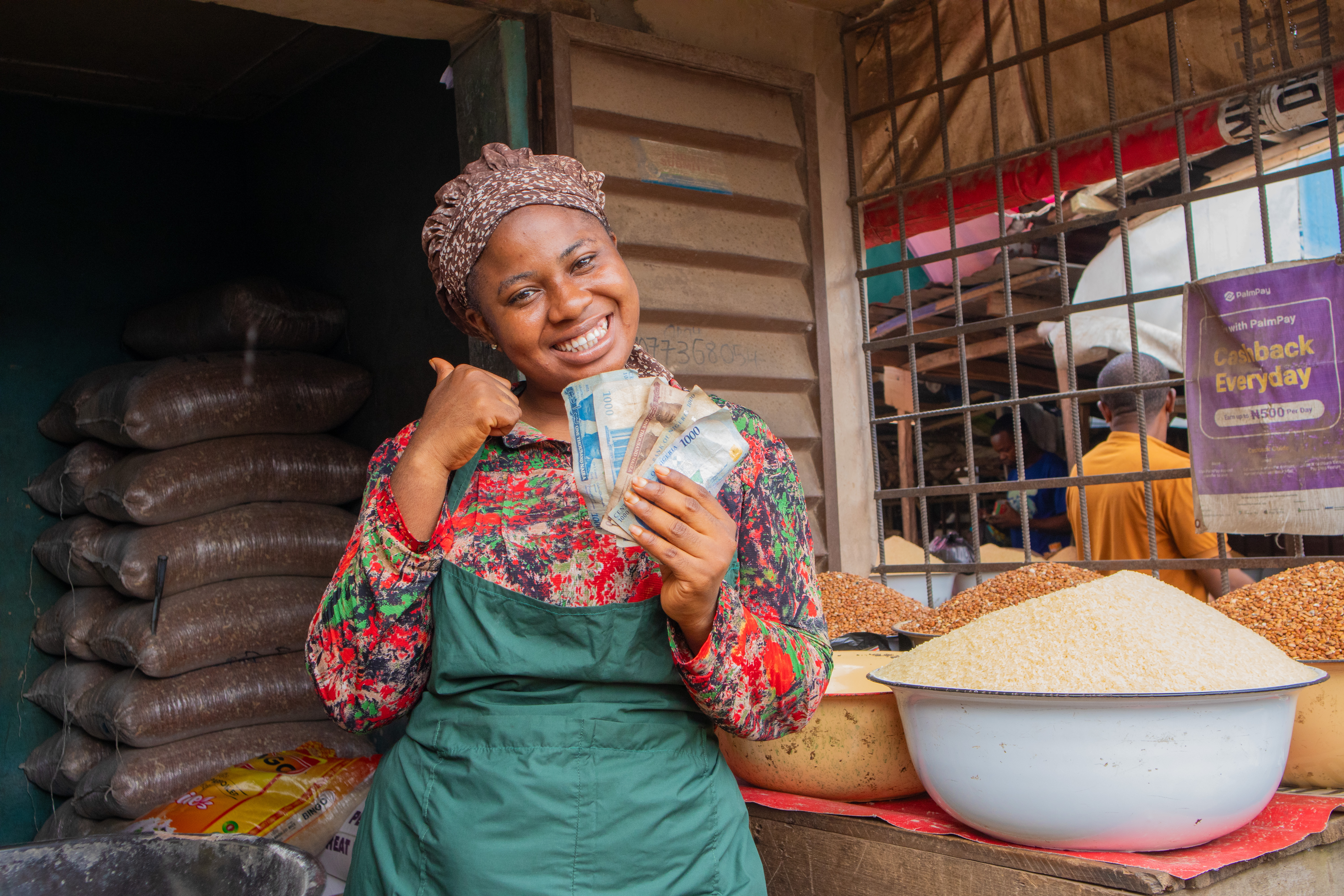 Happy Market Woman Holding Naira Note and POS Machine in Front of Her Shop